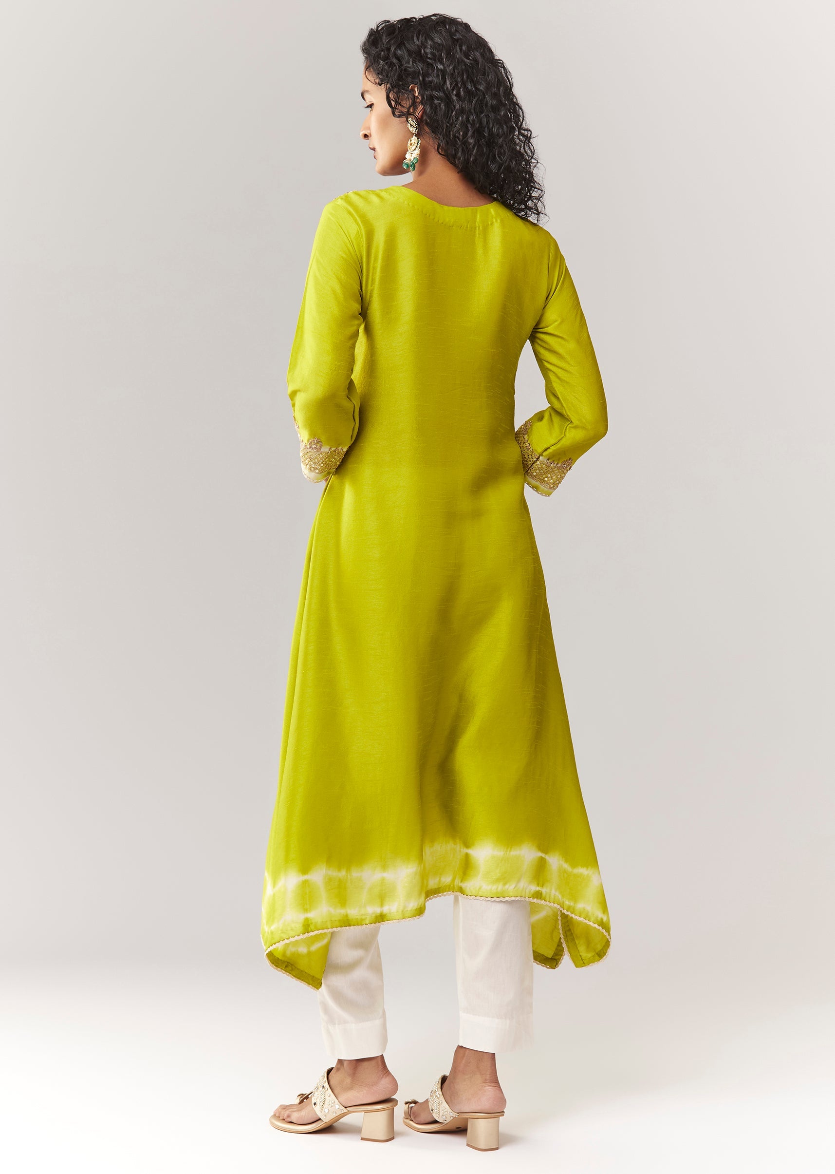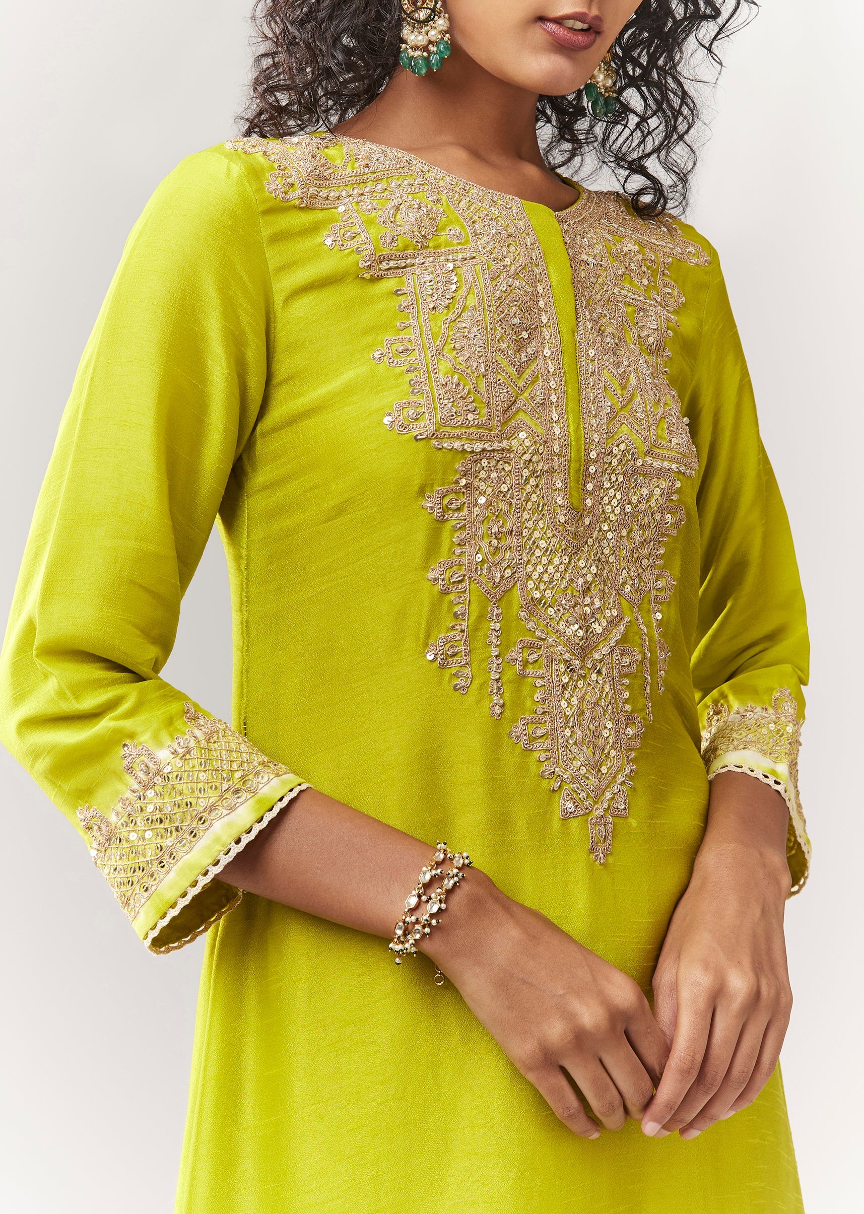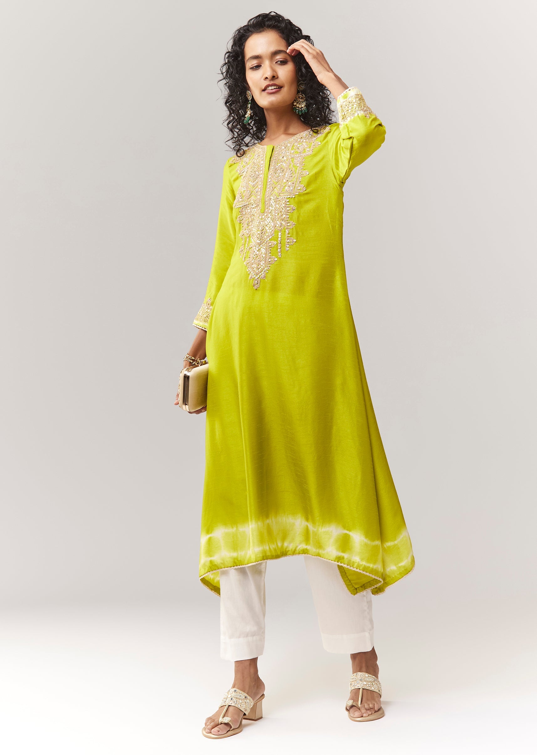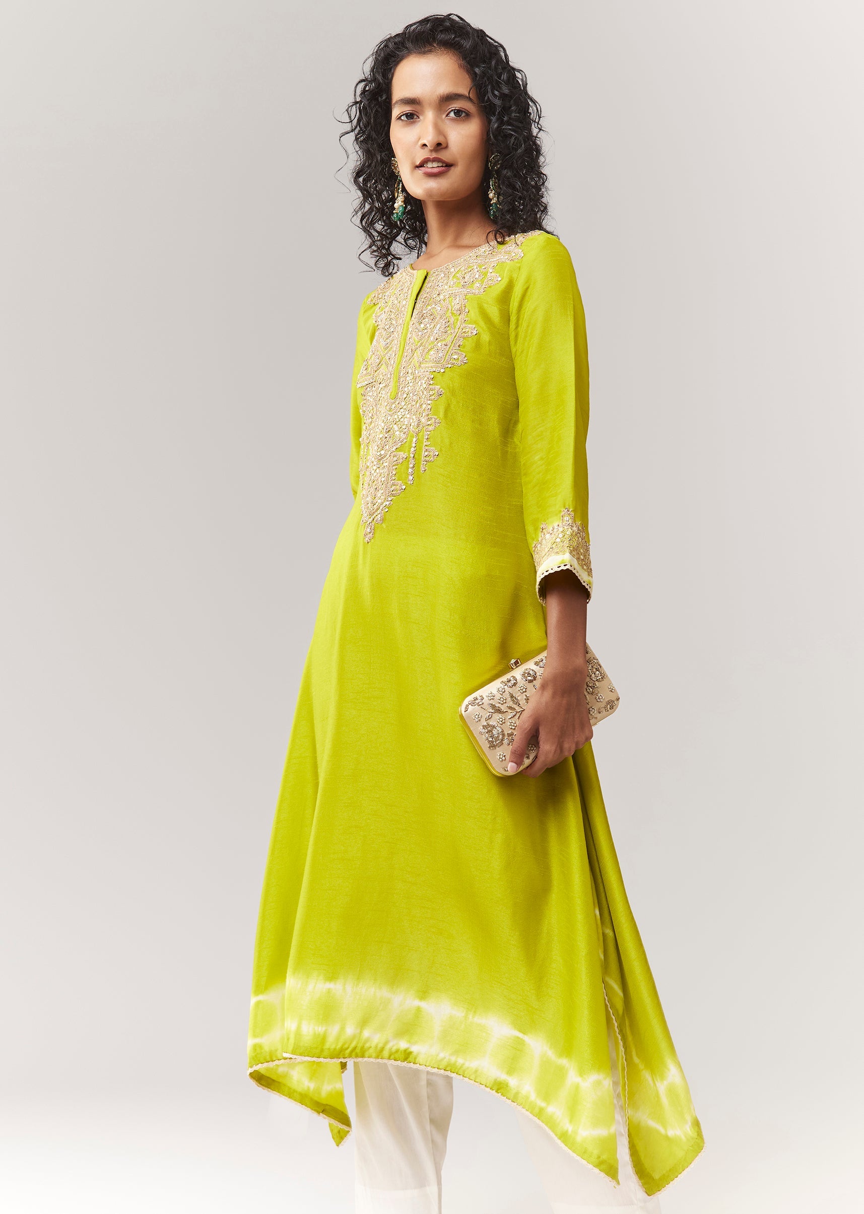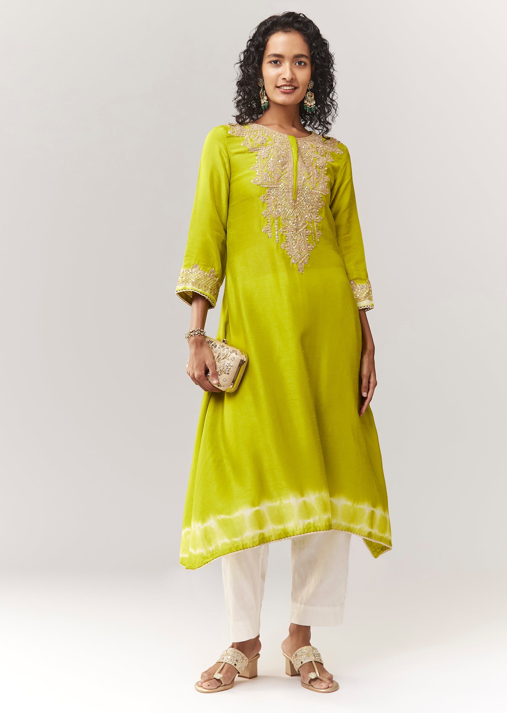 Lime Green A line Kurta Coord With Zari Thread Work And Leheriya Border