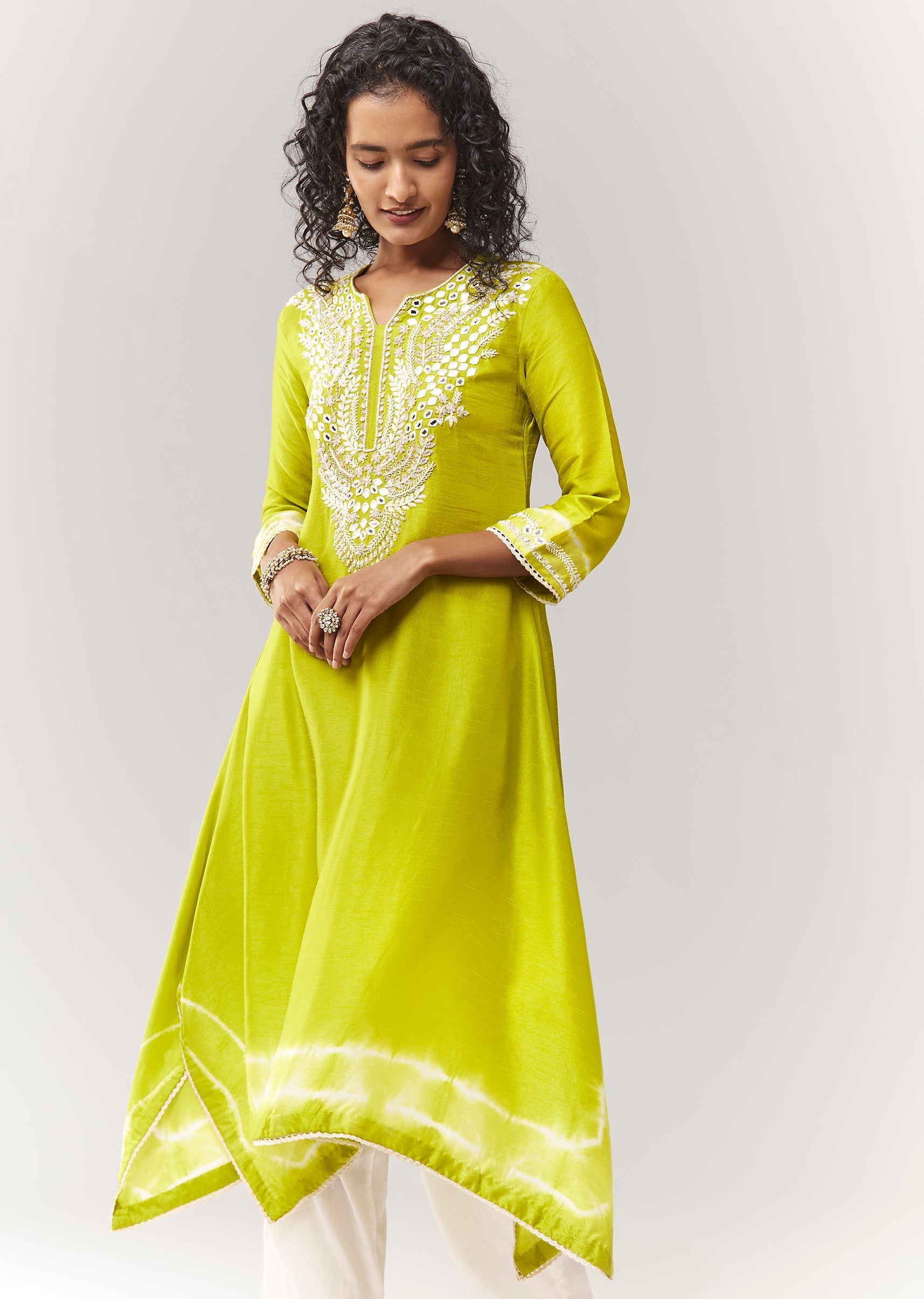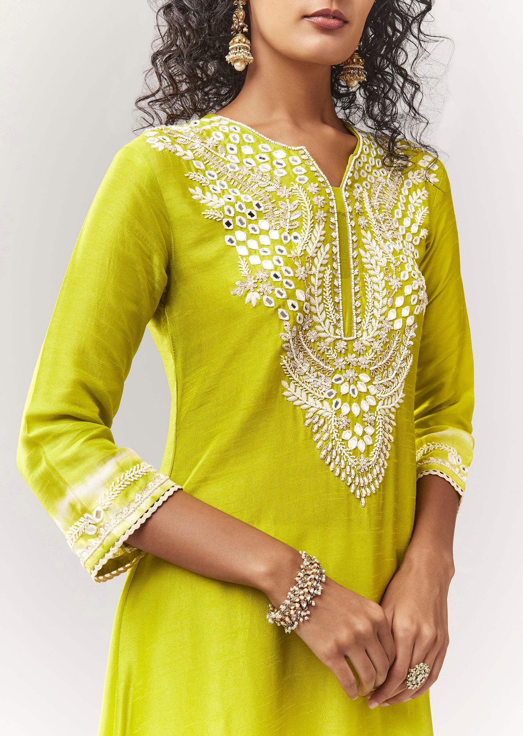 Lime Green Asymmetric A line Kurta Coord With Mirror And Sequin Work