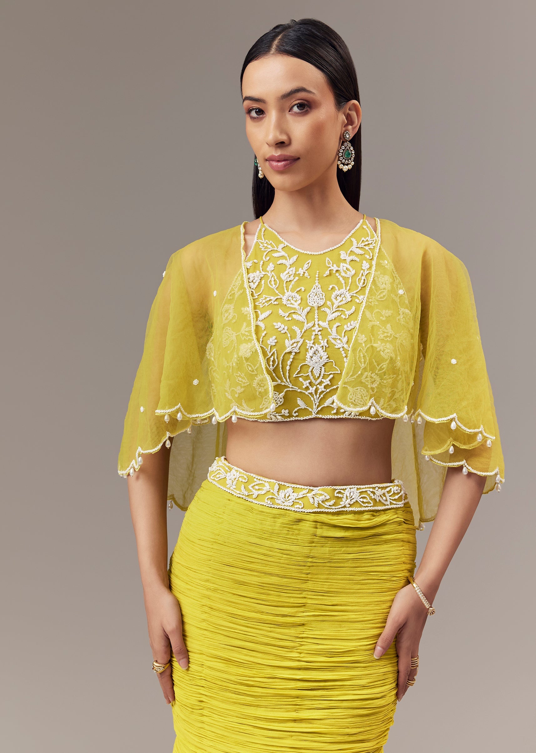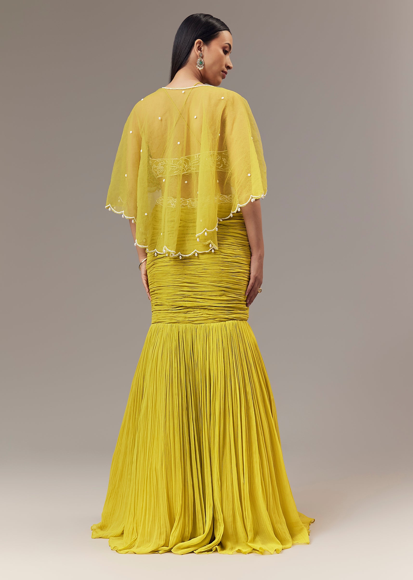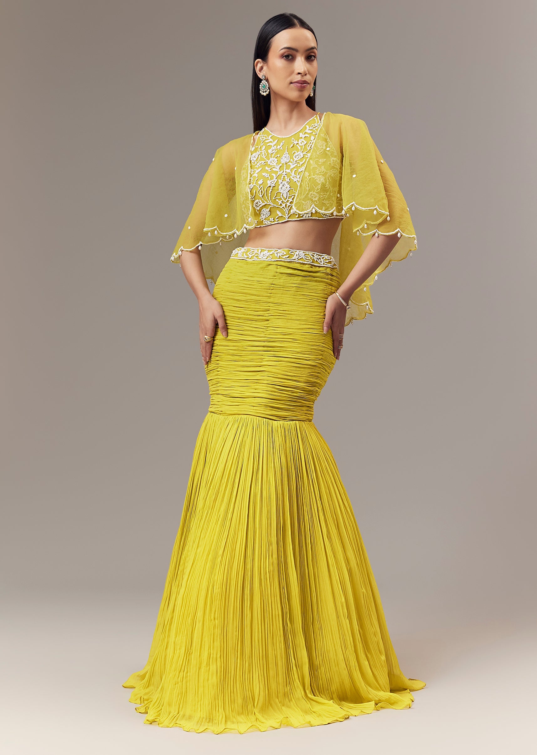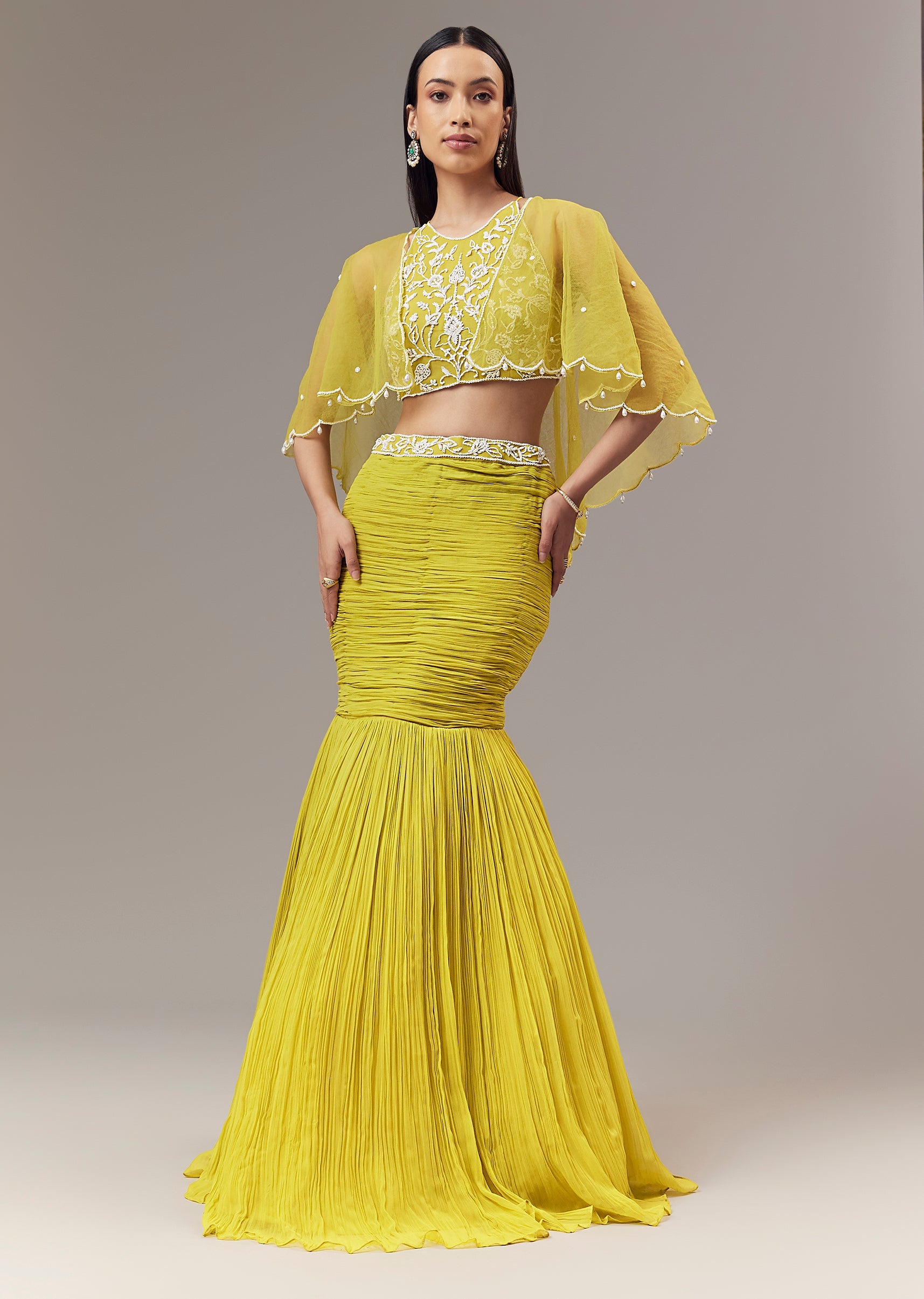 Lime Green Georgette Fish Cut Lehenga With High Halter Neck Blouse And Cape With Bead And Cut Dana Work