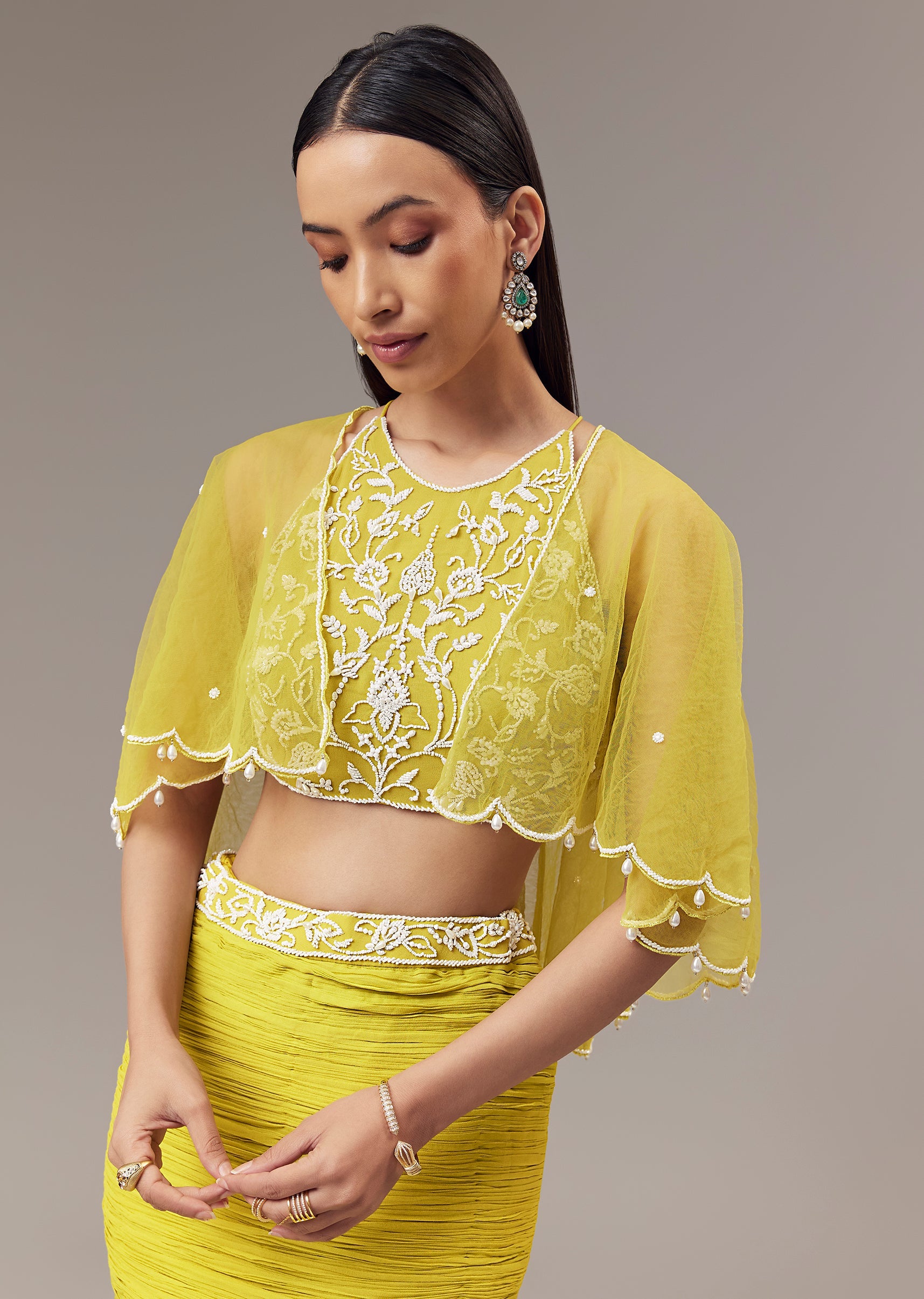 Pair with delicate statement earrings and metallic heels to highlight the detailed blouse and embellished cape.