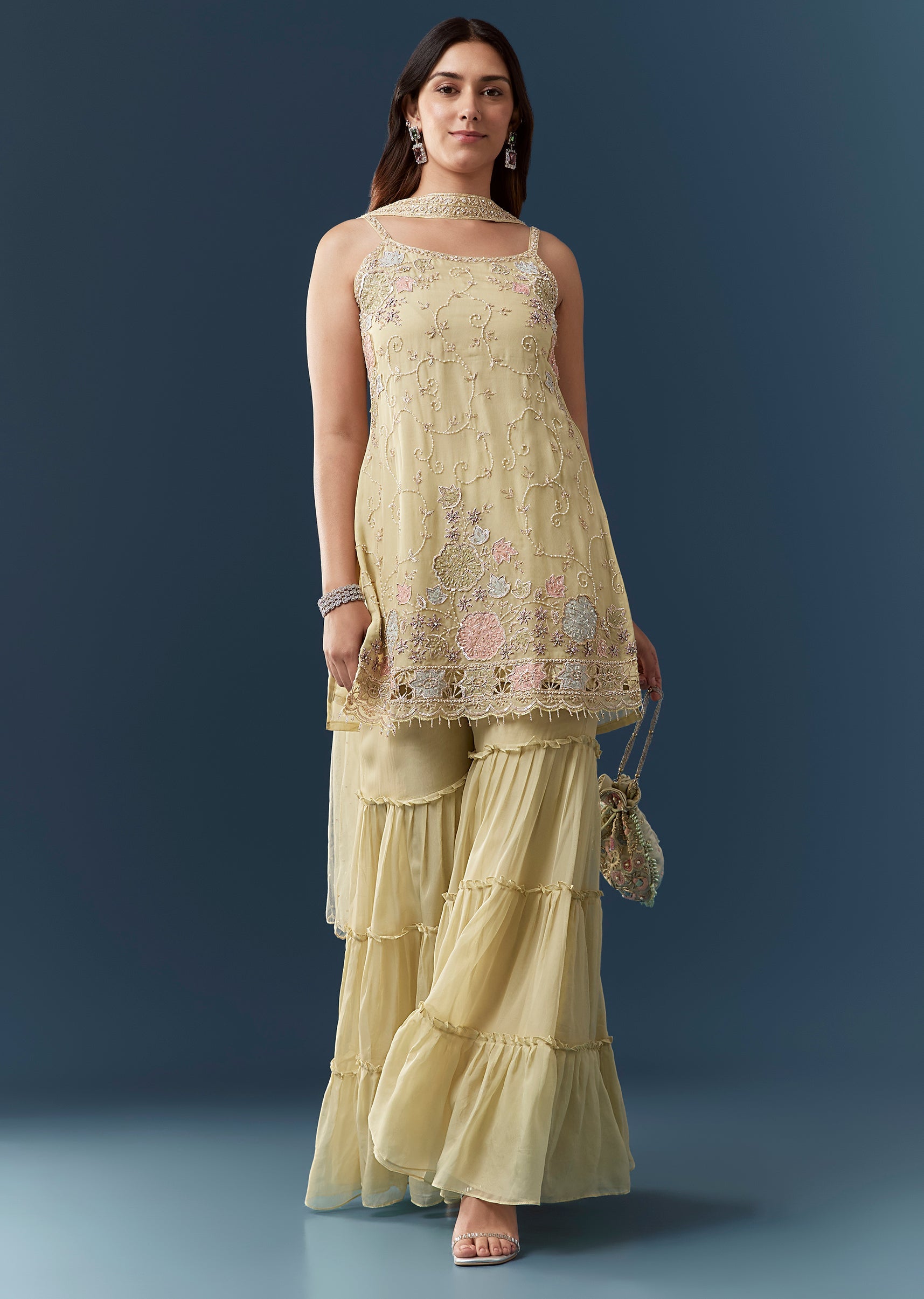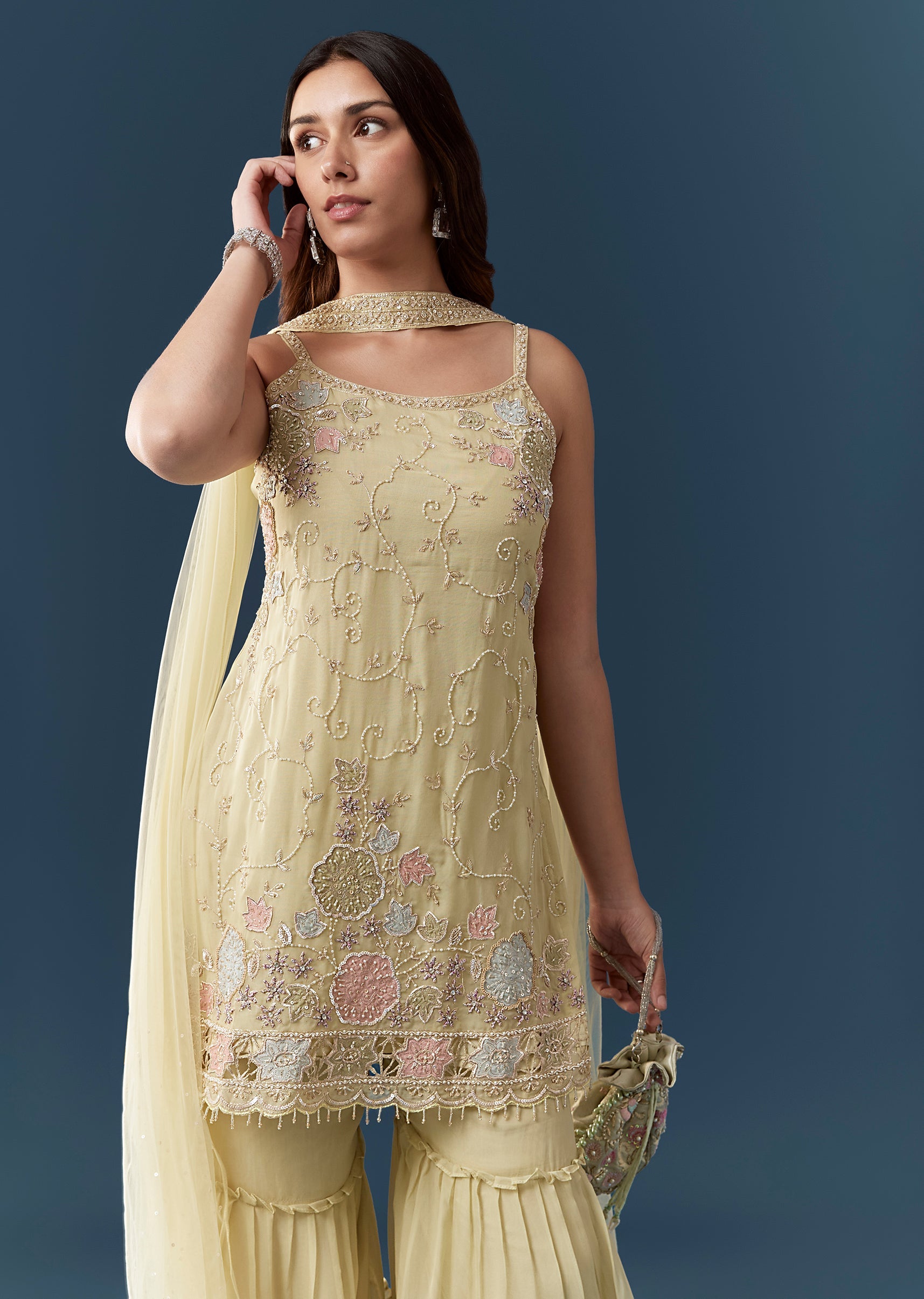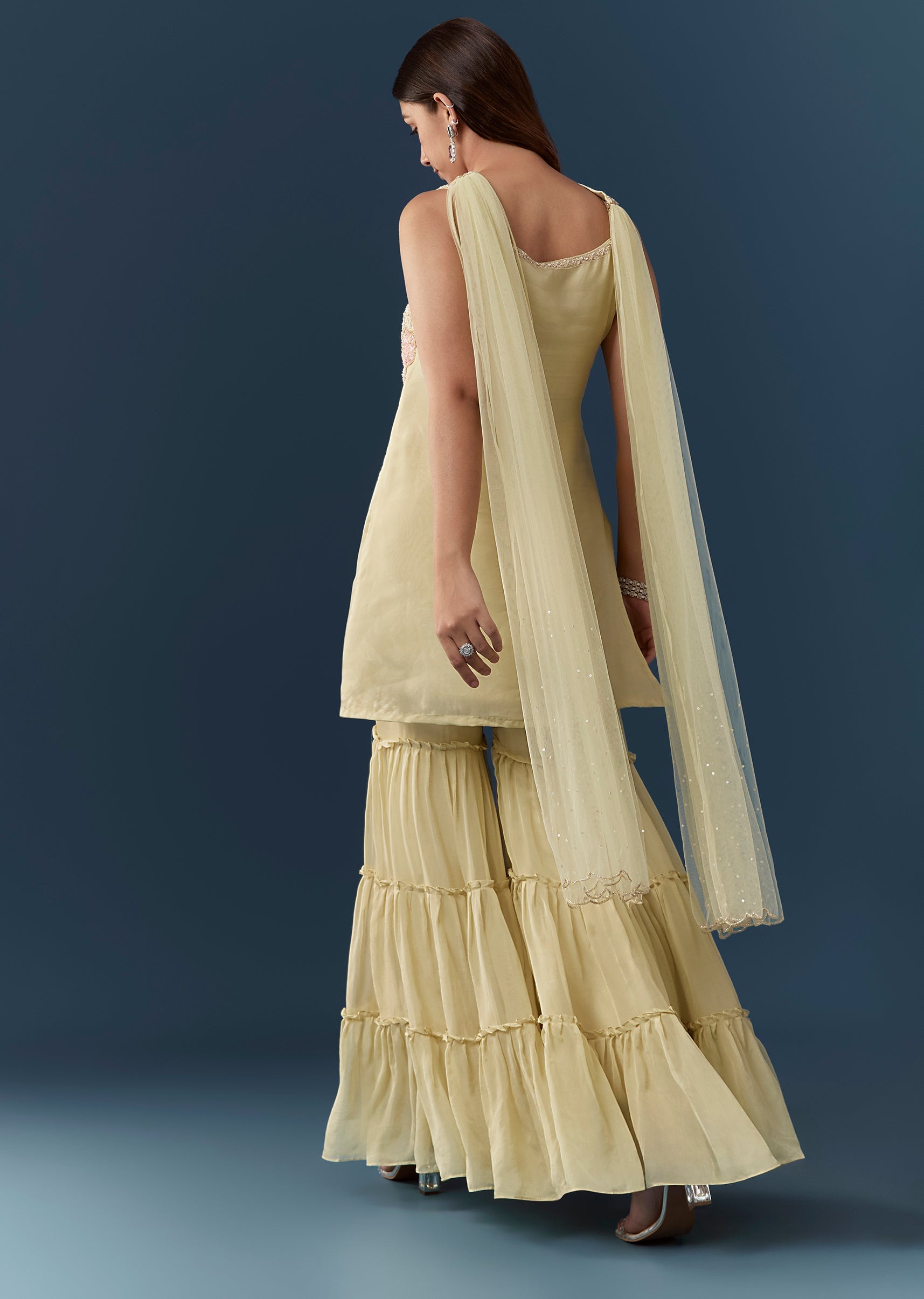 Ensure the kurta fits comfortably at the bust and neckline and check that the sharara sits securely at the waist for effortless graceful movement.