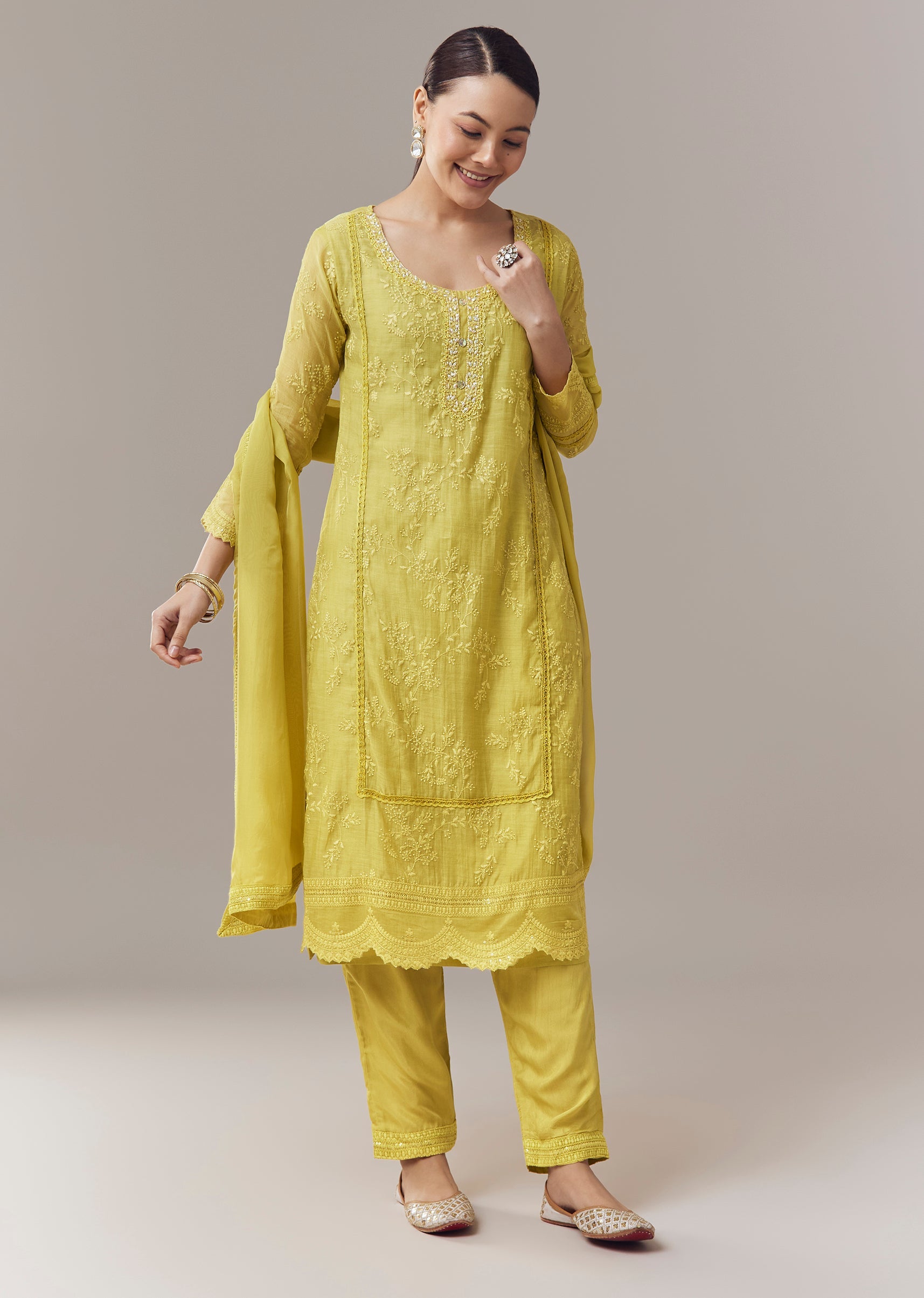 Lime Green Pakistani Style Kurta Set With Embroidery And Dupatta