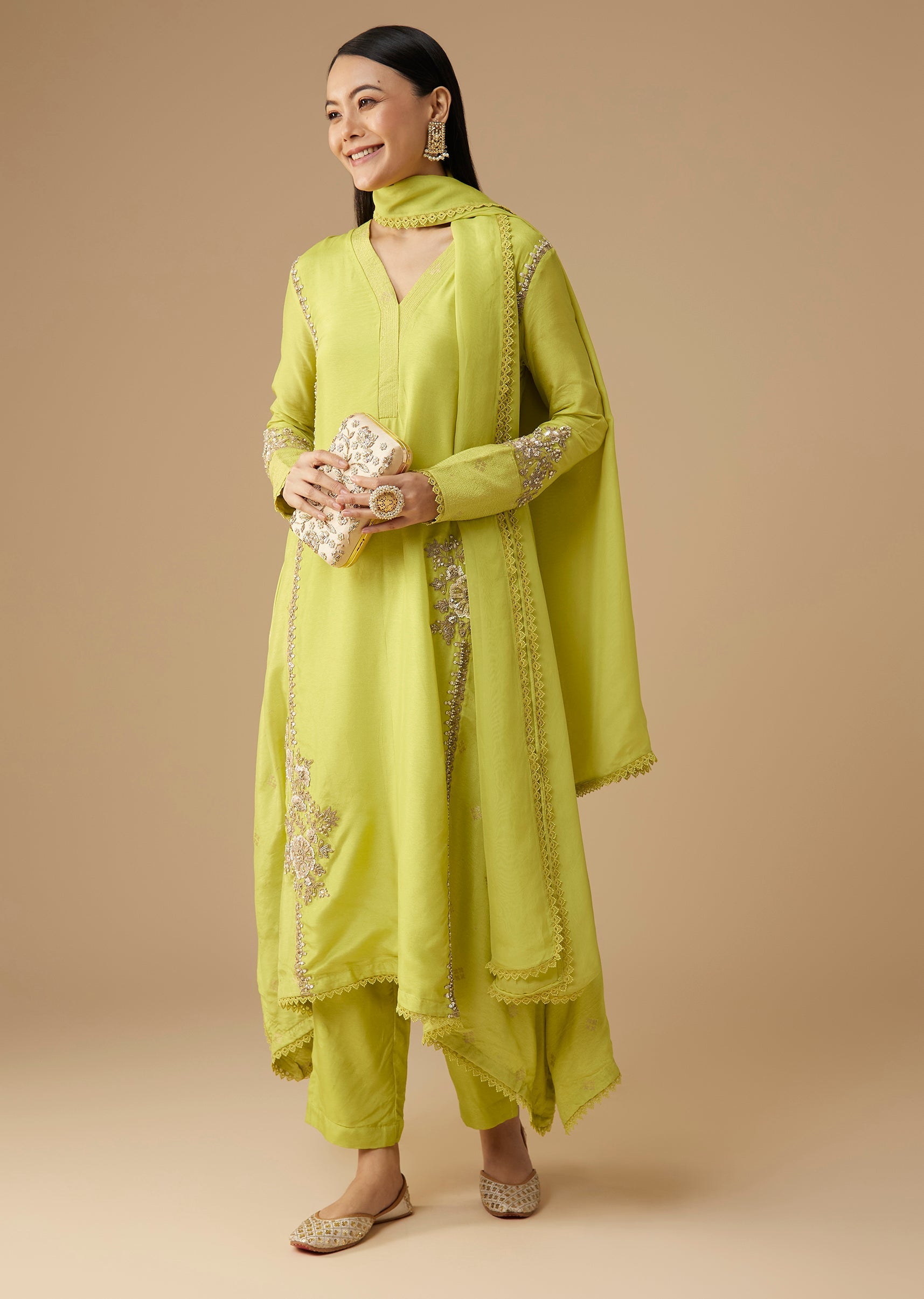 Illuminate any celebration with this lime green silk anarkali set, featuring exquisite zardosi and sequin work that adds depth and a festive glow. The rich silk fabric enhances the outfit with a luxurious sheen, while the matching pant and dupatta complete the look with graceful coordination. Ideal for weddings, festive functions, or special occasions, this ensemble offers a perfect blend of tradition and modern refinement. Awarded as the Most Trusted Brand, we're delivering styles you love, just as promised.