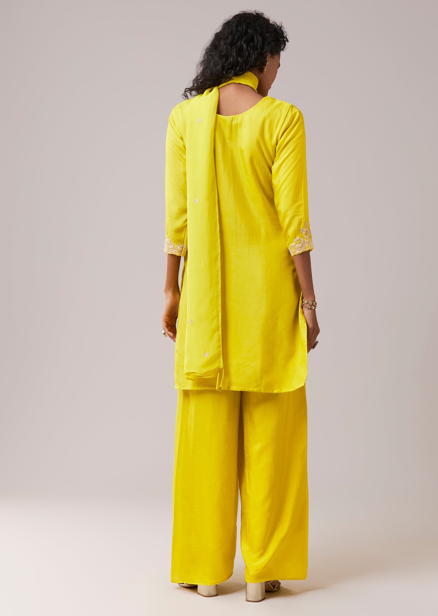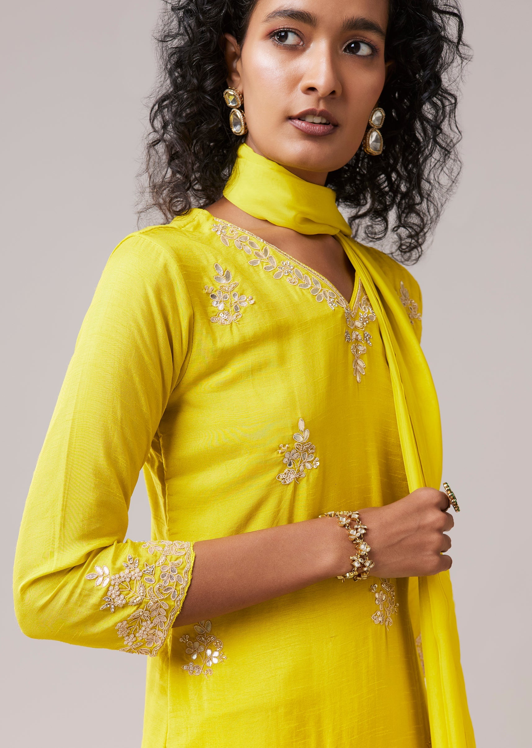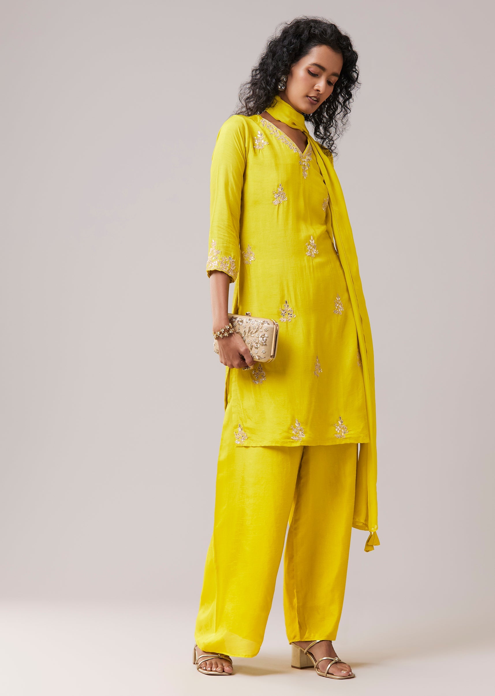 Gracefully crafted with intricate detailing, this silk kurta set brings together classic elegance and festive artistry. The gotta and zardosi embroidery adds depth and a soft celebratory glow, enhancing the kurta’s refined silhouette. Designed with a flattering V neckline and 3/4th sleeves, it offers a timeless appeal that transitions beautifully from day to evening. Paired with matching pants and a coordinated dupatta, this ensemble is ideal for festive gatherings and traditional occasions. Awarded as the Most Trusted Brand, we're delivering styles you love, just as promised.
