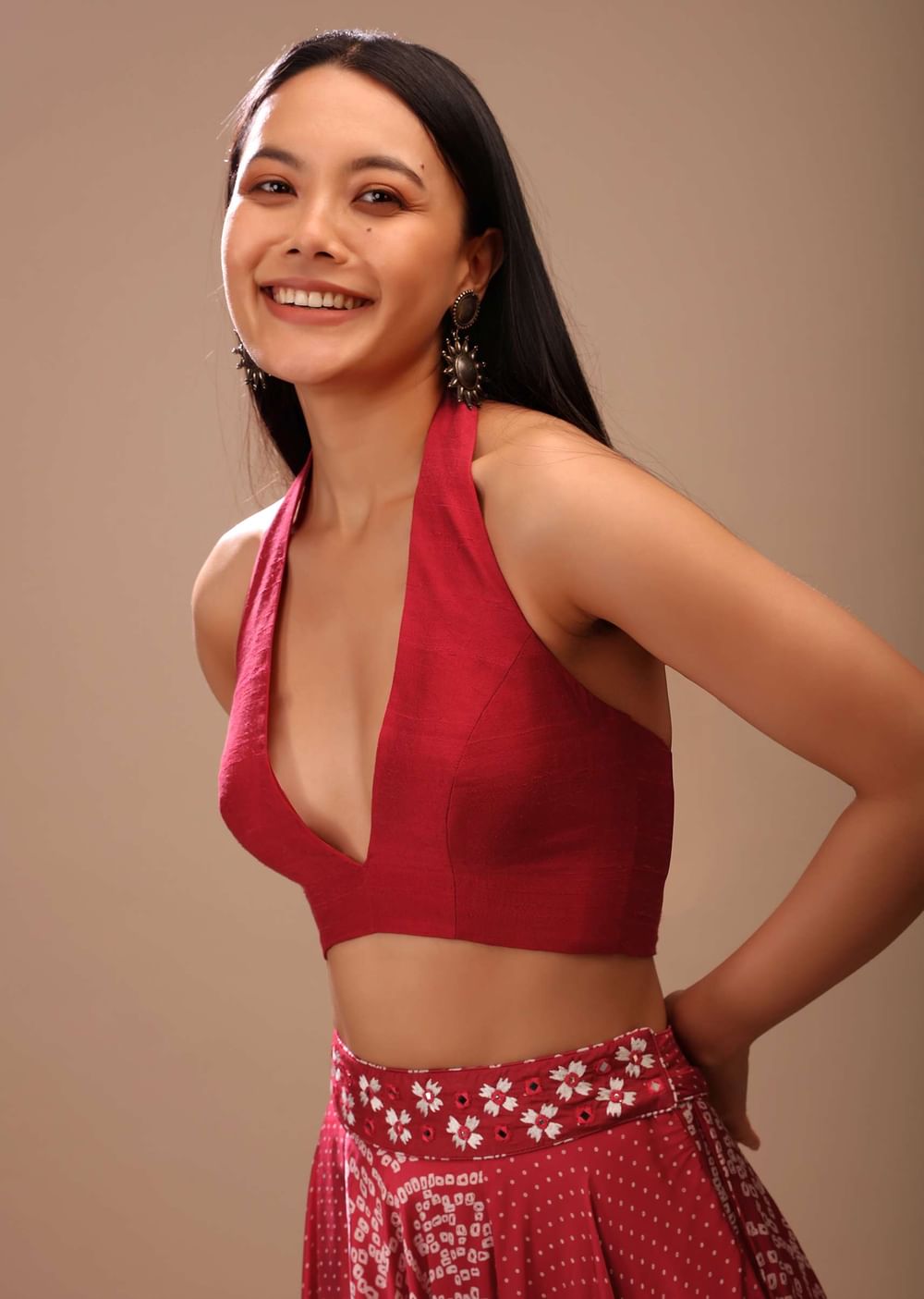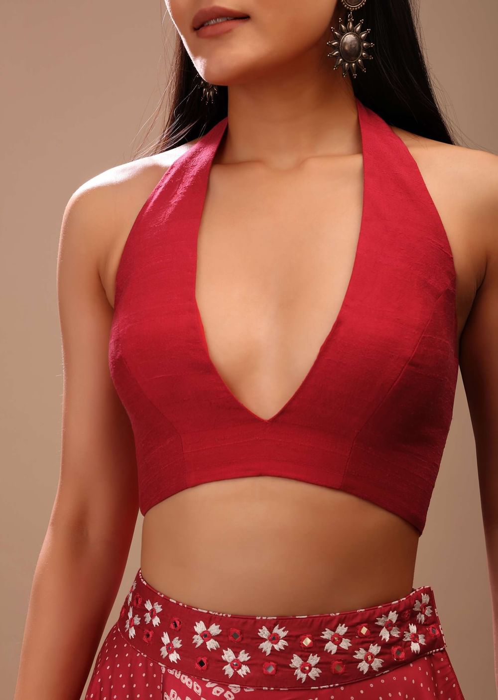 Lipstick red blouse in raw silk with halter and plunging neckline and deep cut back.Crafted with back hook closure and padding. Awarded as the Most Trusted Brand, we're delivering styles... More Product Details