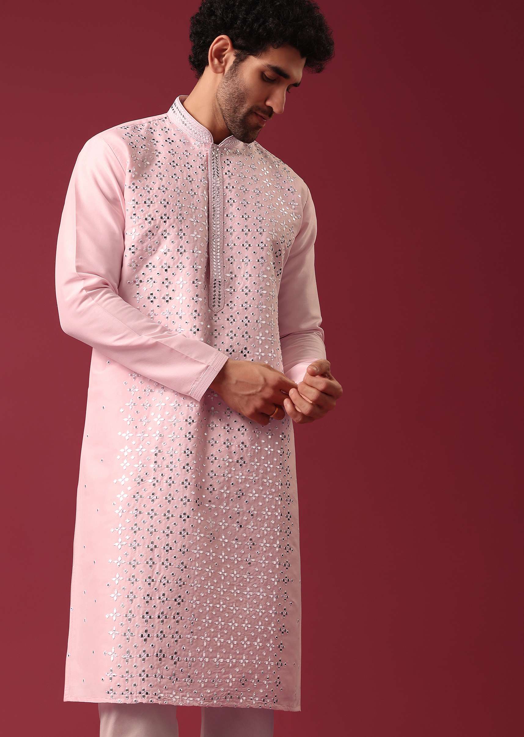 Your ultimate wedding style is this opulent pink kurta adorned with dazzling mirror work buttis. The Mandarin collar and front-button add an air of sophistication to rich silk base. Comes... More Product Details