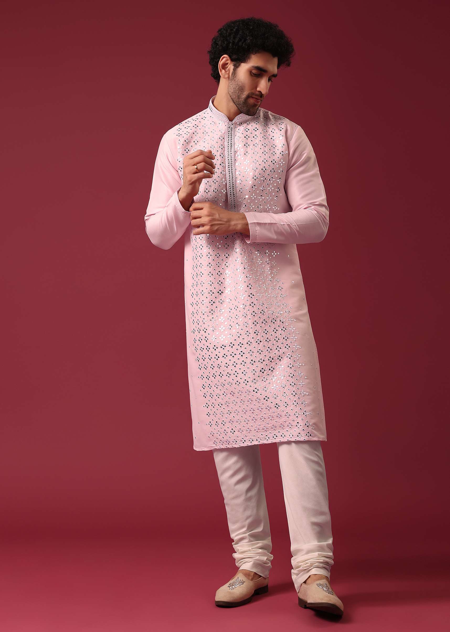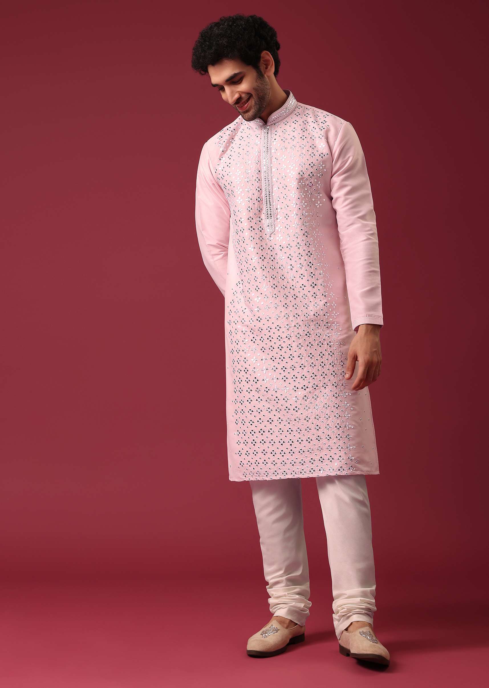Your ultimate wedding style is this opulent pink kurta adorned with dazzling mirror work buttis. The Mandarin collar and front-button add an air of sophistication to rich silk base. Comes with a churidar, this 2-piece set shows off your stylish persona. Awarded As The Most Trusted Brand We'Re Delivering Styles You Love Just As Promised.