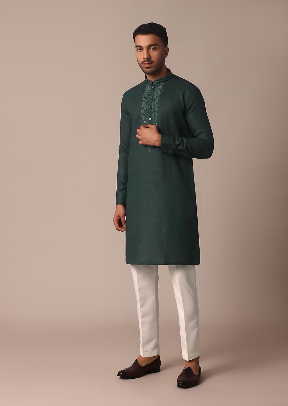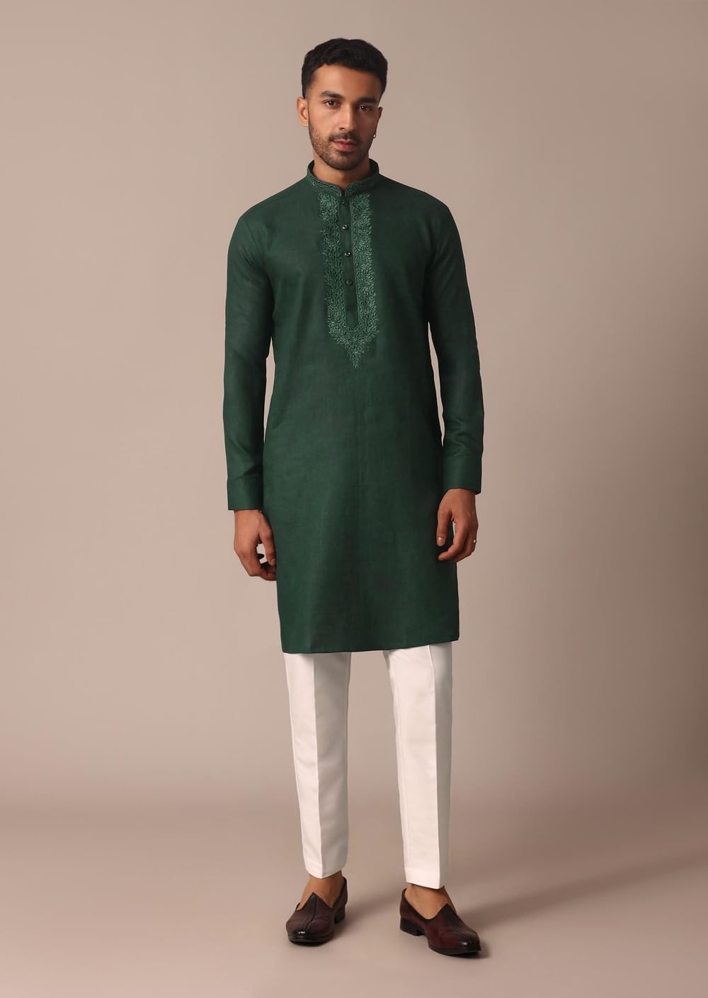 Elevate your festive attire with our Green Linen Kurta. It features exquisite thread/resham work on the yoke in a deep Dark Green accent. Crafted for both style and comfort, this set includes one kurta. It is designed to add a touch of sophistication to your festive ensemble. Awarded as the Most Trusted Brand, we're delivering styles you love, just as promised.