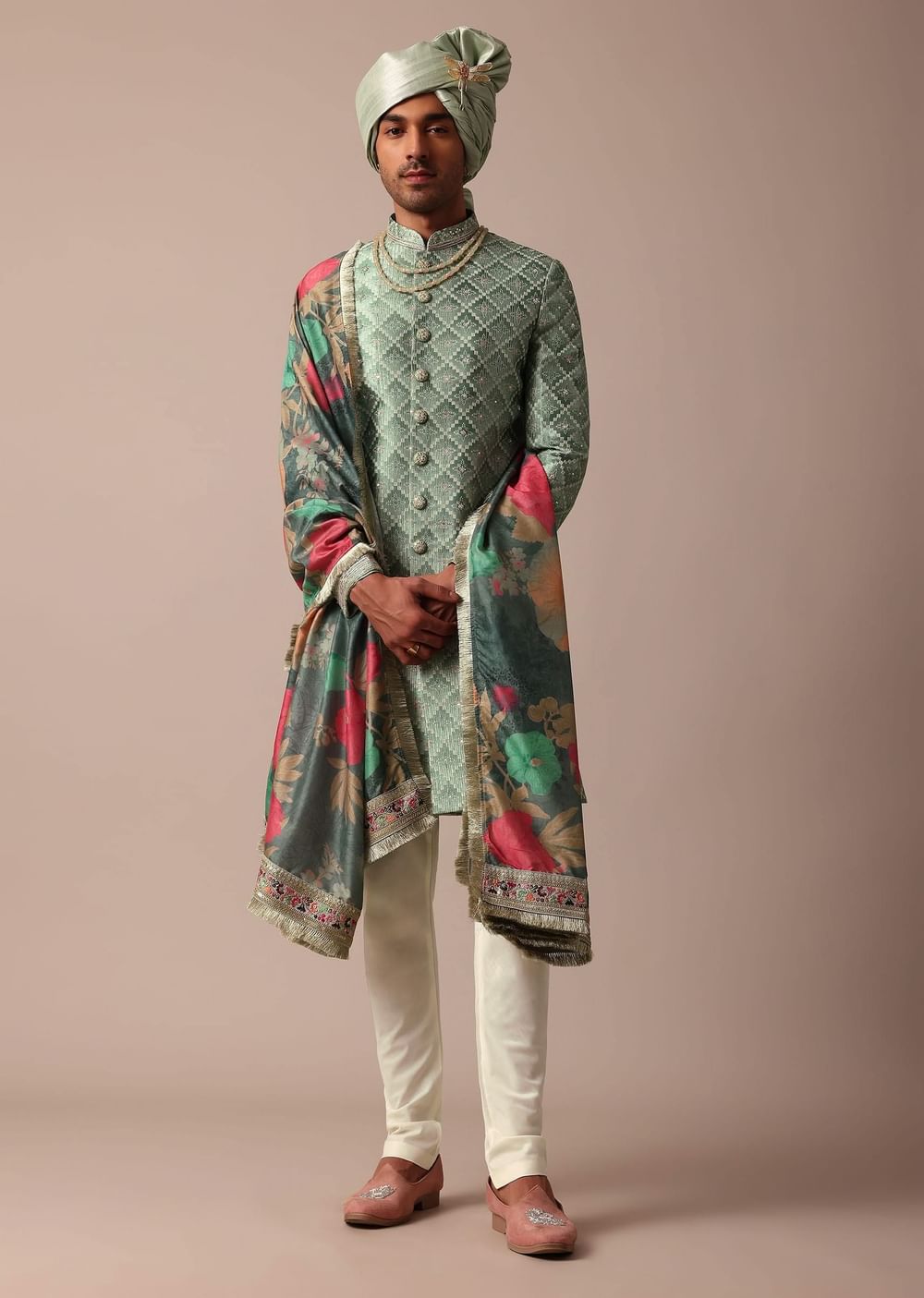 Embrace timeless elegance with our Luxe Green Jacquard Sherwani Set. It features intricate embroidery all over. This set includes a Sherwani and Bottom. Crafted from premium Jacquard fabric the detailed... More Product Details