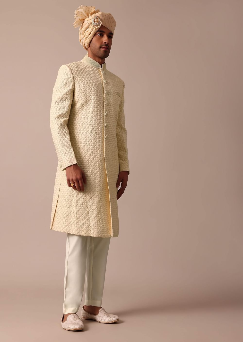 Magnificent Beige Silk Lucknowi Sherwani Set