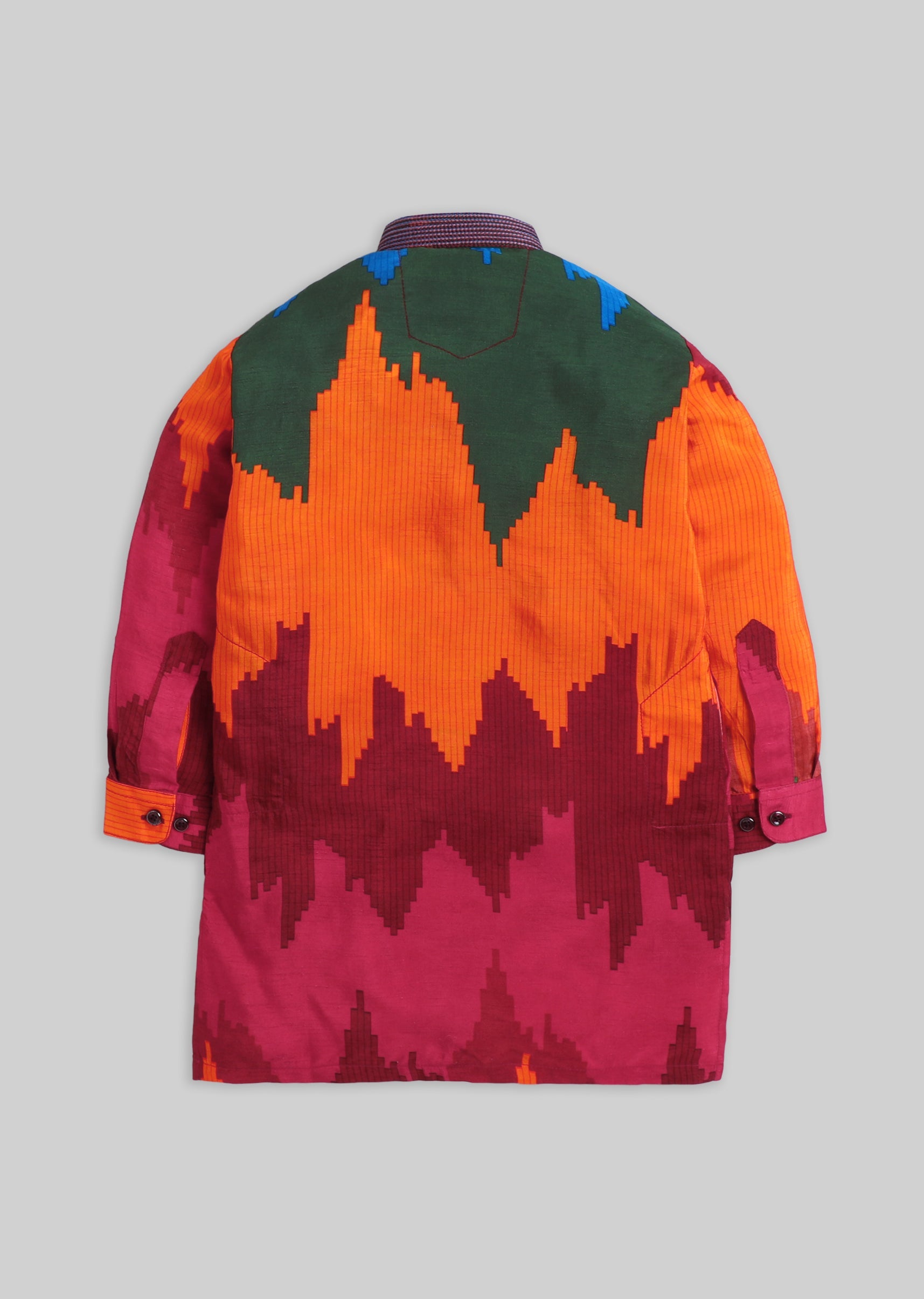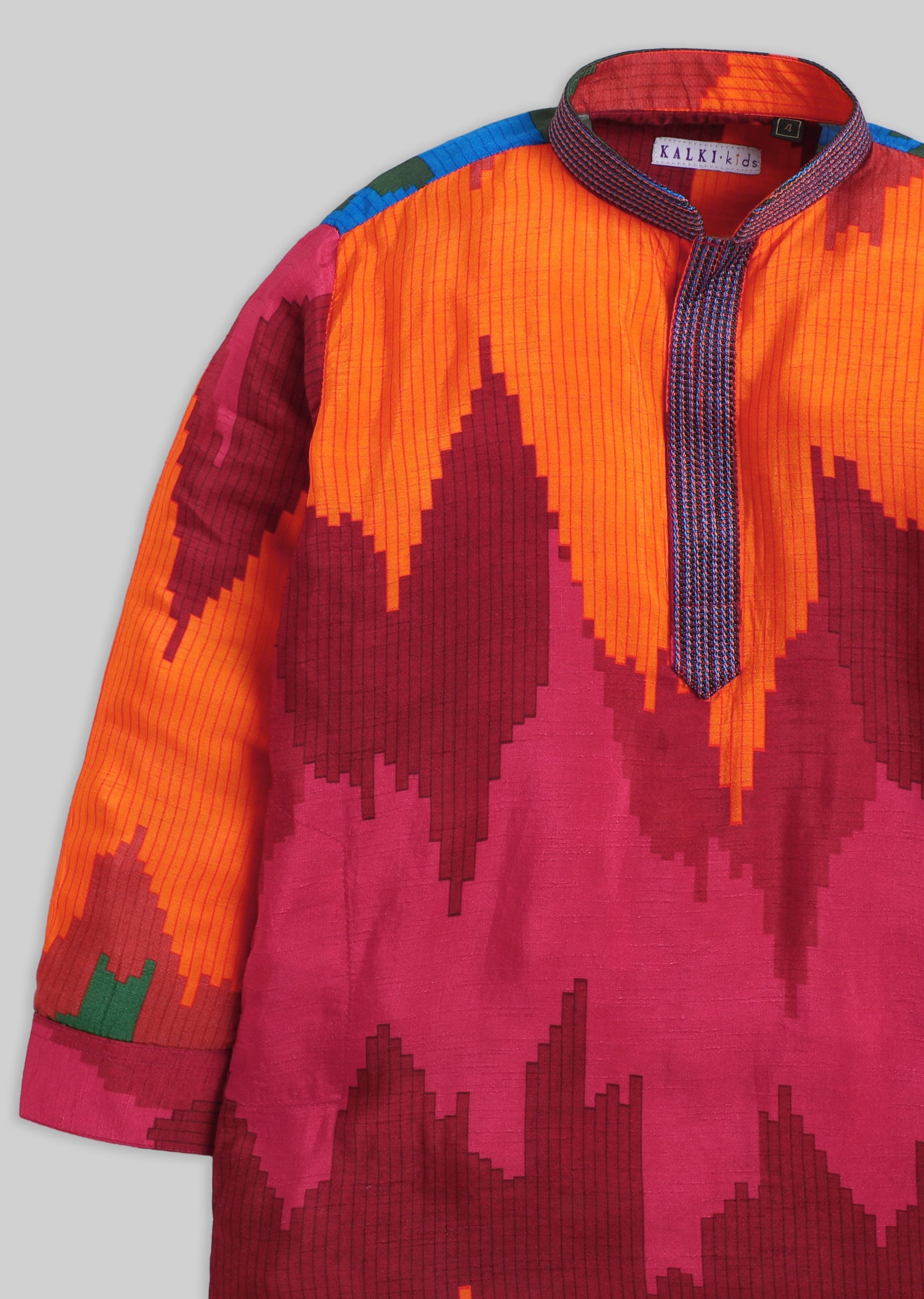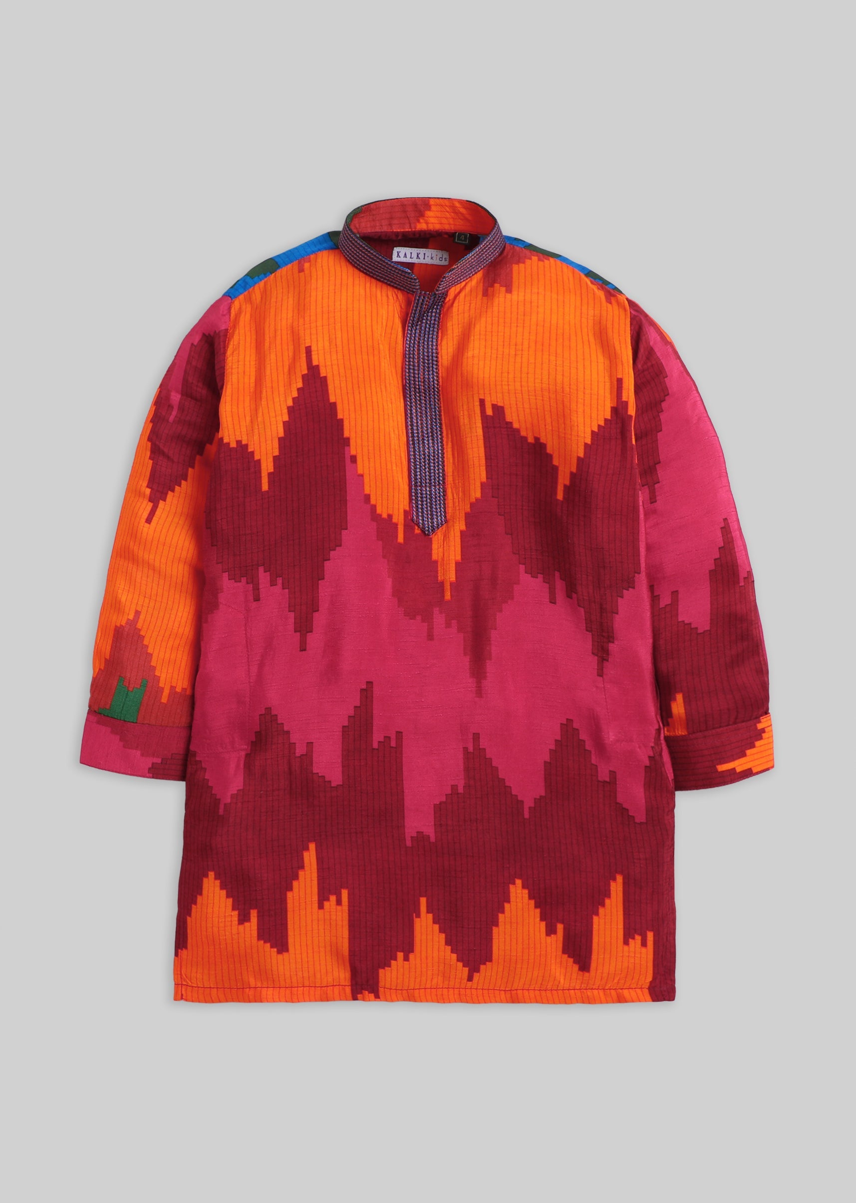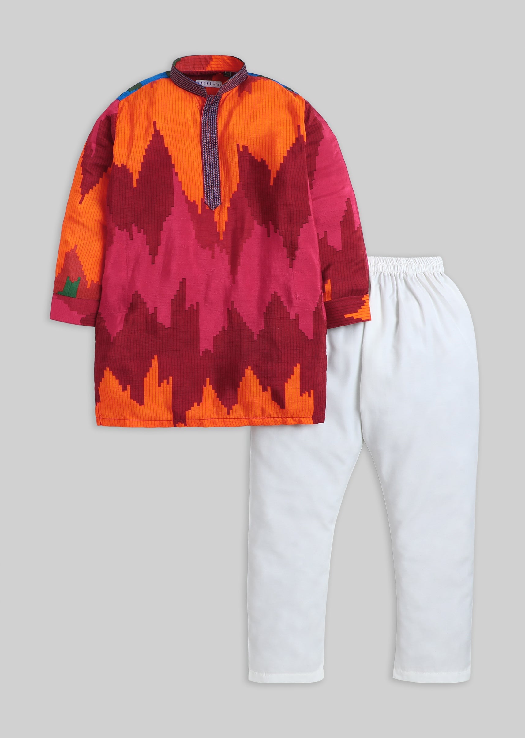 A festive cotton kurta set featuring a vibrant colour-blocked pattern, finished with a mandarin collar and front buttons. Includes matching pants—easy to wear, easy to style. Awarded as the Most... More Product Details