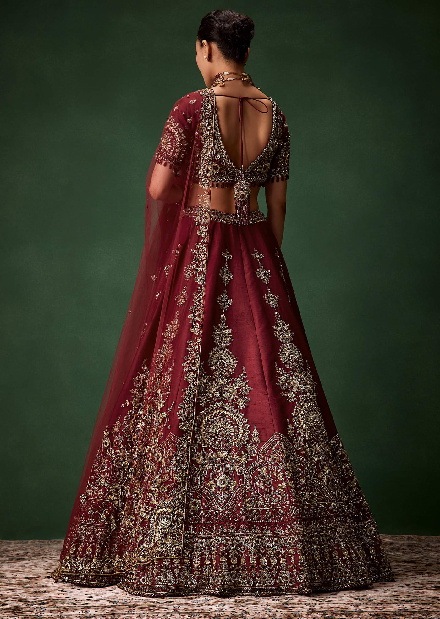 Maroon Bridal Moti Silk Lehenga Set with Two Dupattas