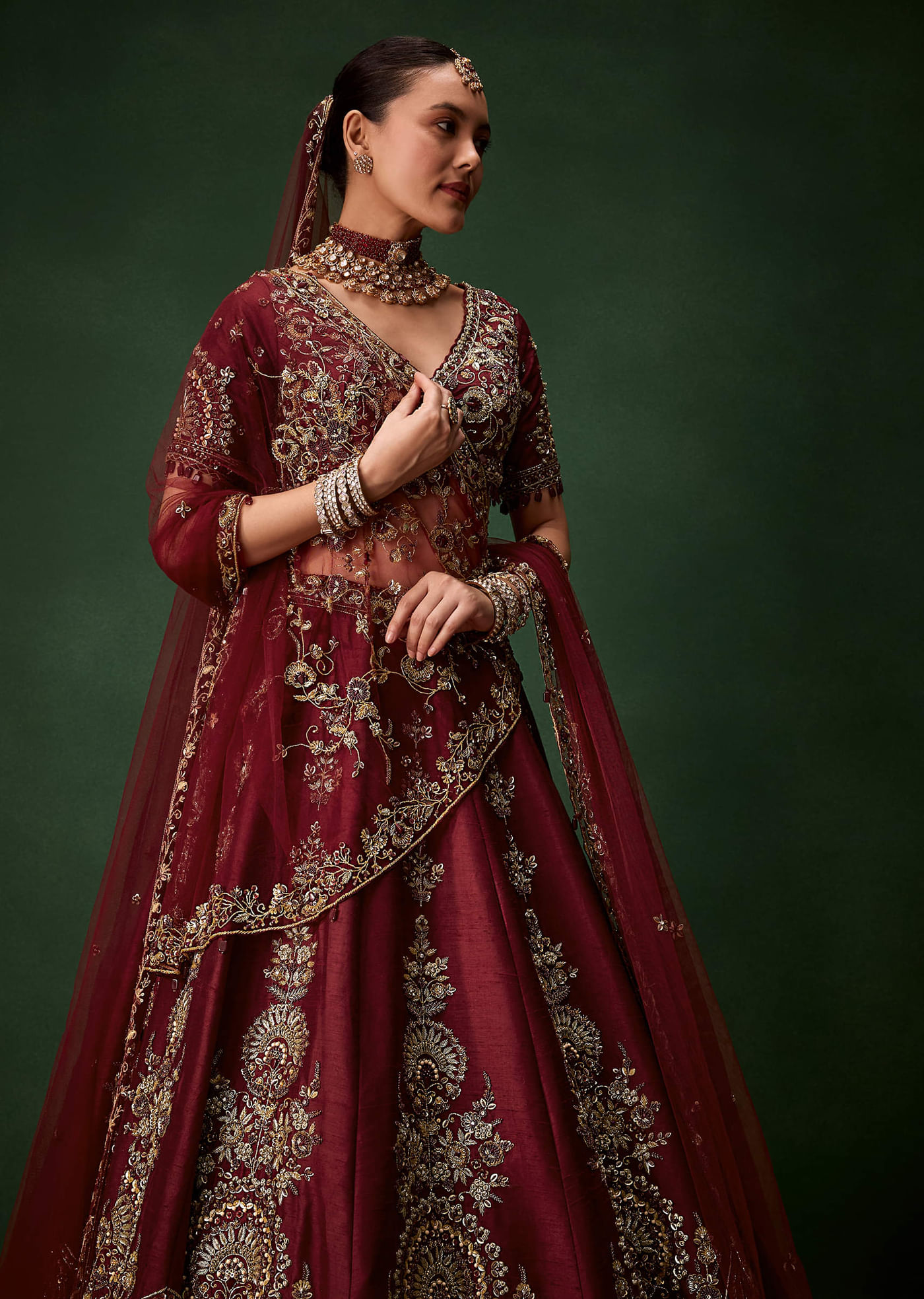 Rich in tradition and regal allure, this maroon silk bridal lehenga set is a timeless ode to heritage craftsmanship. Adorned with intricate moti, sequin, and zardozi embroidery, the ensemble glimmers... More Product Details