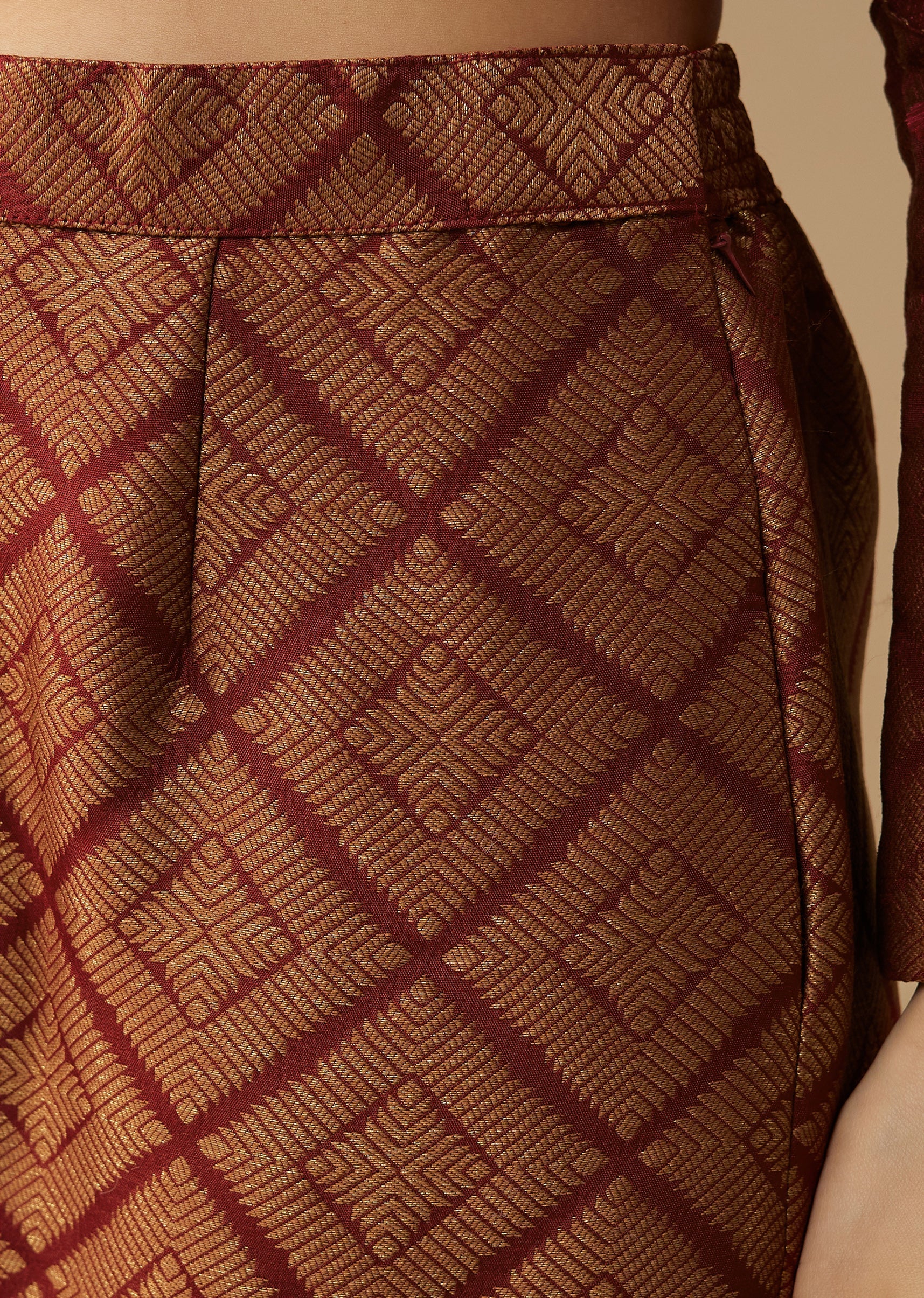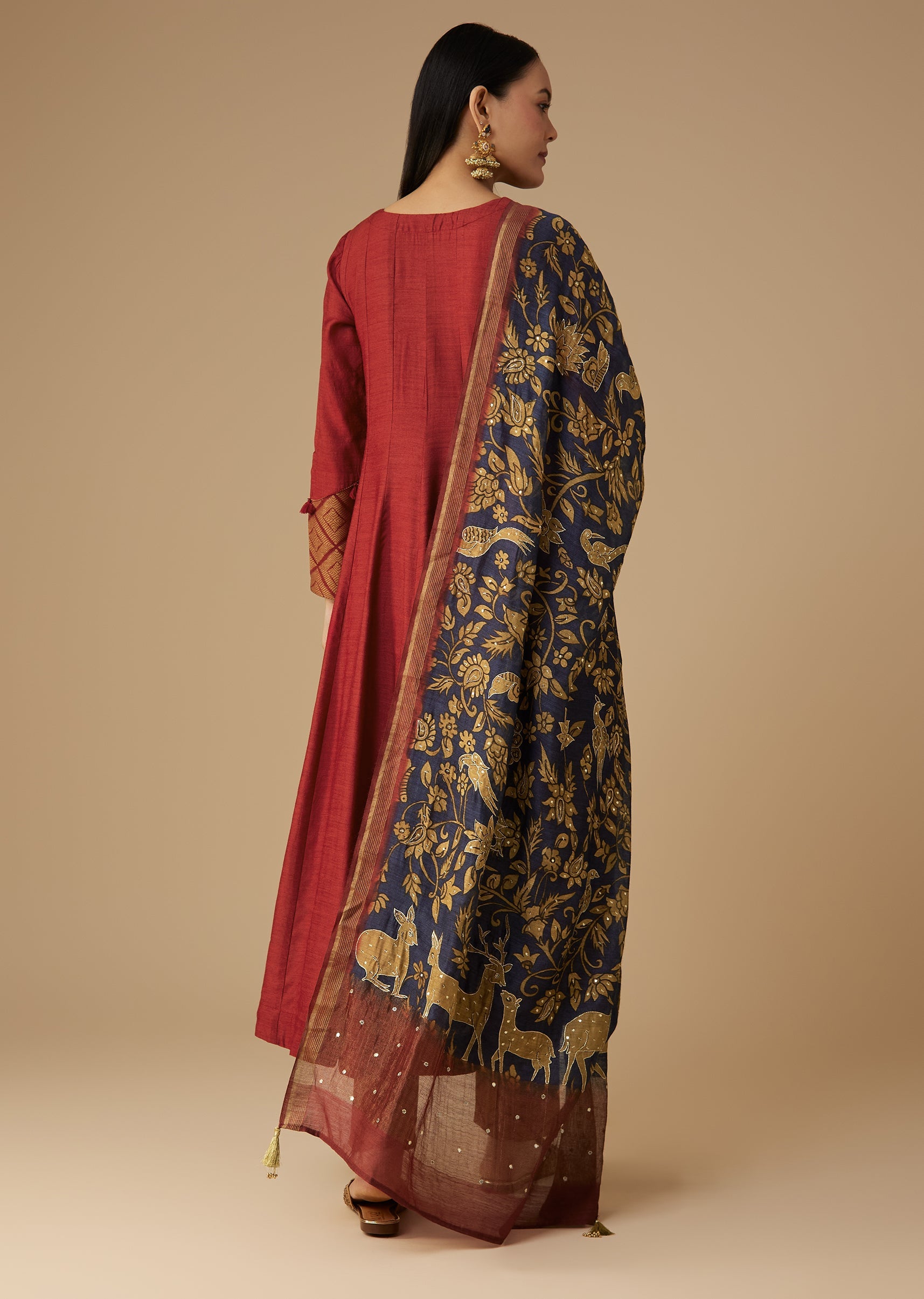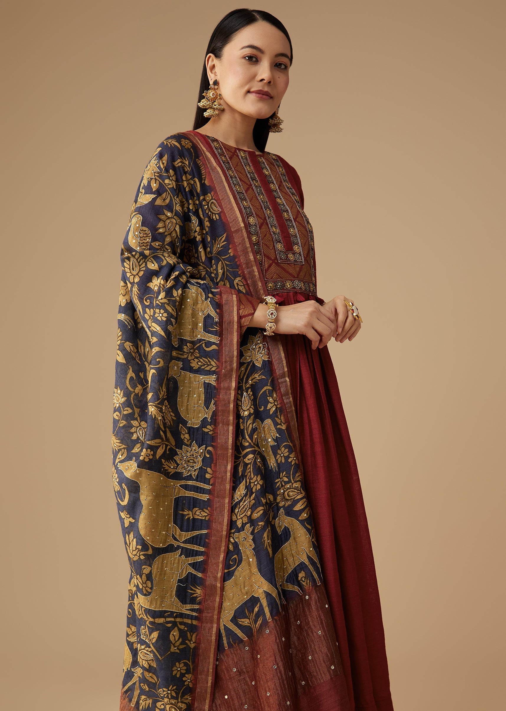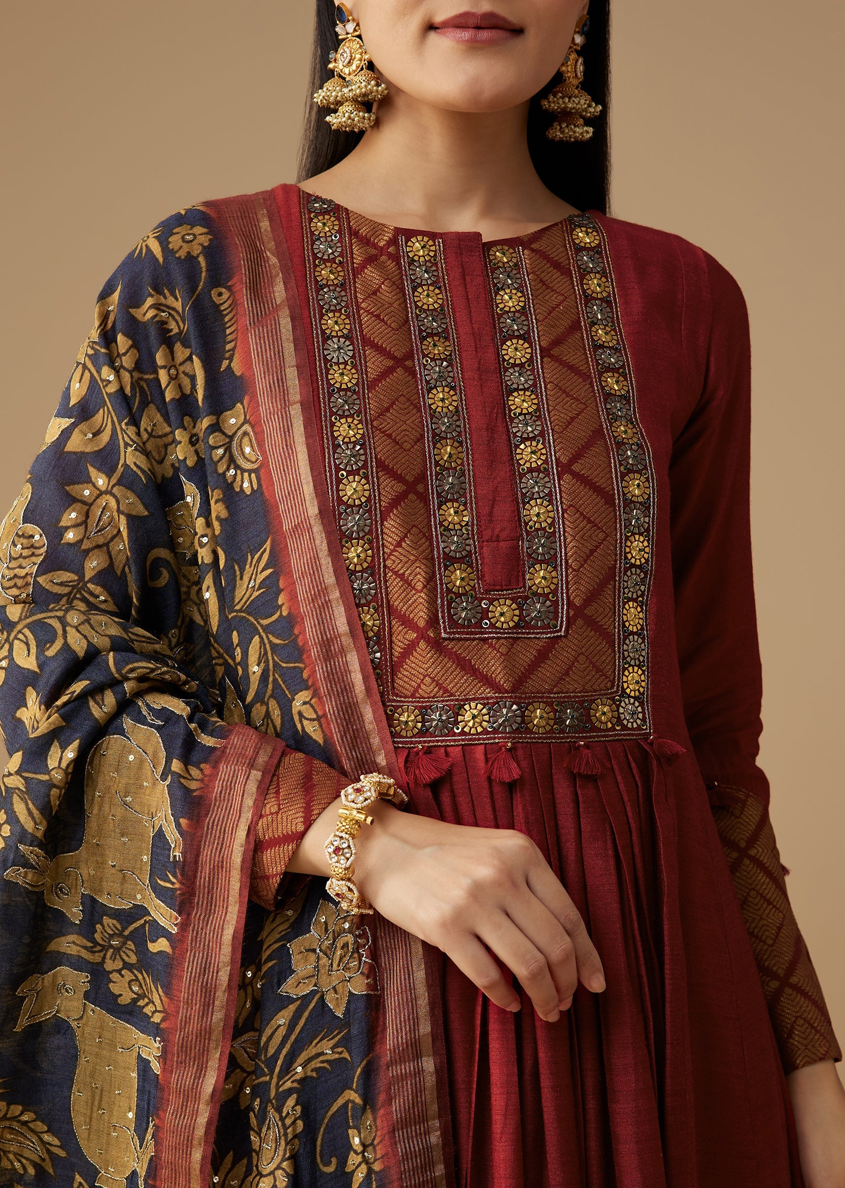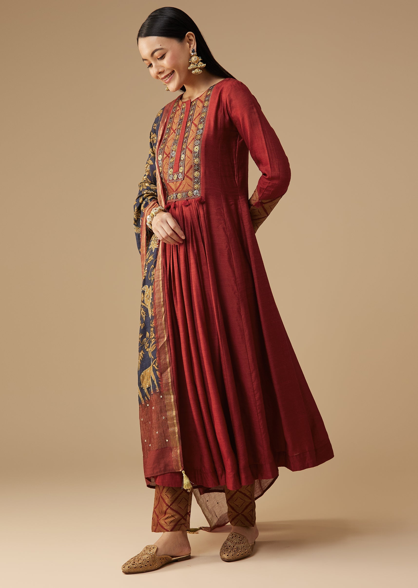 Indulge in rich traditional elegance with this maroon anarkali set, featuring a brocade yoke and sleeves that bring depth, texture, and regal charm. The full brocade pants add a luxurious coordinated touch, while the tussar dupatta softens the ensemble with a graceful, understated sheen. Perfect for weddings, festive celebrations, or evening functions, this set blends opulent detailing with a timeless silhouette. Awarded as the Most Trusted Brand, we're delivering styles you love, just as promised.