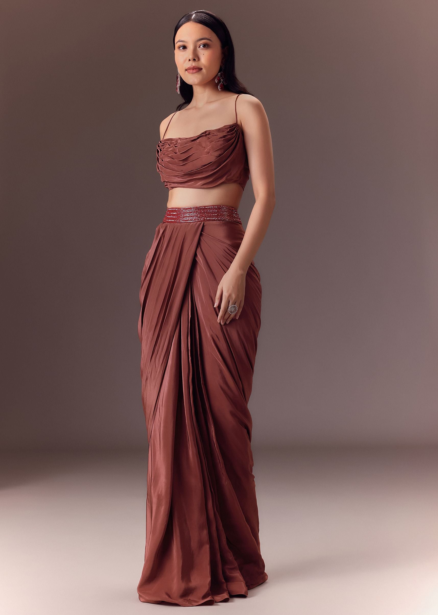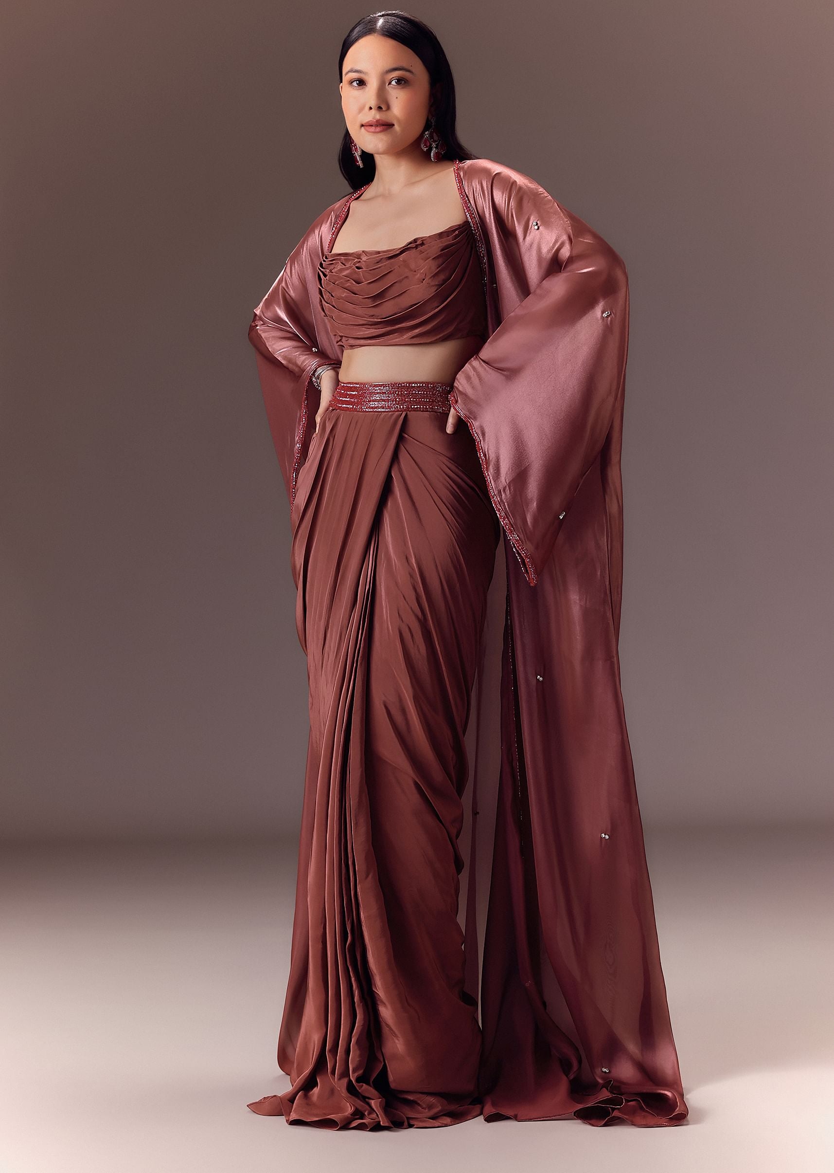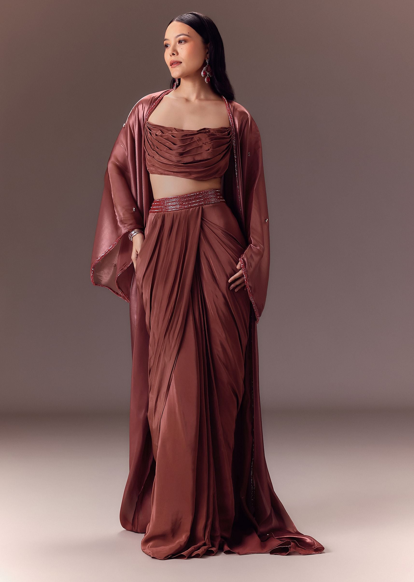 Maroon Organza Cowl Blouse With Jacket And Draped Skirt