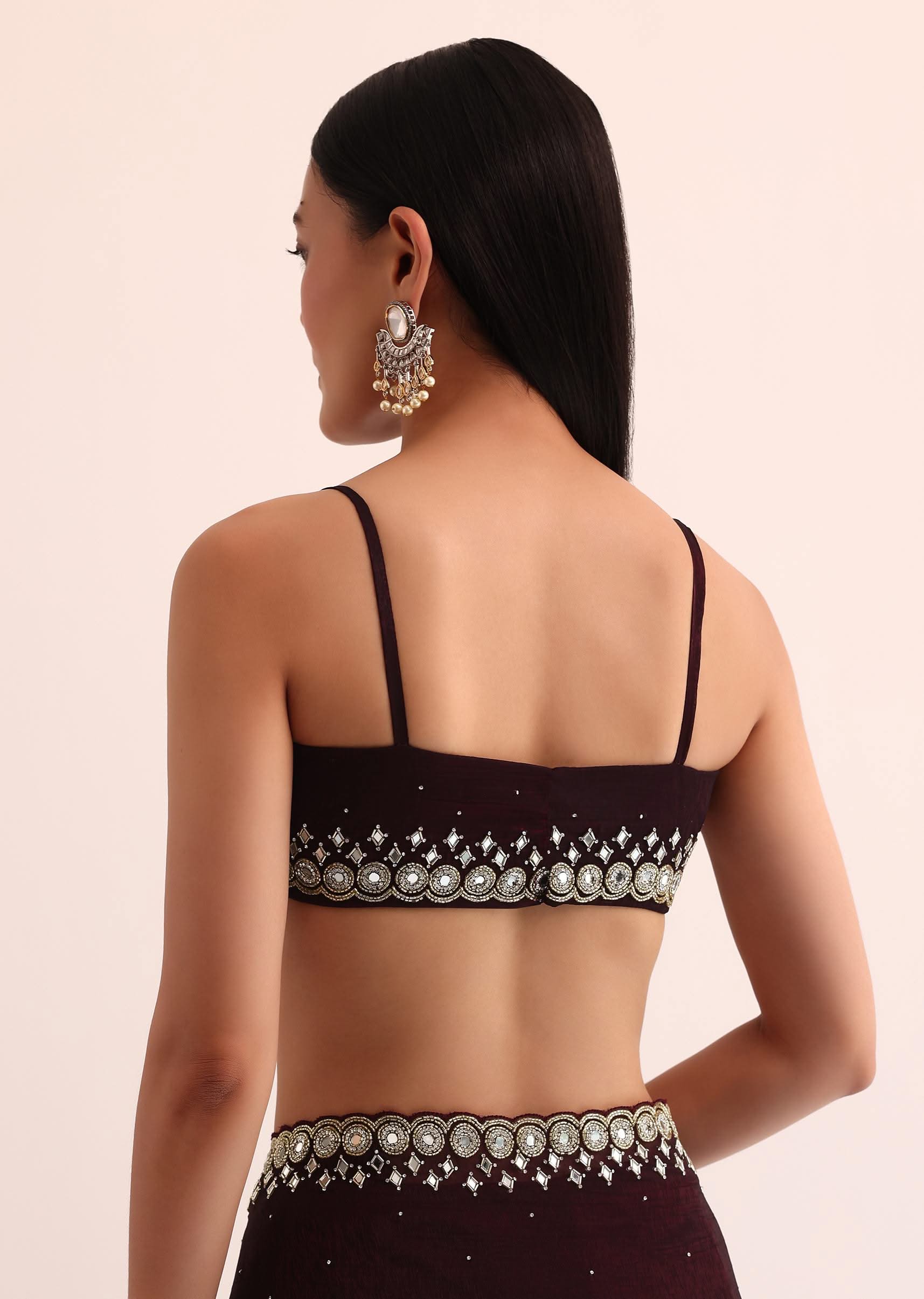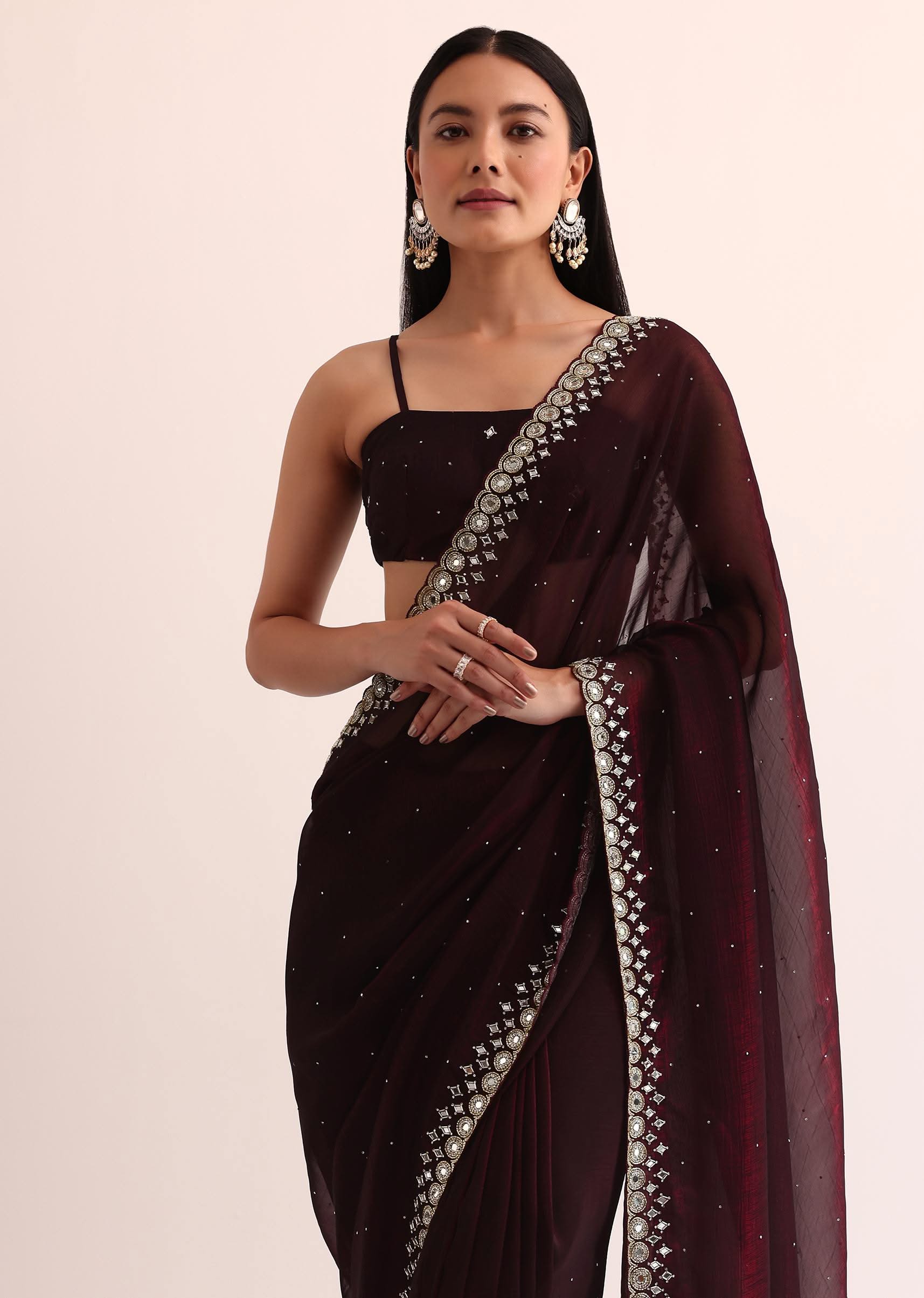 Maroon Red Satin Saree With Mirror Embroidery And Unstitched Blouse