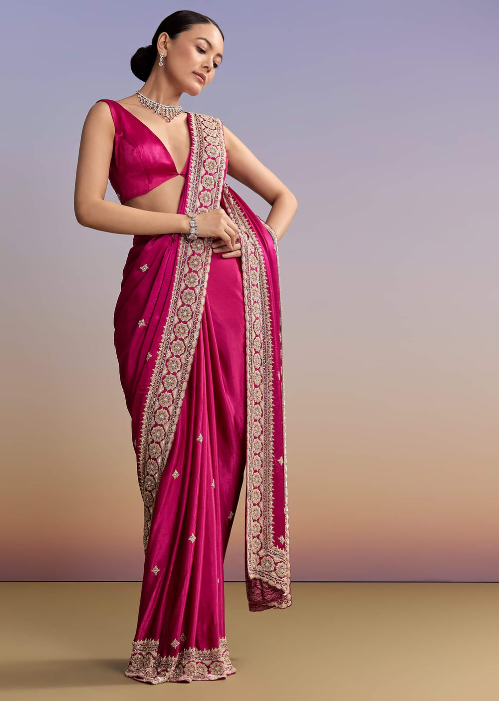 Style with a statement necklace and a softly draped pallu for a graceful, picture-perfect look.