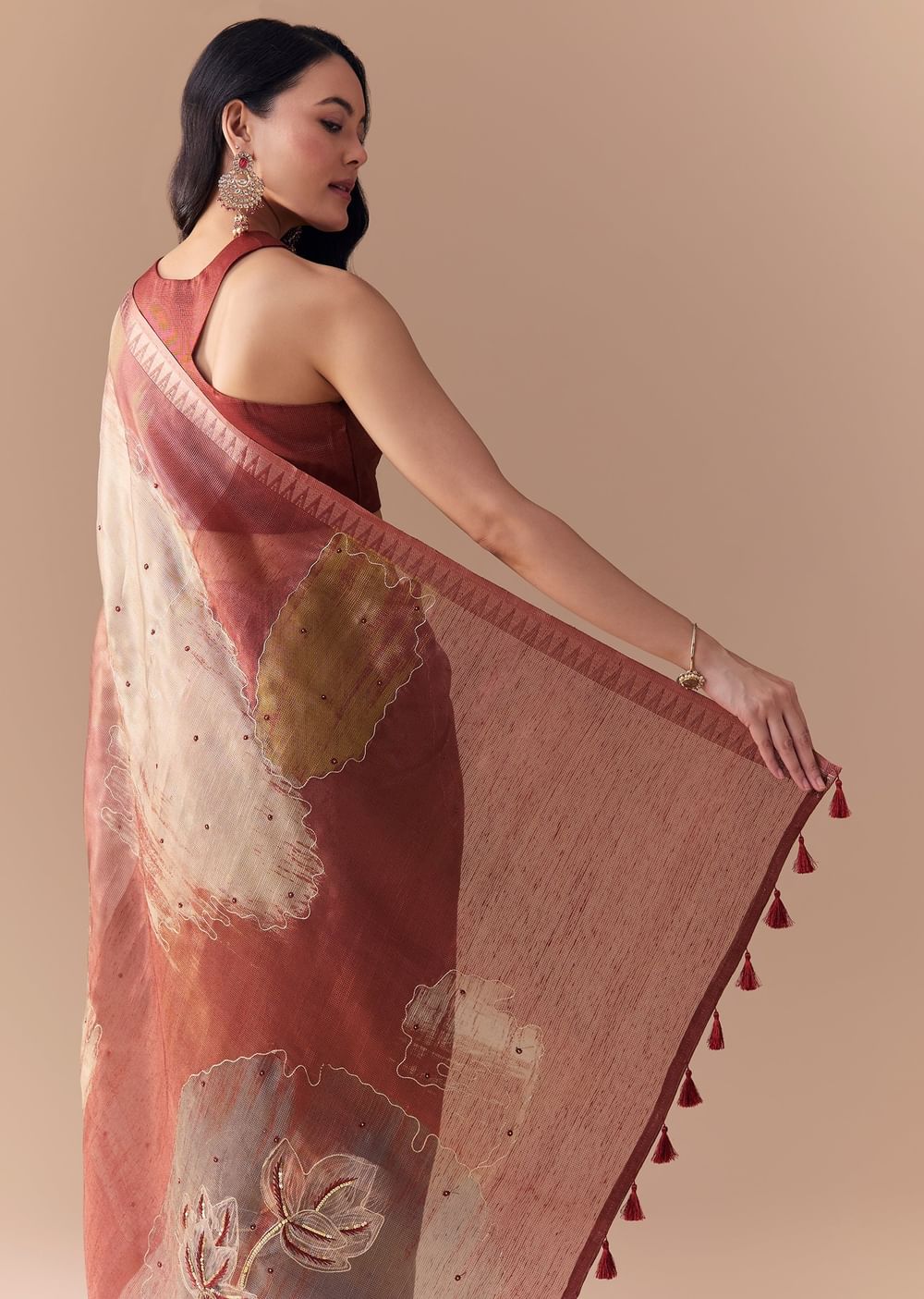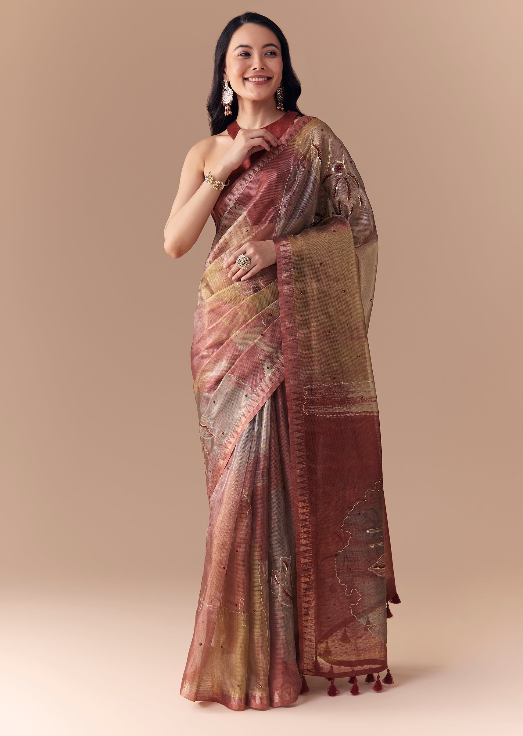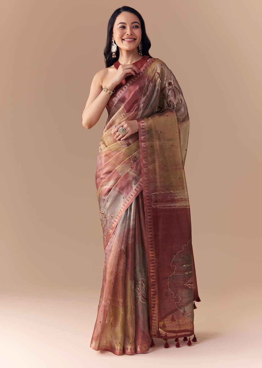 Maroon Shaded Organza Silk Saree with Unstitched Blouse
