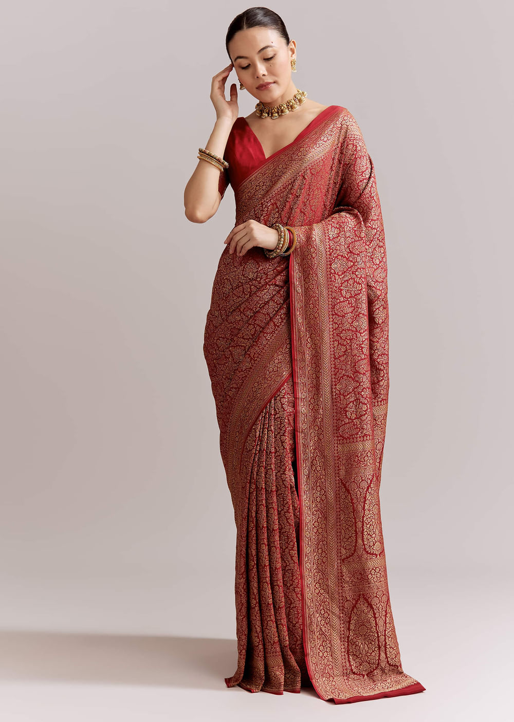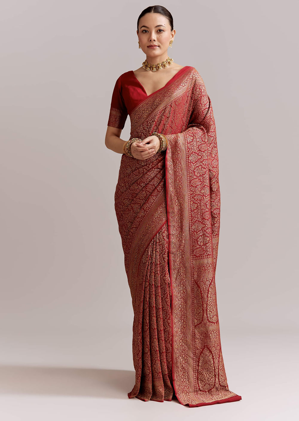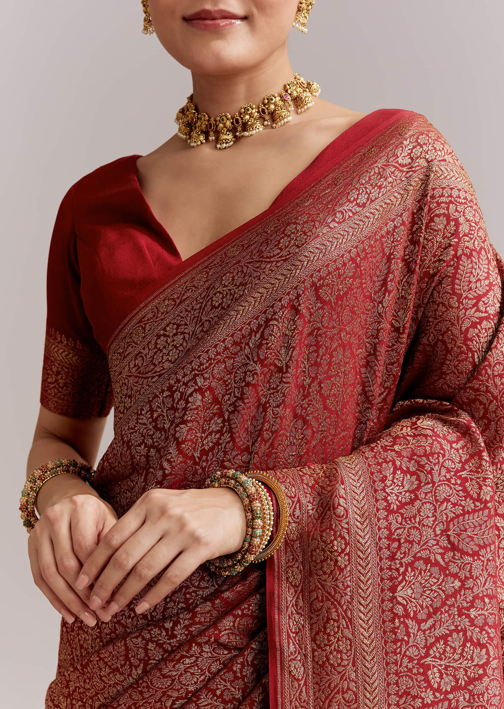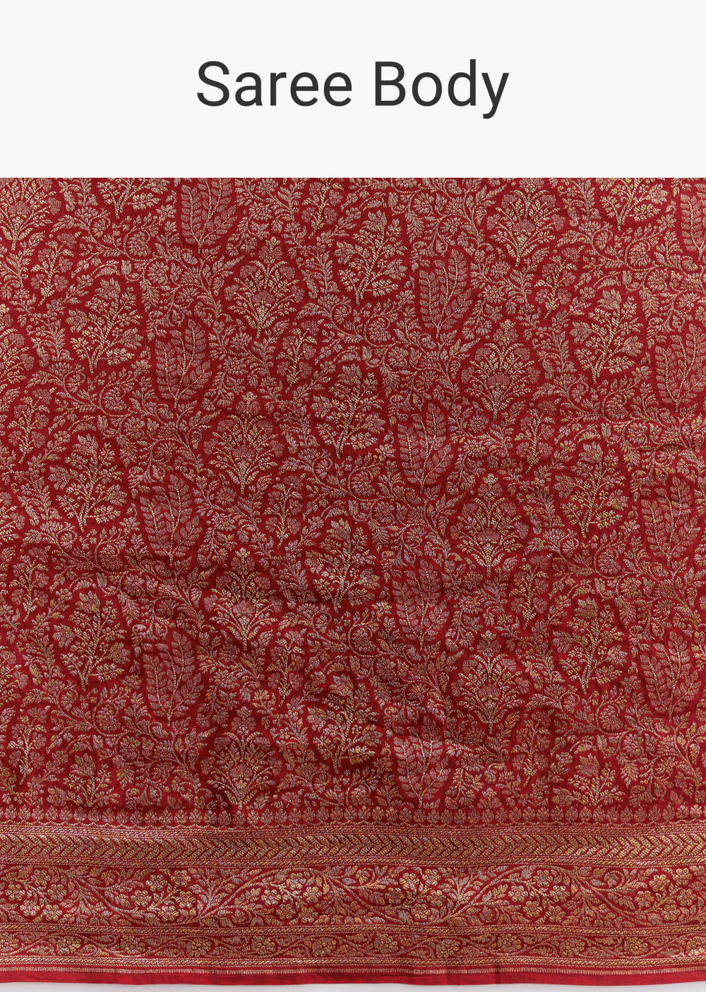 Maroon Silk Woven Brocade Saree With Zari And Floral Border