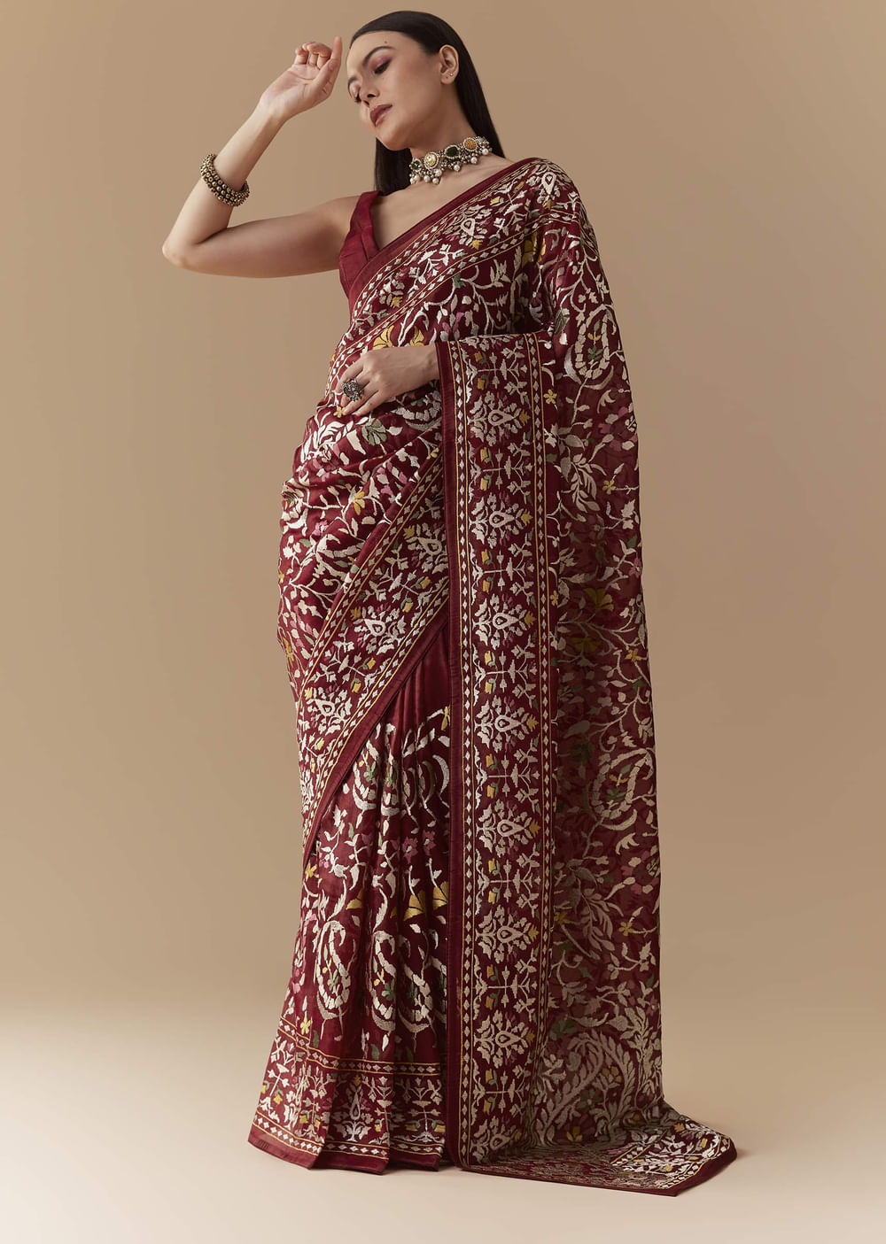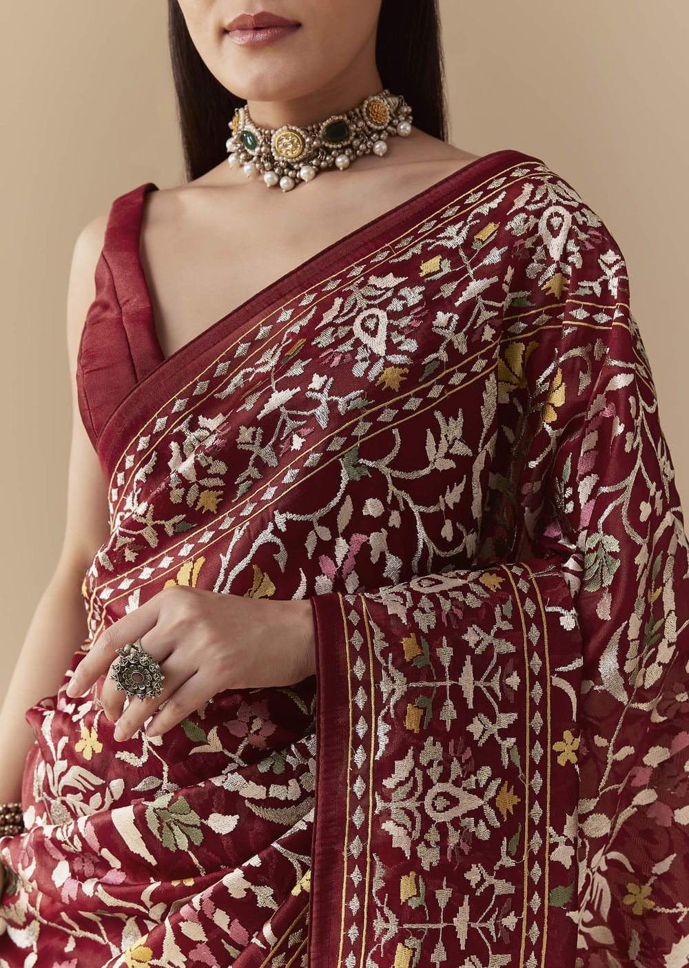 Maroon Tissue Organza Resham Work Saree with Unstitched Blouse