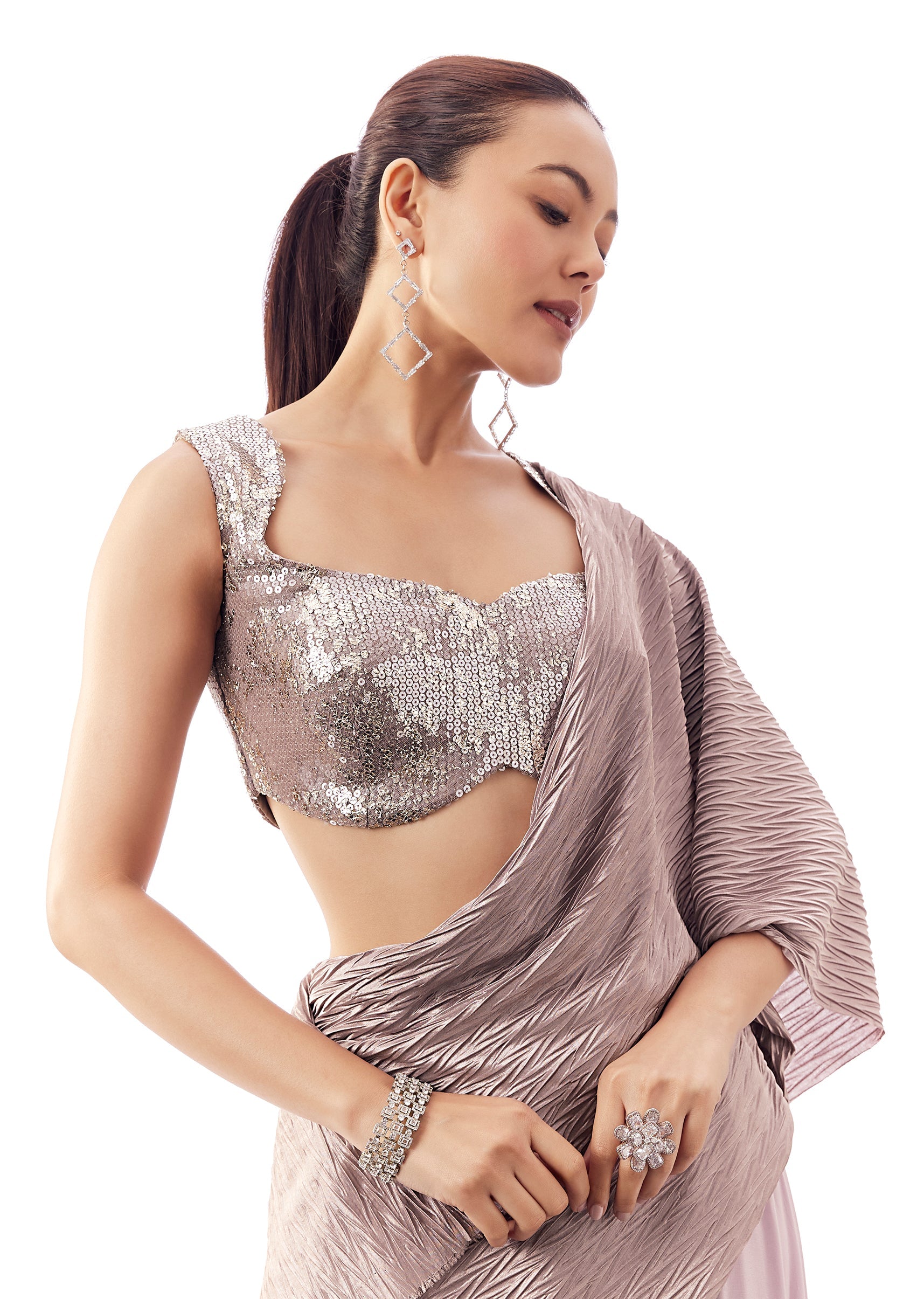 A pastel mauve blouse in fancy fabric with stone work, broad-shoulder styling, and back hook-eye closure. Stitched blouse (1 pc). Soft, modern pick for pastel festive looks. Awarded as the Most Trusted Brand, we're delivering styles you love, just as promised.