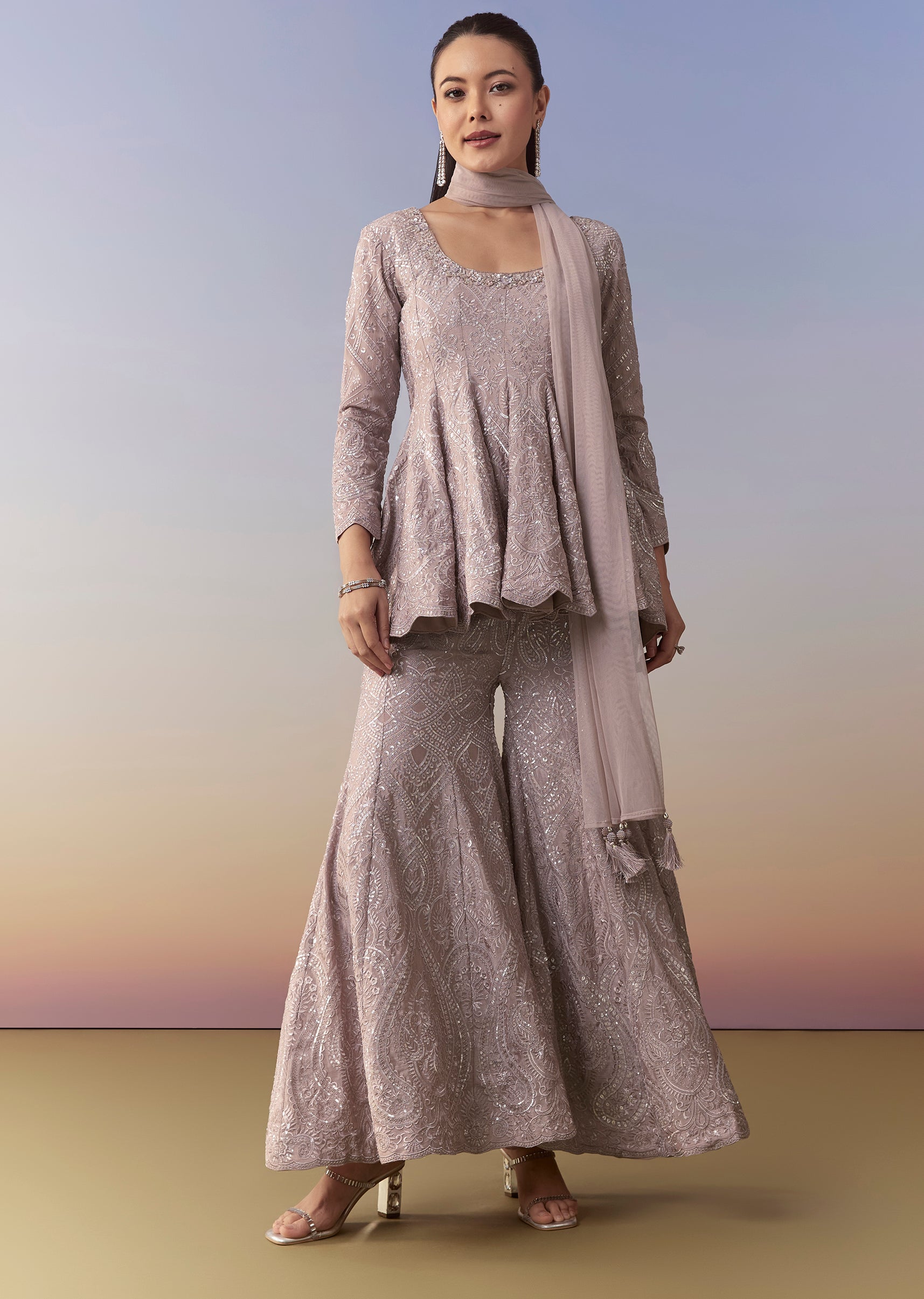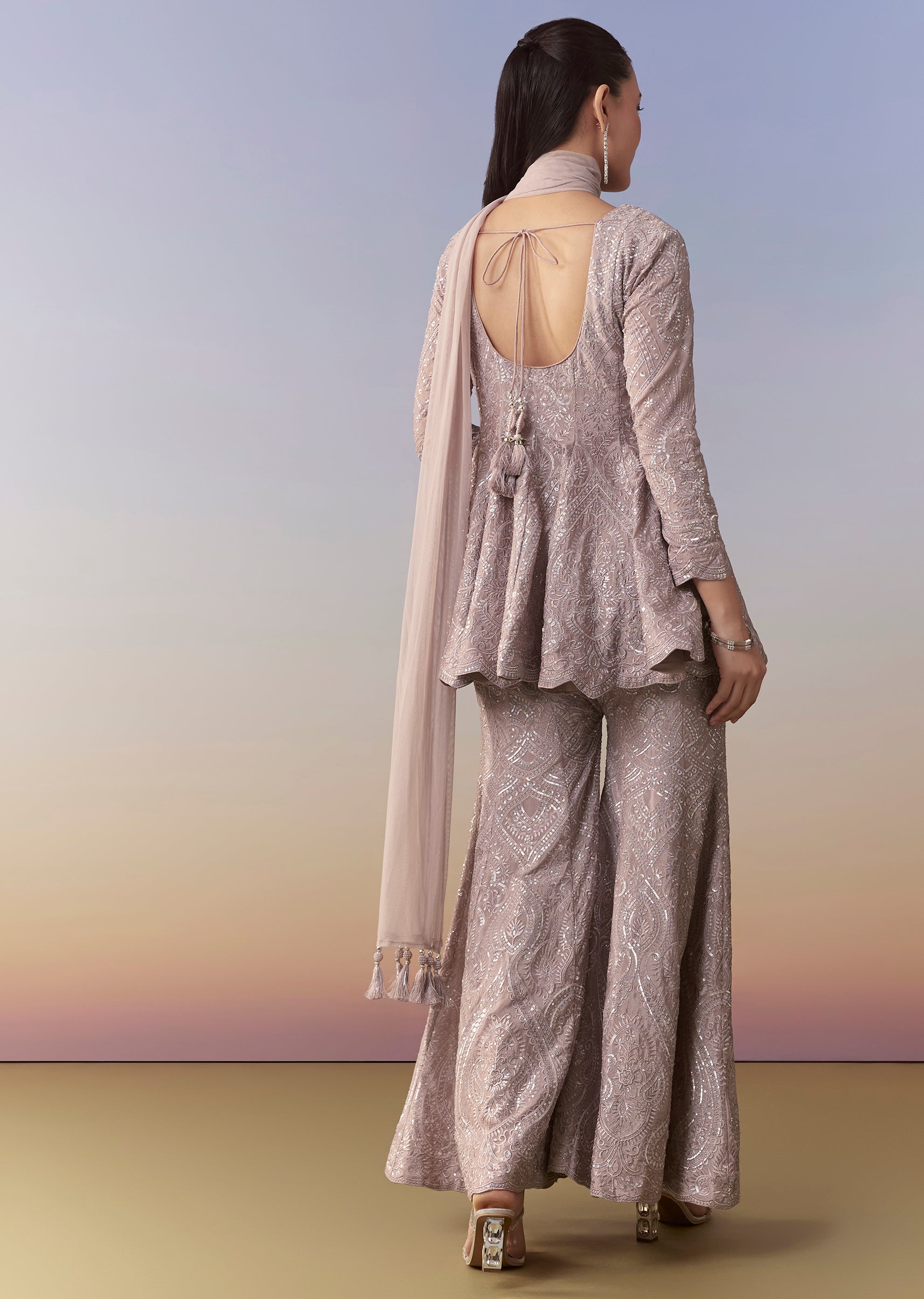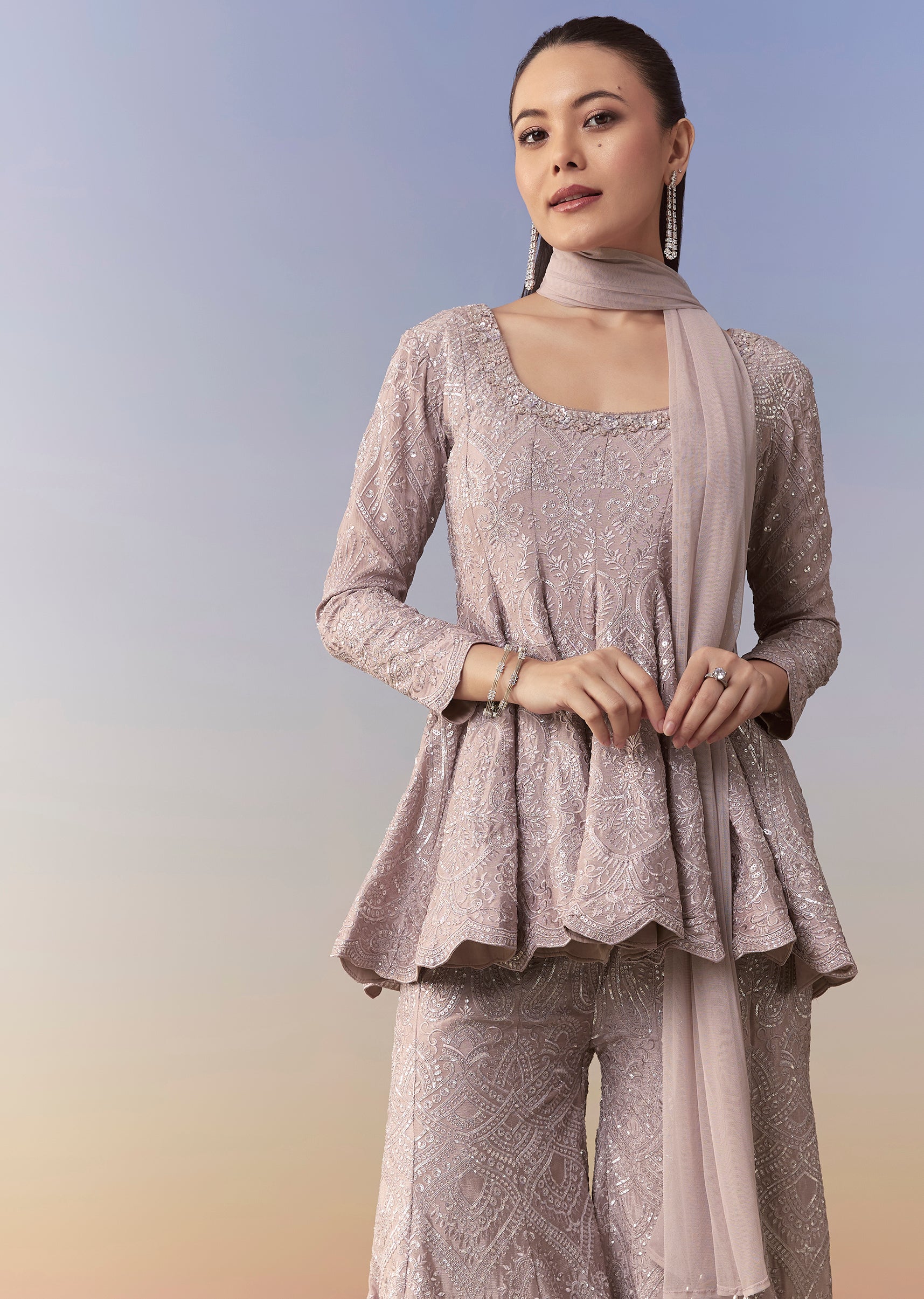Embrace refined elegance with this mauve peplum-style kurta set, beautifully adorned with sequins and resham work that adds a subtle festive shimmer. The kalidaar palazzo enhances the silhouette with graceful... More Product Details