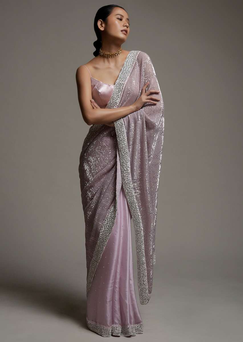 Mauve pink half and half saree in satin crepe with a crushed sequins pallu.It is embellished with scattered kundan and an elaborate border design adorned with zardosi and kundan work.It comes with a matching unstitched blouse in satin crepe with similar embellishments.The blouse embellishments may vary.The length of the blouse is 1.04 meters. Awarded as the Most Trusted Brand, we're delivering styles you love, just as promised.
