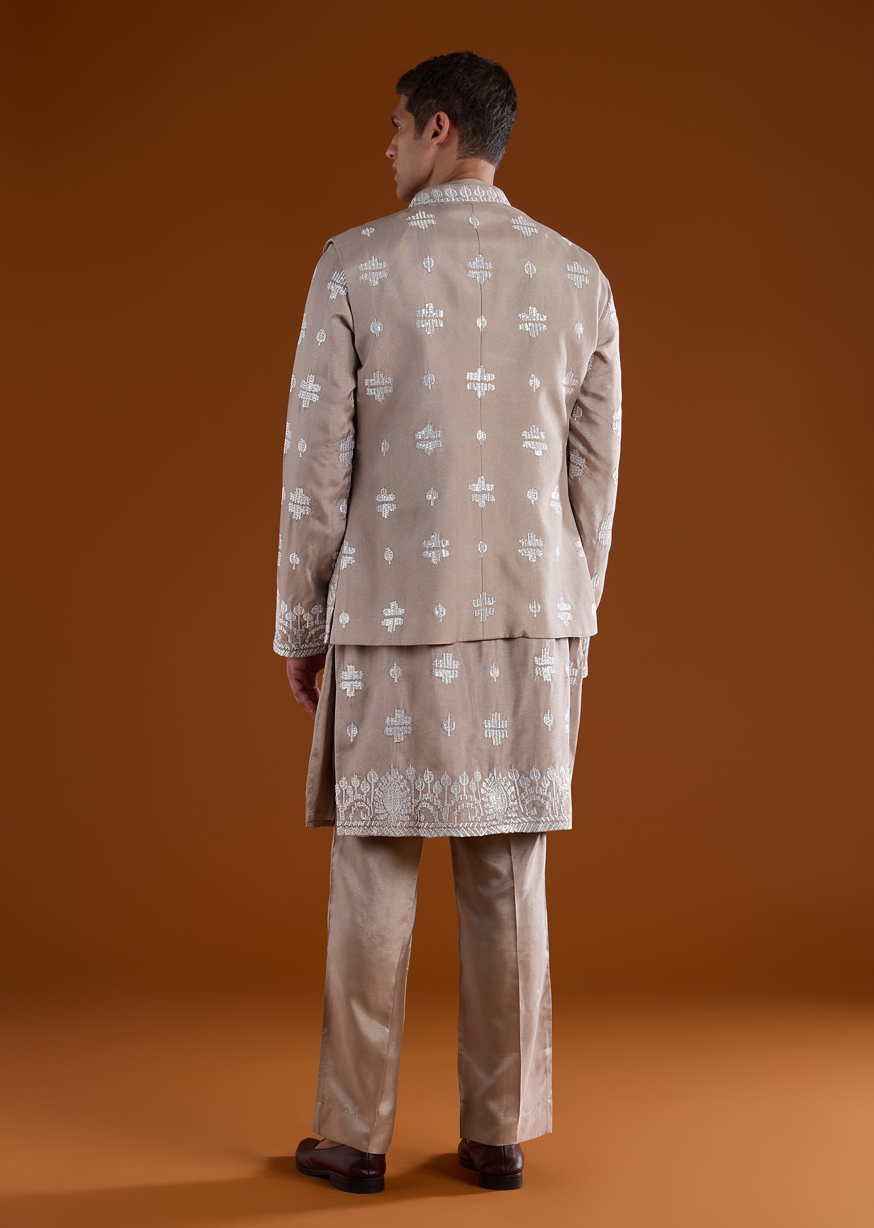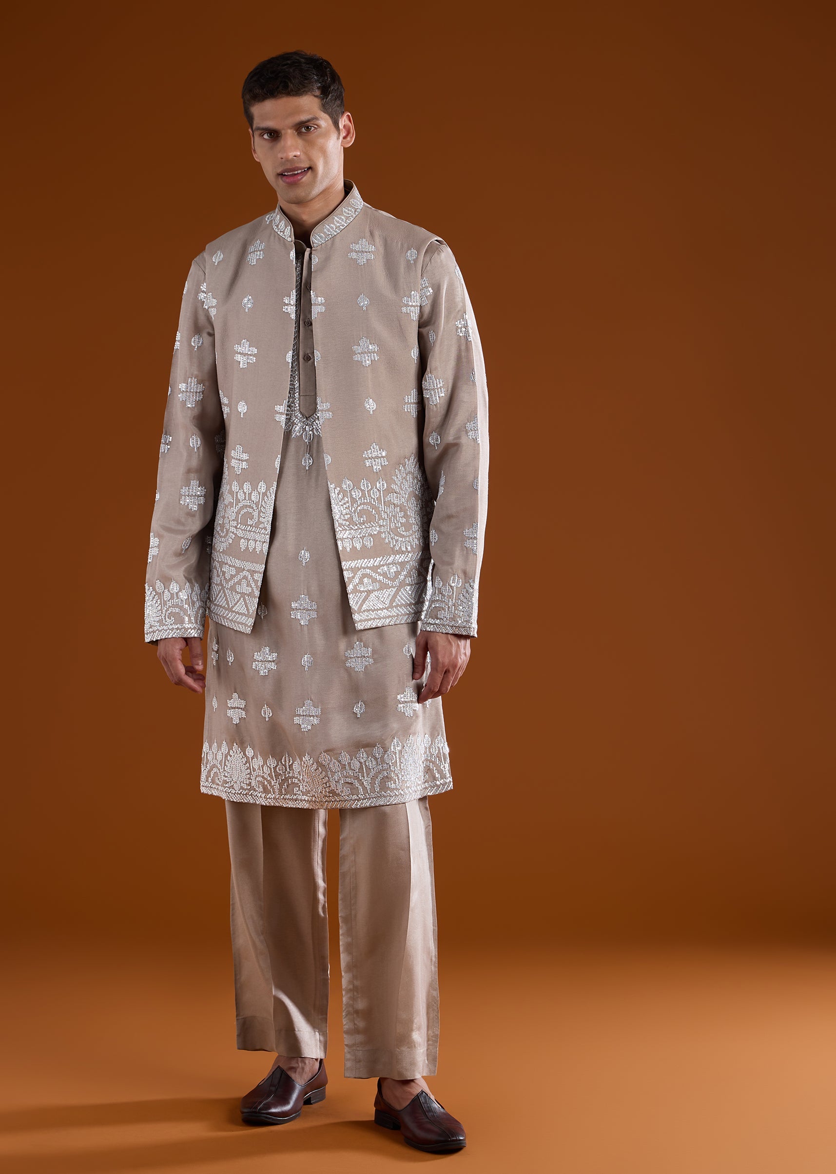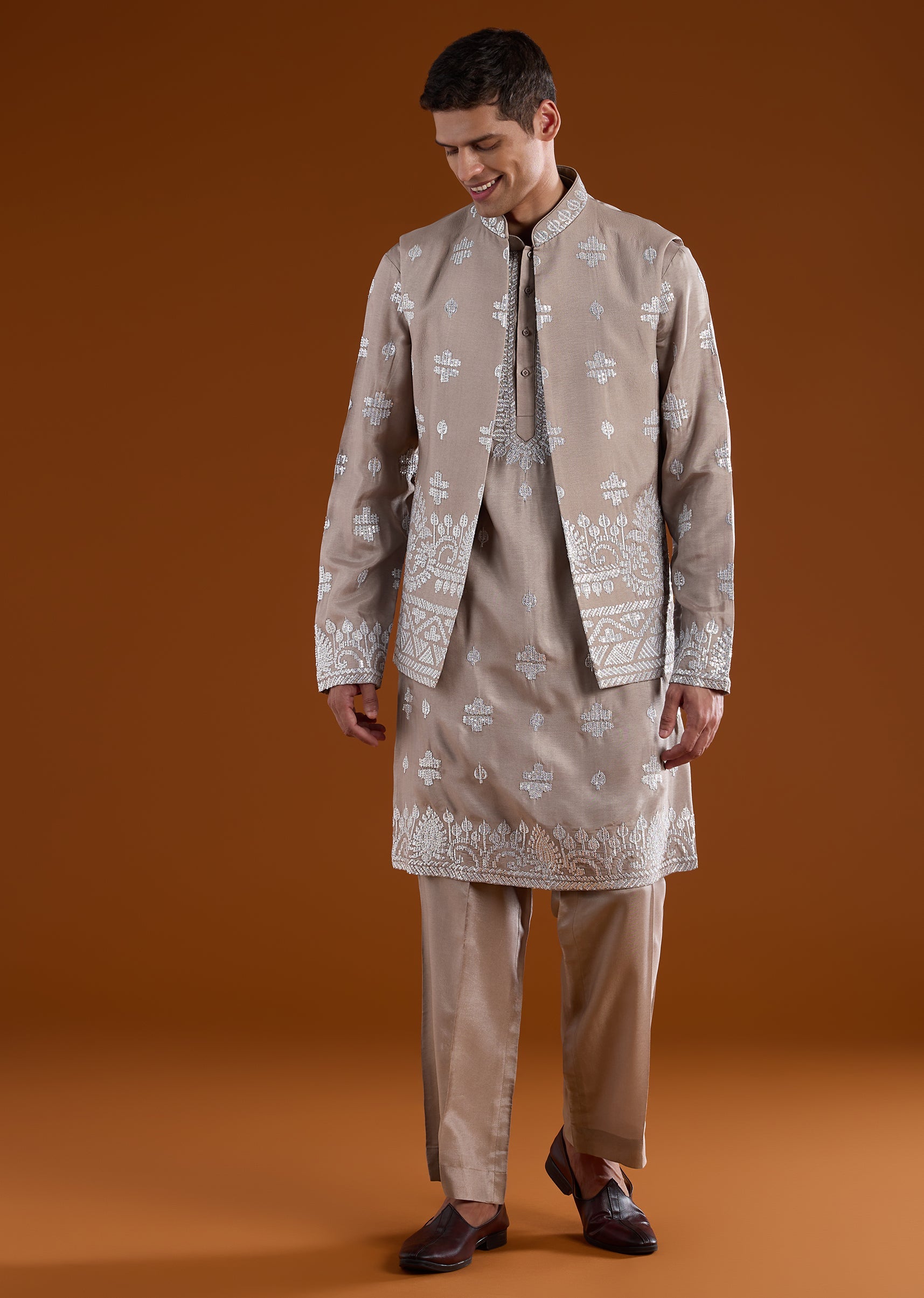 Elegant and wedding-ready, this mauve kurta jacket set is crafted in a rich silk-blend fabric for a refined festive look. The kurta features a mandarin collar, full sleeves, and side slits, paired with an embroidered jacket detailed with zari and sequin accents for subtle shimmer. Finished with straight-fit trousers and a partially elasticated waist, this set is ideal for groomsmen and special wedding celebrations. Awarded as the Most Trusted Brand, we're delivering styles you love, just as promised.
