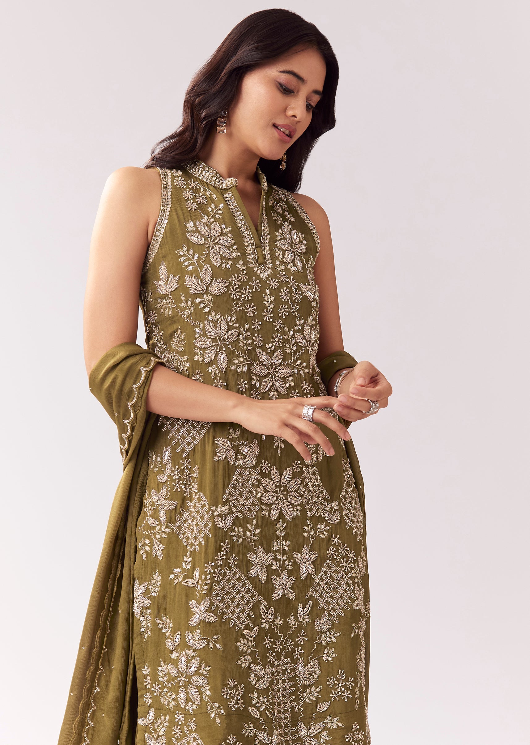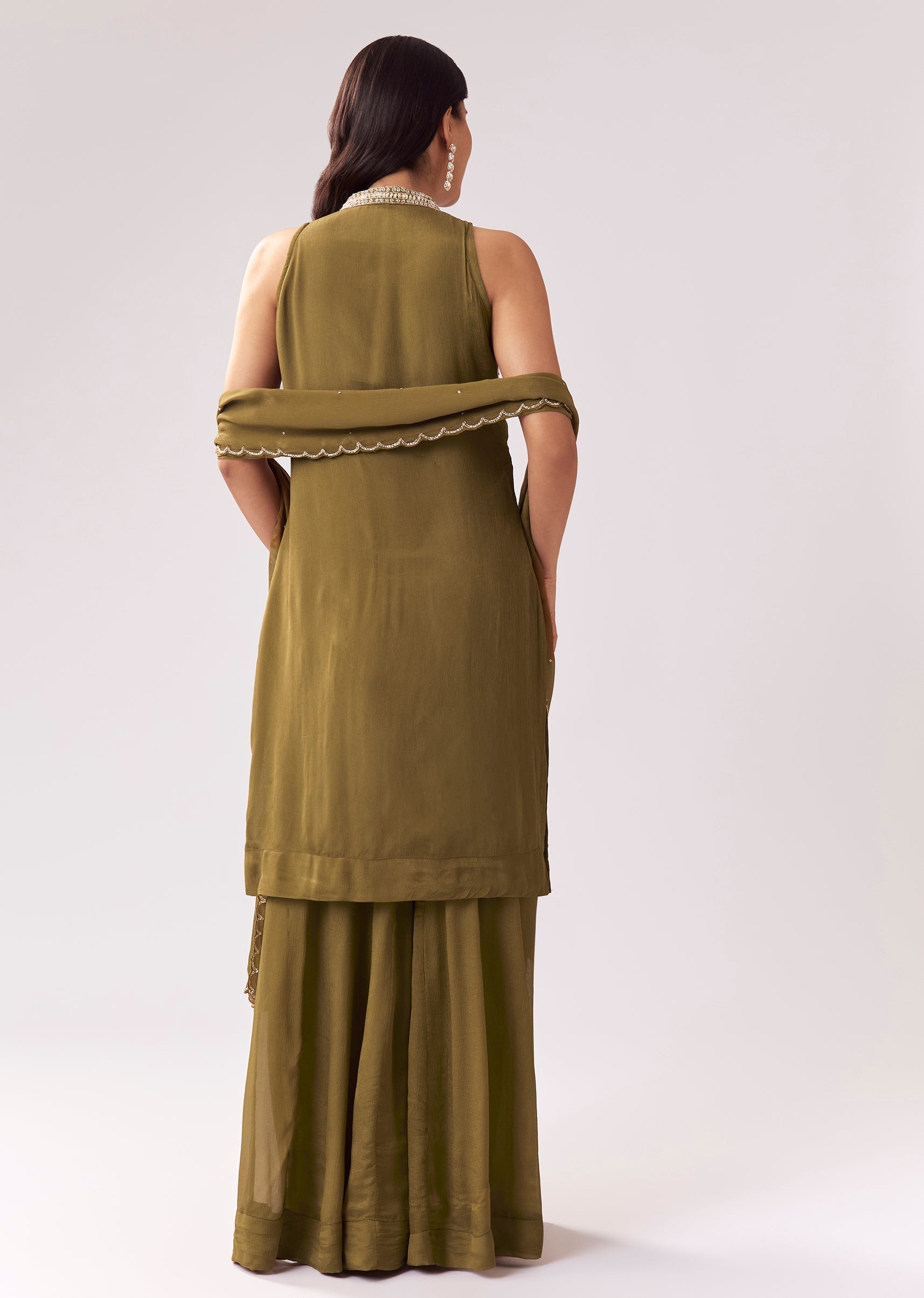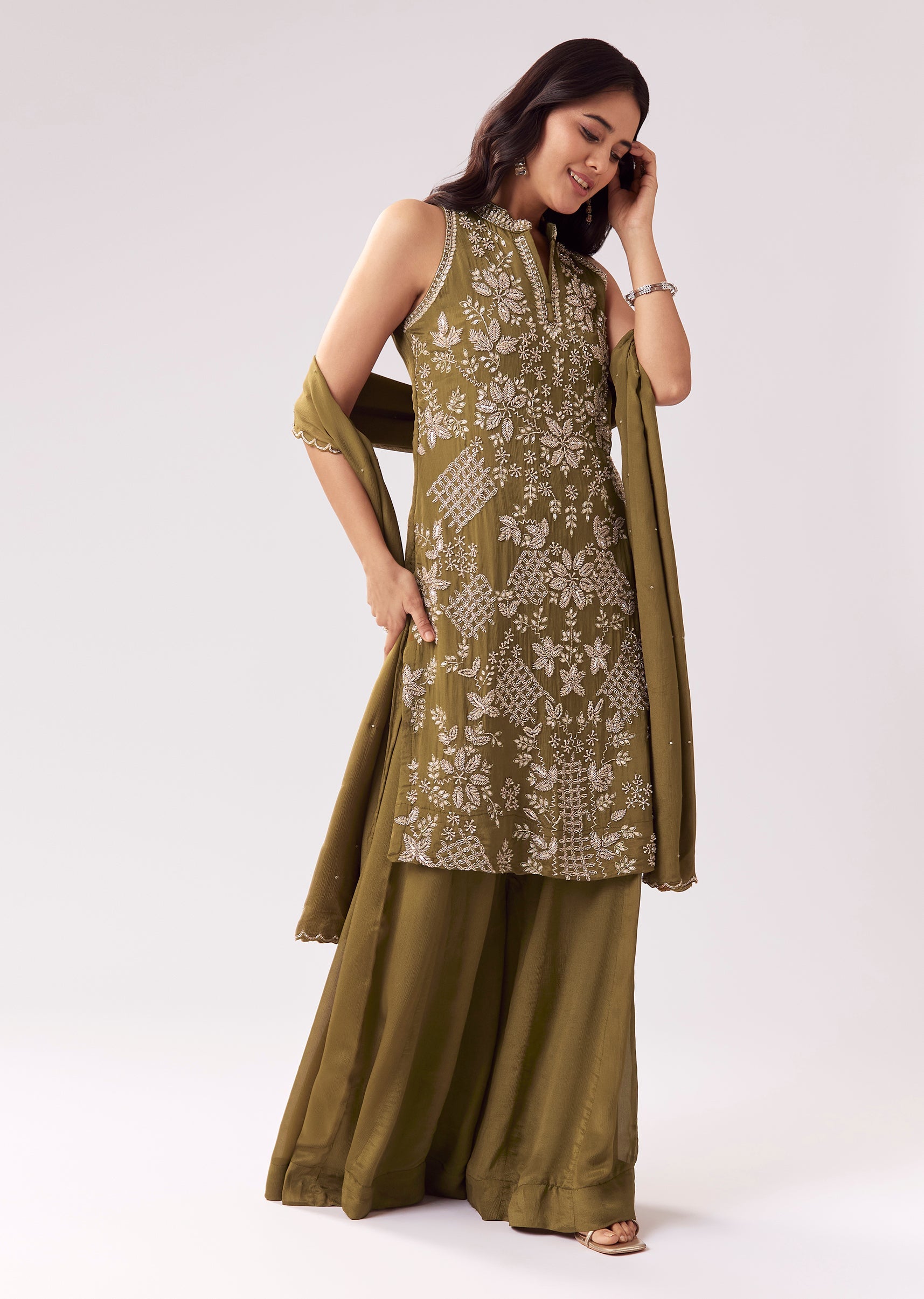 Mehendi Green Chinon Palazzo Suit With Beadwork