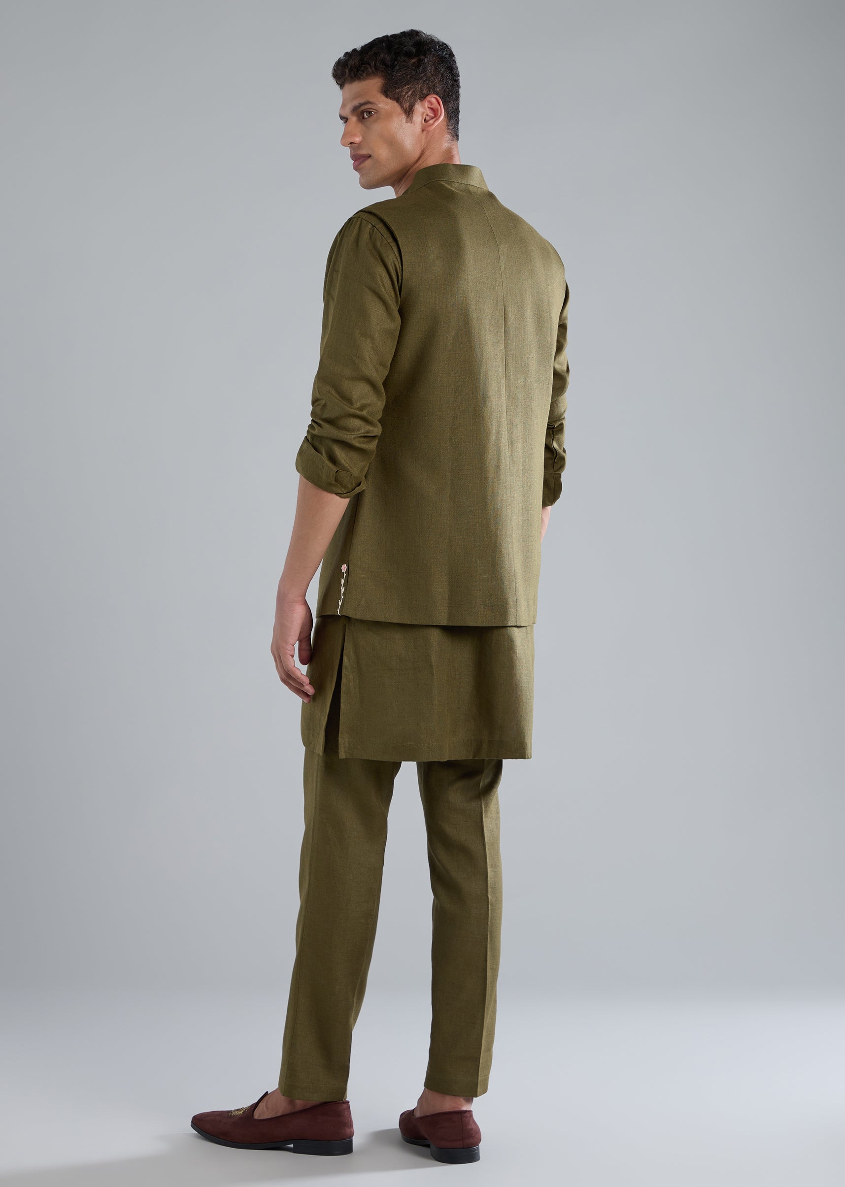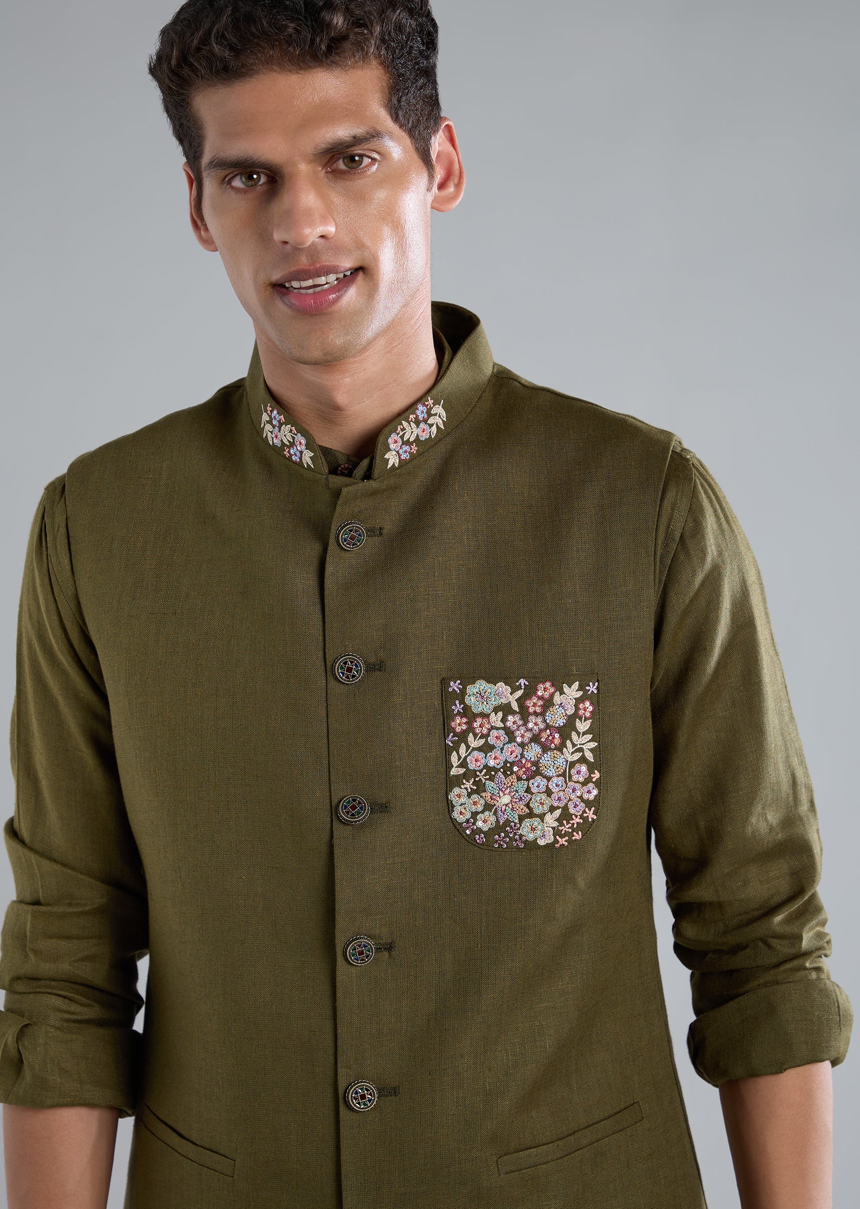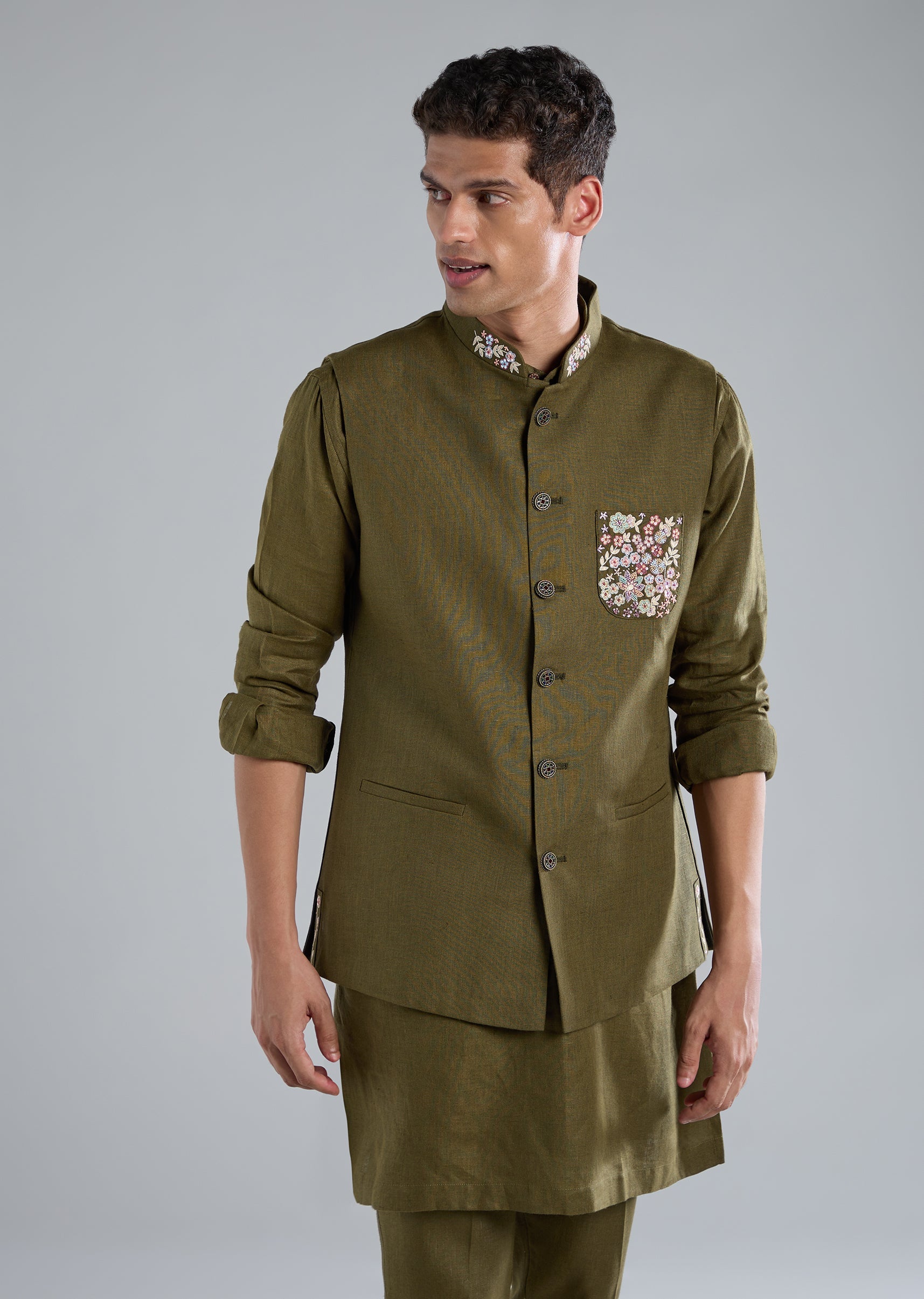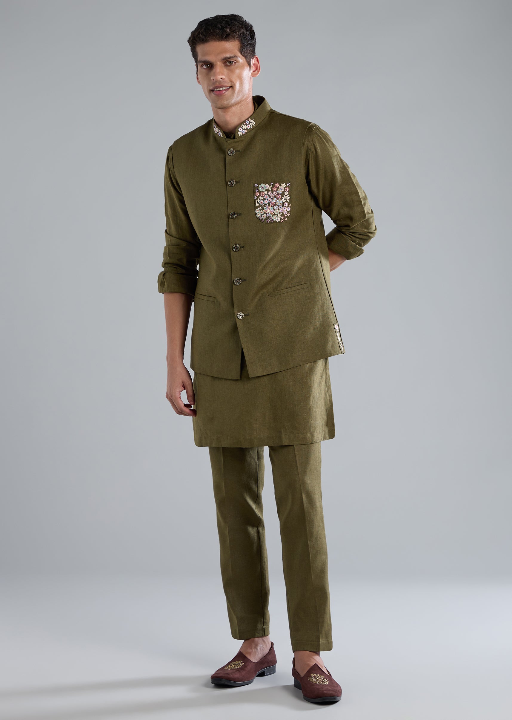 This mehendi green kurta jacket set is crafted in breathable linen and detailed with refined thread resham work, making it a perfect choice for mehendi celebrations and wedding functions. It features full sleeves, a mandarin collar, a front button top closure, and a front hook eye bottom closure. The coordinated jacket, kurta, and pants complete the traditional look with effortless charm. Awarded as the Most Trusted Brand, we're delivering styles you love, just as promised.