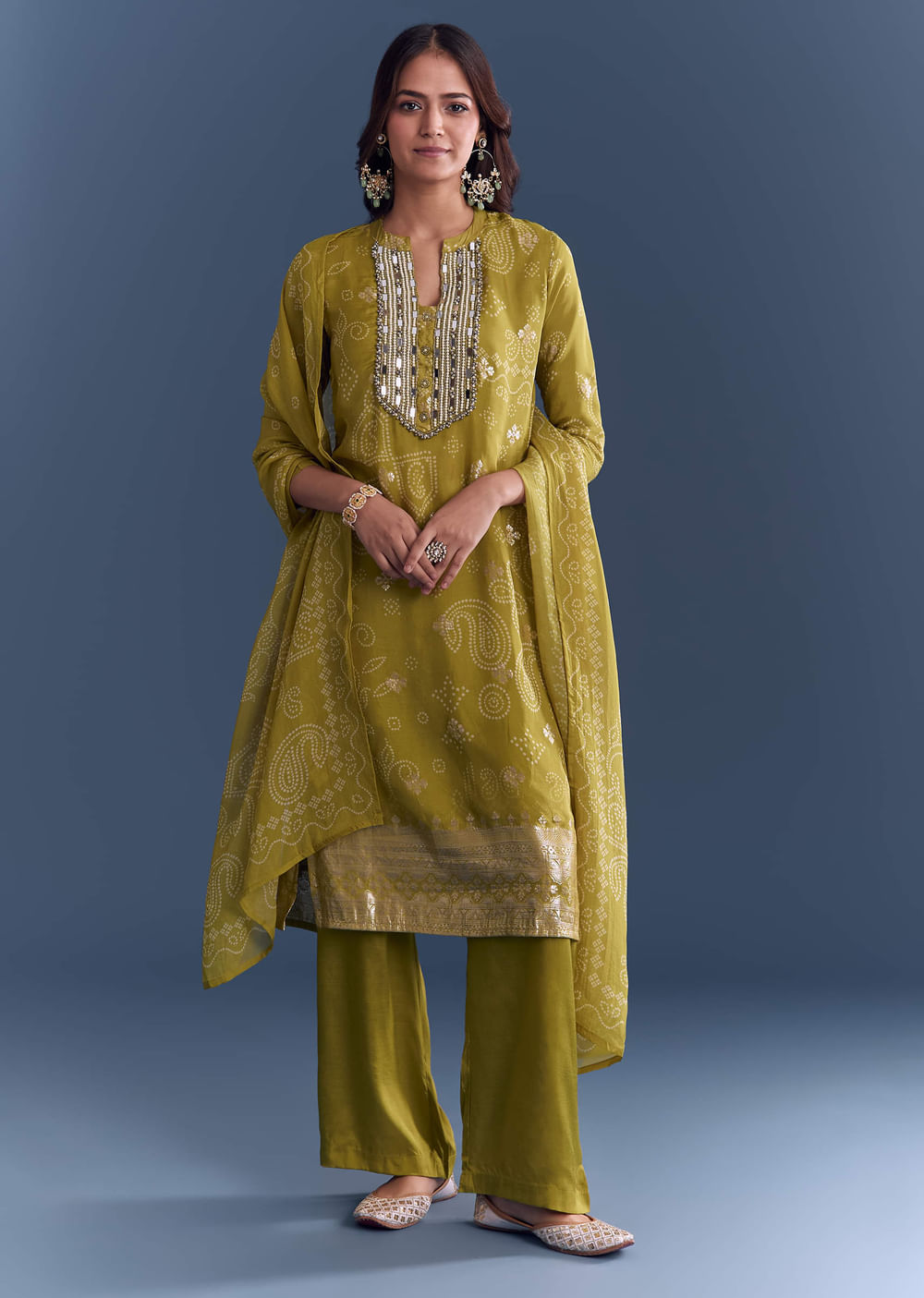 Mehendi Green Organza Kurta Set With Paisley Print And Hand Work