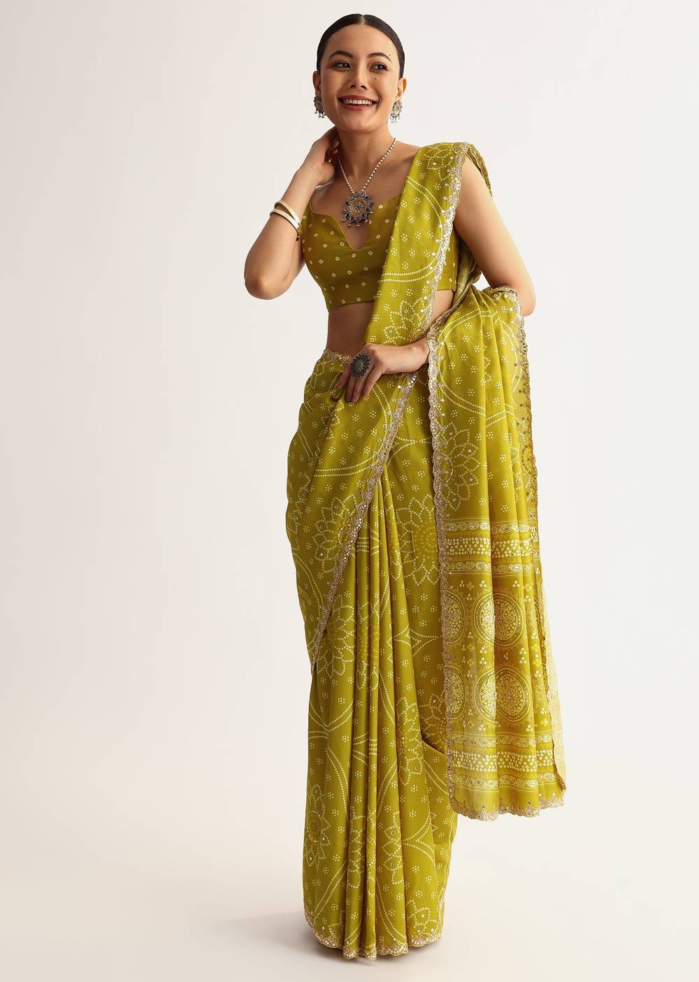 Mehendi Green Patola Printed Georgette Saree With Scallop Border