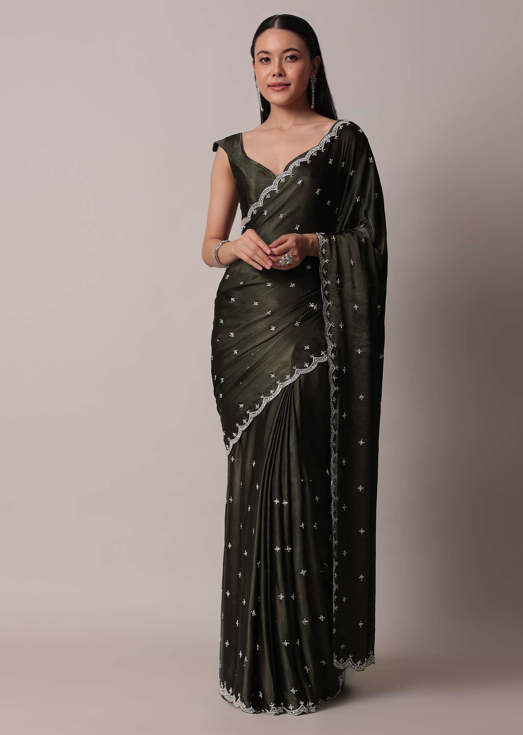 Mehendi Green Saree In Satin Chinon With Scallop Stone Work Border And Unstitched Blouse Piece