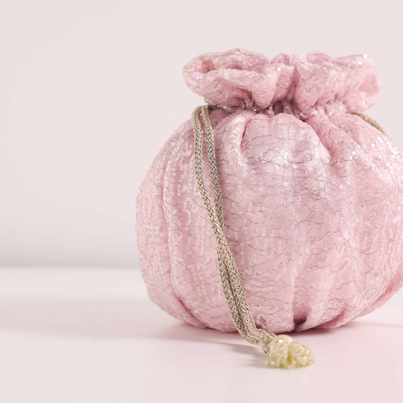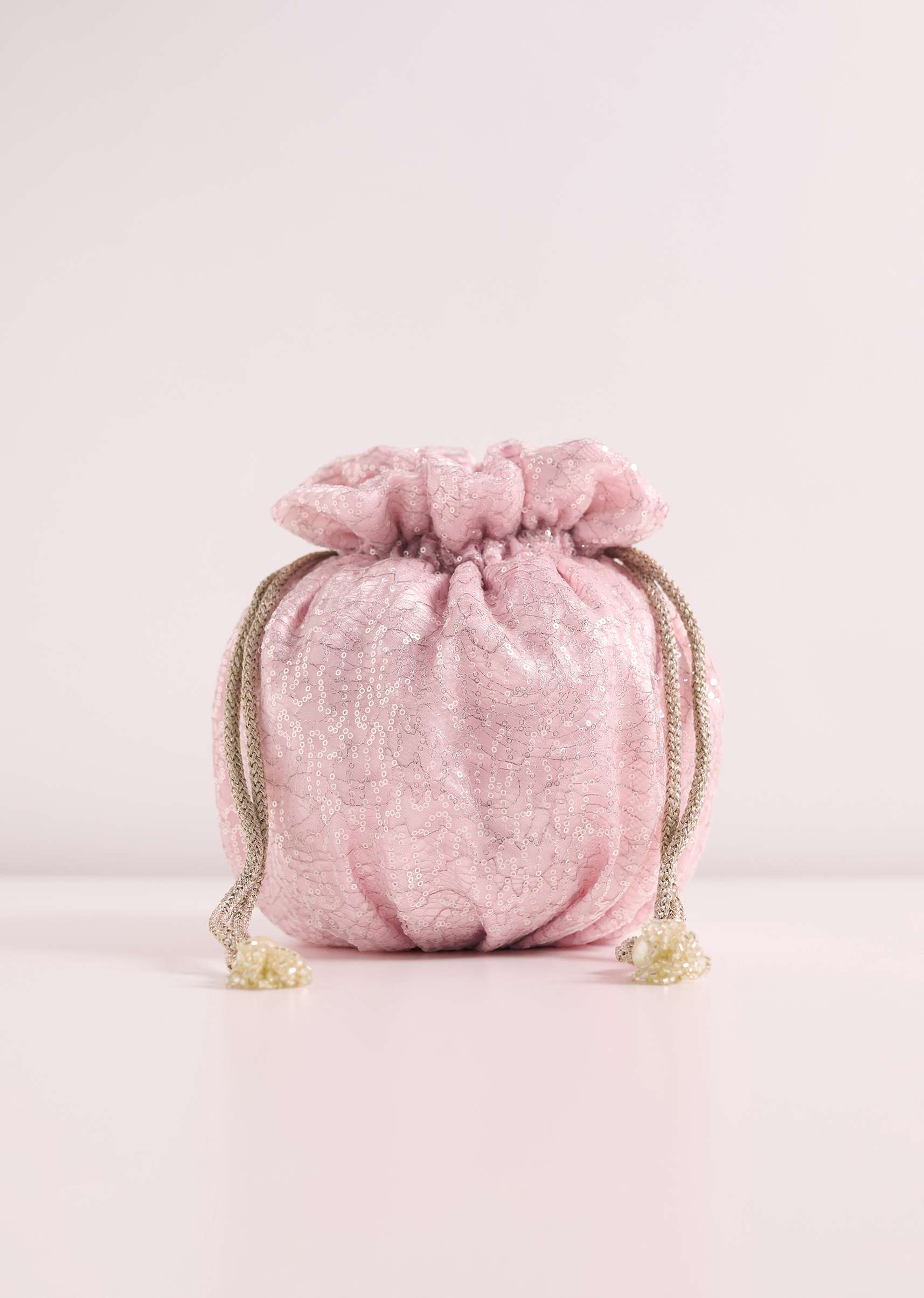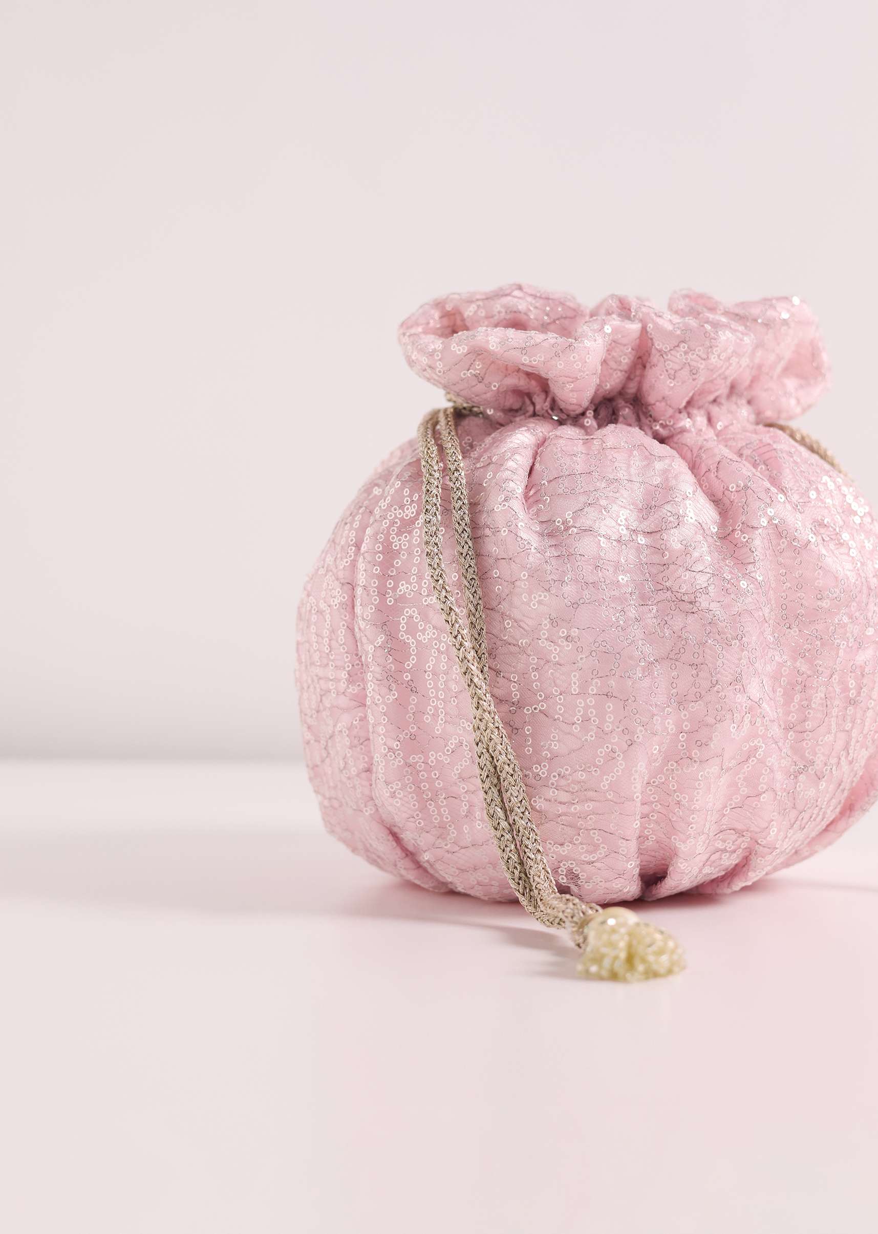 Metallic Pink Sequins Potli Bag With Pearl Handle