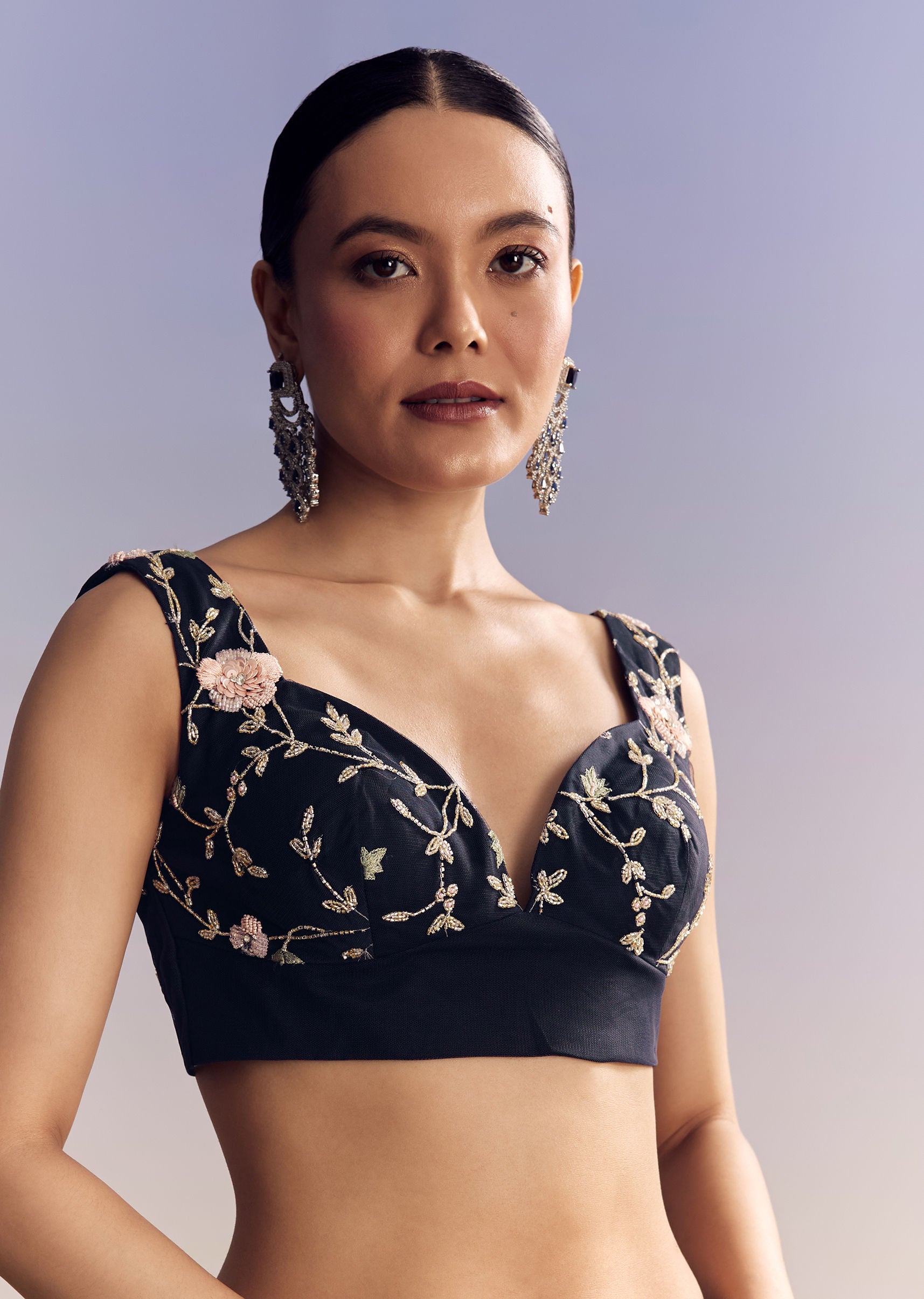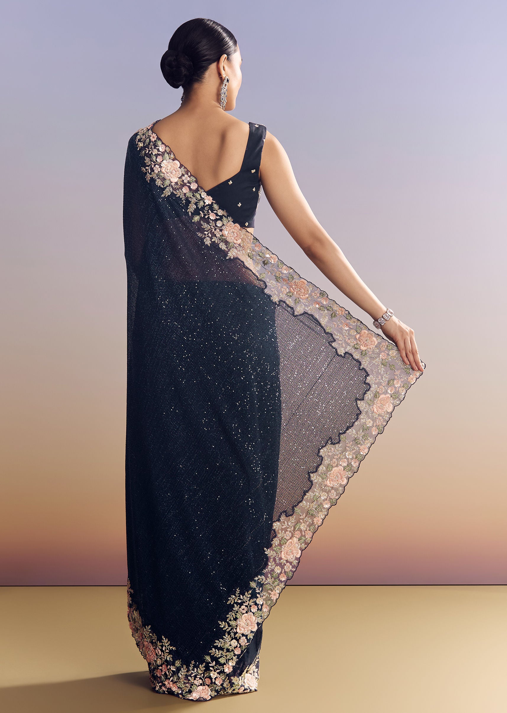 Midnight Blue Half And Half Saree With Floral Sequin Embroidery