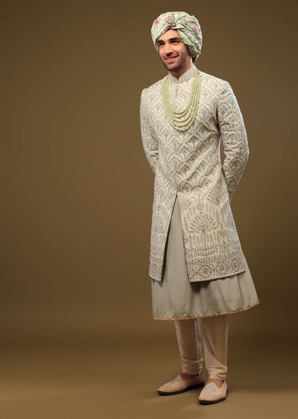 Be the dapper groom at your wedding when you adorn this ultra-stylish attire from Kalki. The outfit will elevate your look when paired with a mala, juttis and a safa.