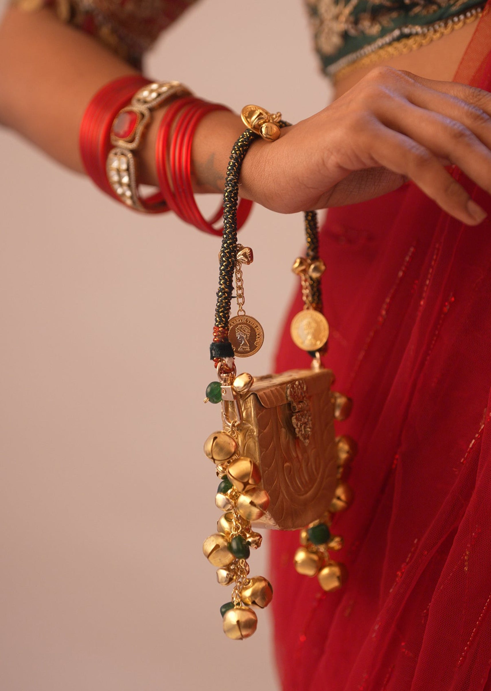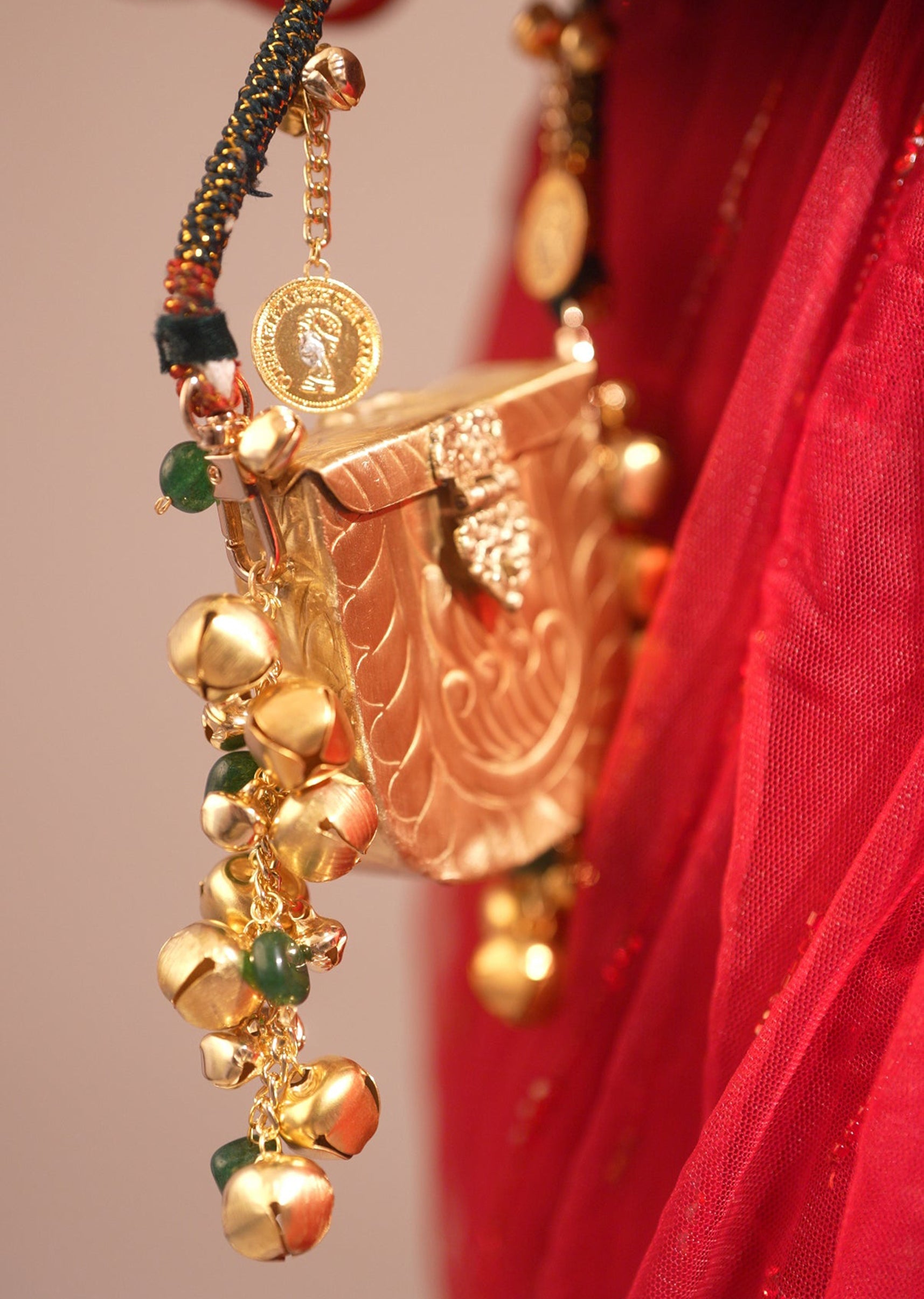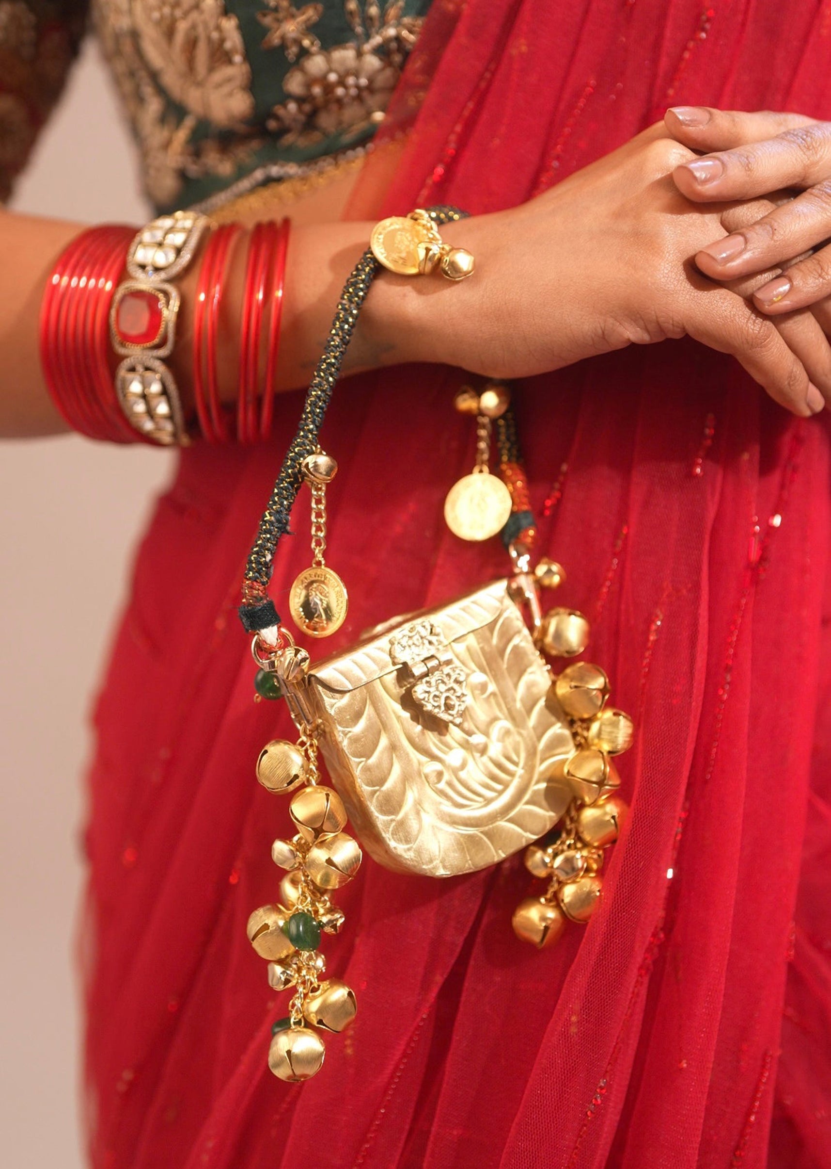 Small in size but big on style, this gold-toned mini potli is designed for effortless festive charm. Ideal for carrying just the essentials, it’s a playful yet elegant accessory for celebrations. Awarded as the Most Trusted Brand, we're delivering styles you love, just as promised.