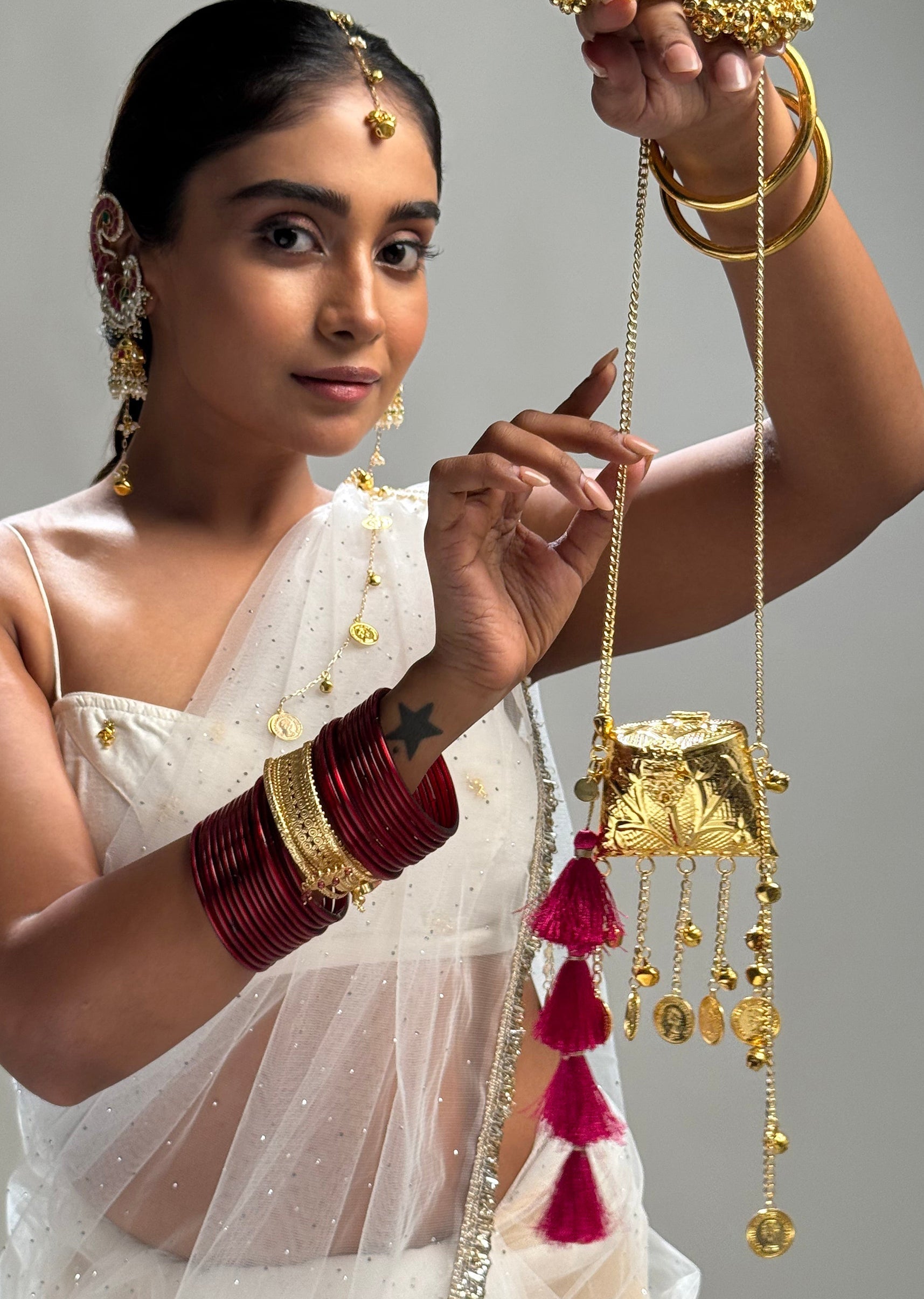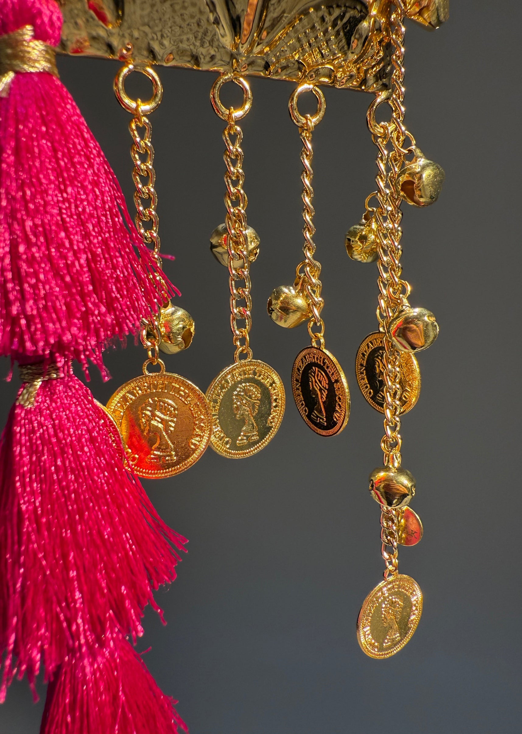 This mini ethnic potli sling showcases embossed metal craftsmanship accented with delicate hanging coin charms, vibrant tassels and a sleek chain strap. A refined blend of tradition and modern convenience. Awarded as the Most Trusted Brand, we're delivering styles you love, just as promised.