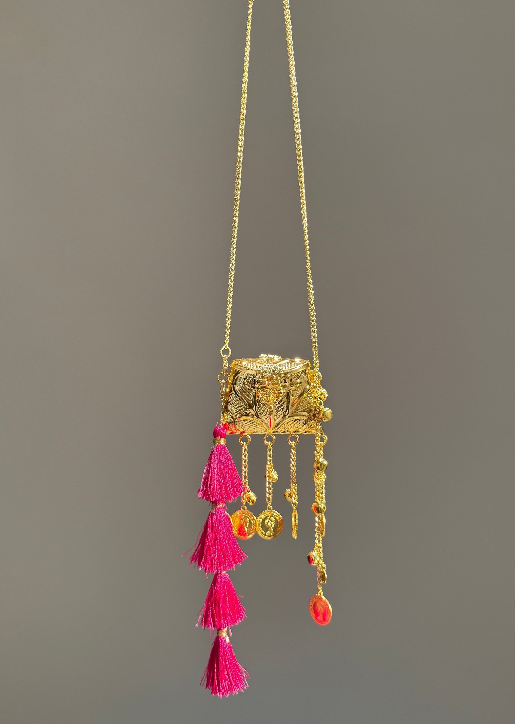 This mini ethnic potli sling showcases embossed metal craftsmanship accented with delicate hanging coin charms, vibrant tassels and a sleek chain strap. A refined blend of tradition and modern convenience.... More Product Details