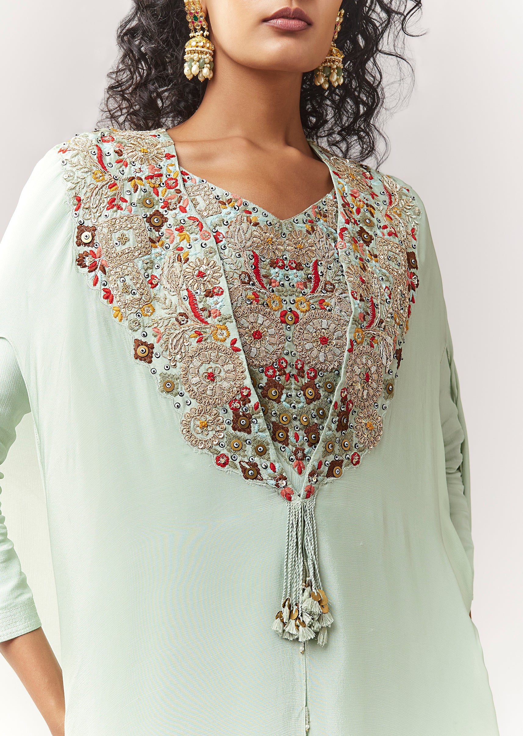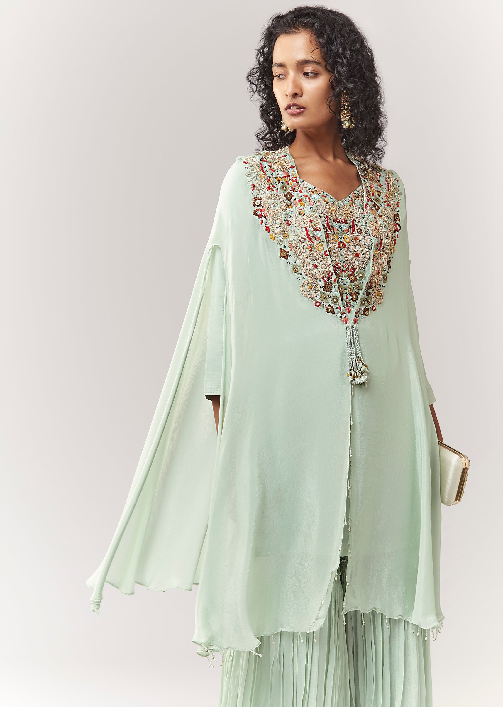 A pastel festive set in chinon featuring thread and zardosi work on the kurta and cape. Styled with a V-neckline and front hook-eye closure, plus 3/4 sleeves. Comes as a... More Product Details