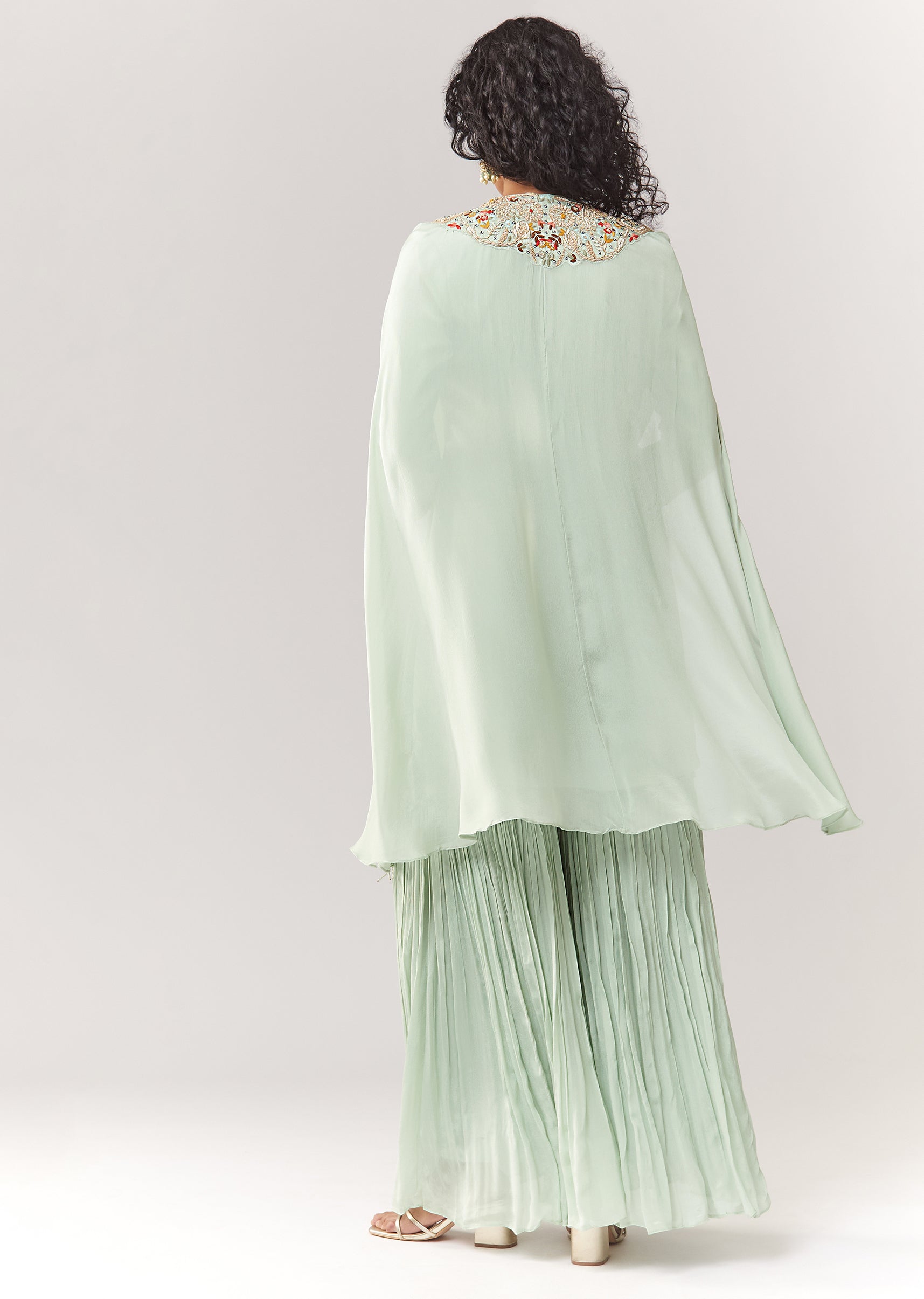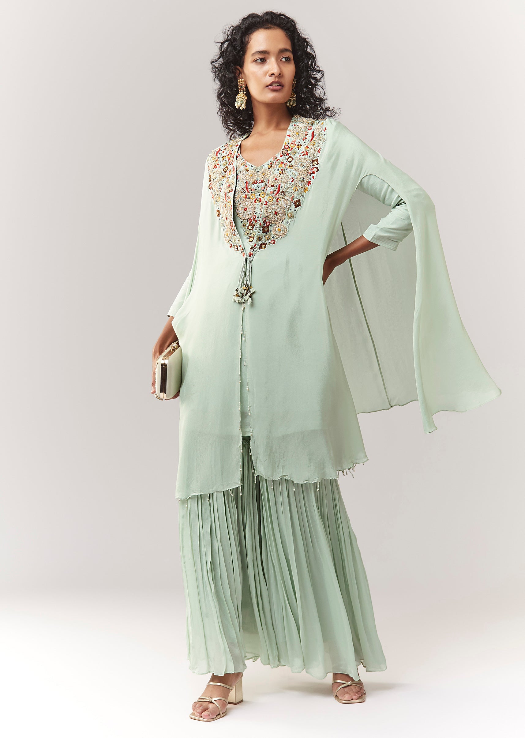 Mint Blue Kurta Cape Sharara Set With Thread And Zardosi Work