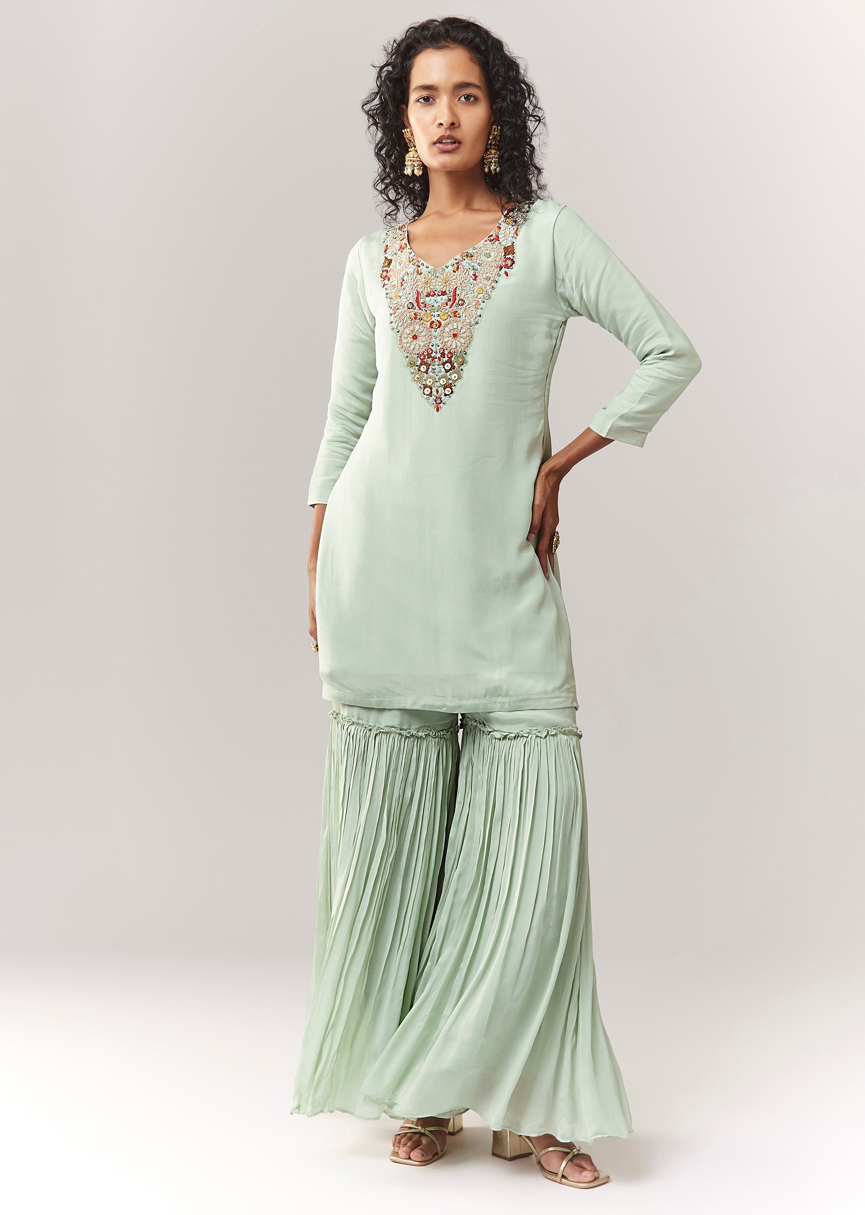 A pastel festive set in chinon featuring thread and zardosi work on the kurta and cape. Styled with a V-neckline and front hook-eye closure, plus 3/4 sleeves. Comes as a 3-piece set with a mid-waist elasticated sharara for flow and comfort. Awarded as the Most Trusted Brand, we're delivering styles you love, just as promised.