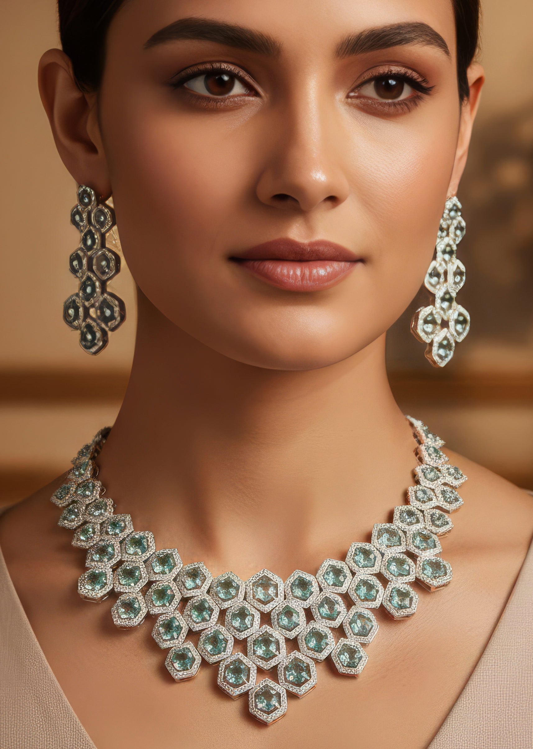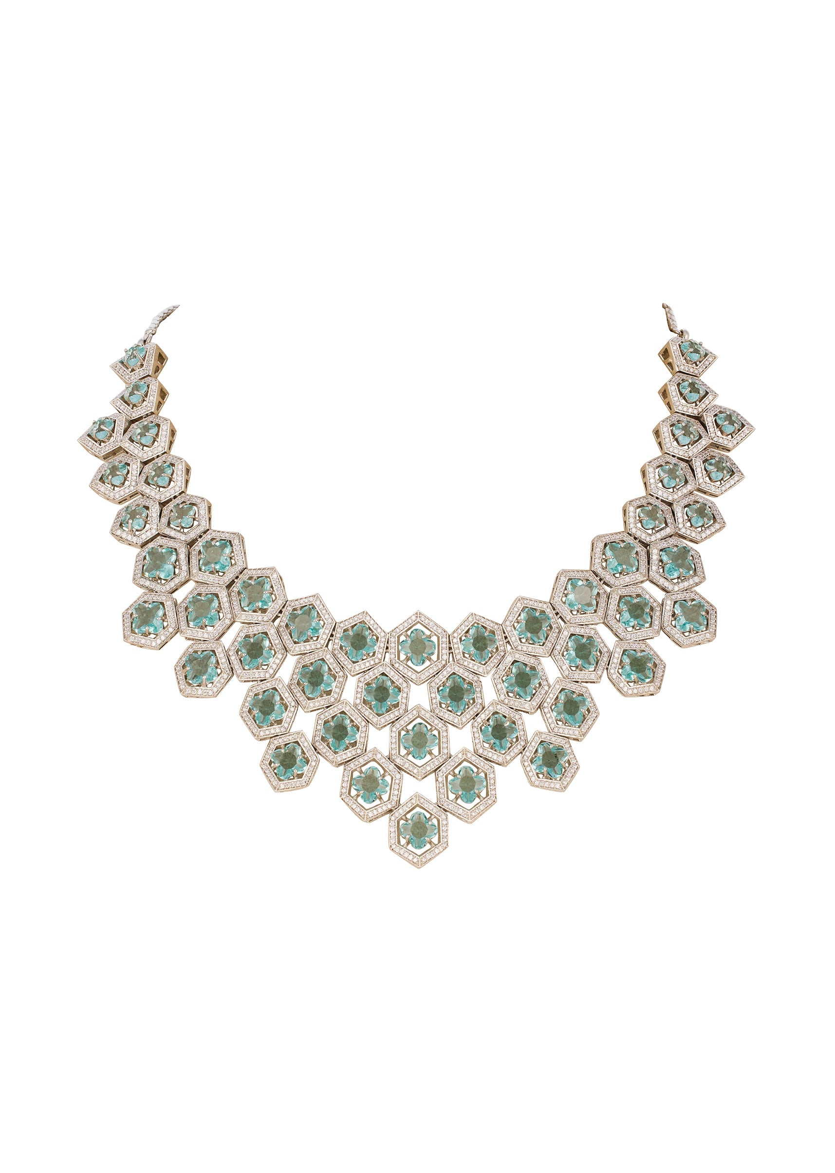 Mint Blue Rhodium Plated Cz Diamond Necklace Set with Semi Precious Stones