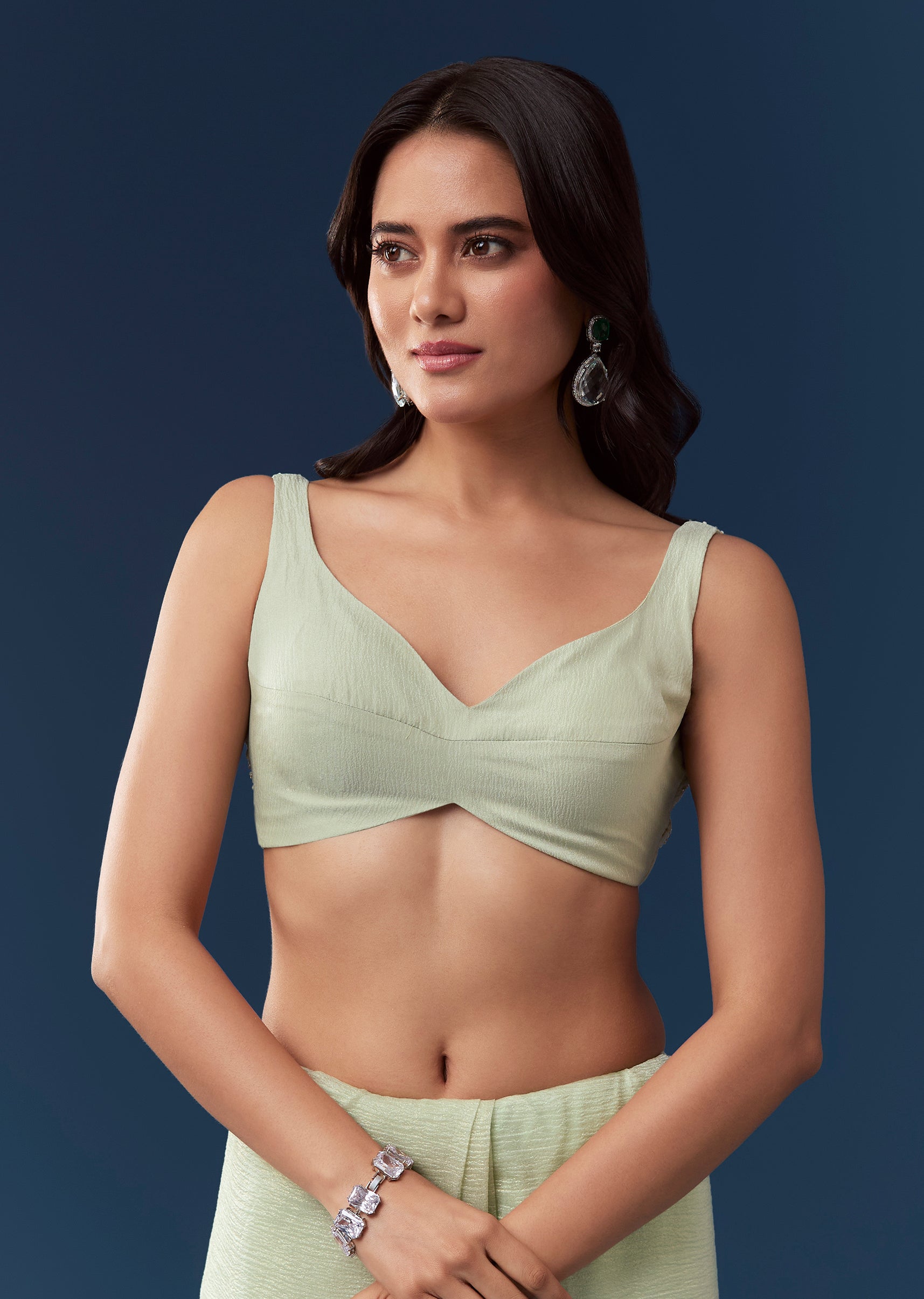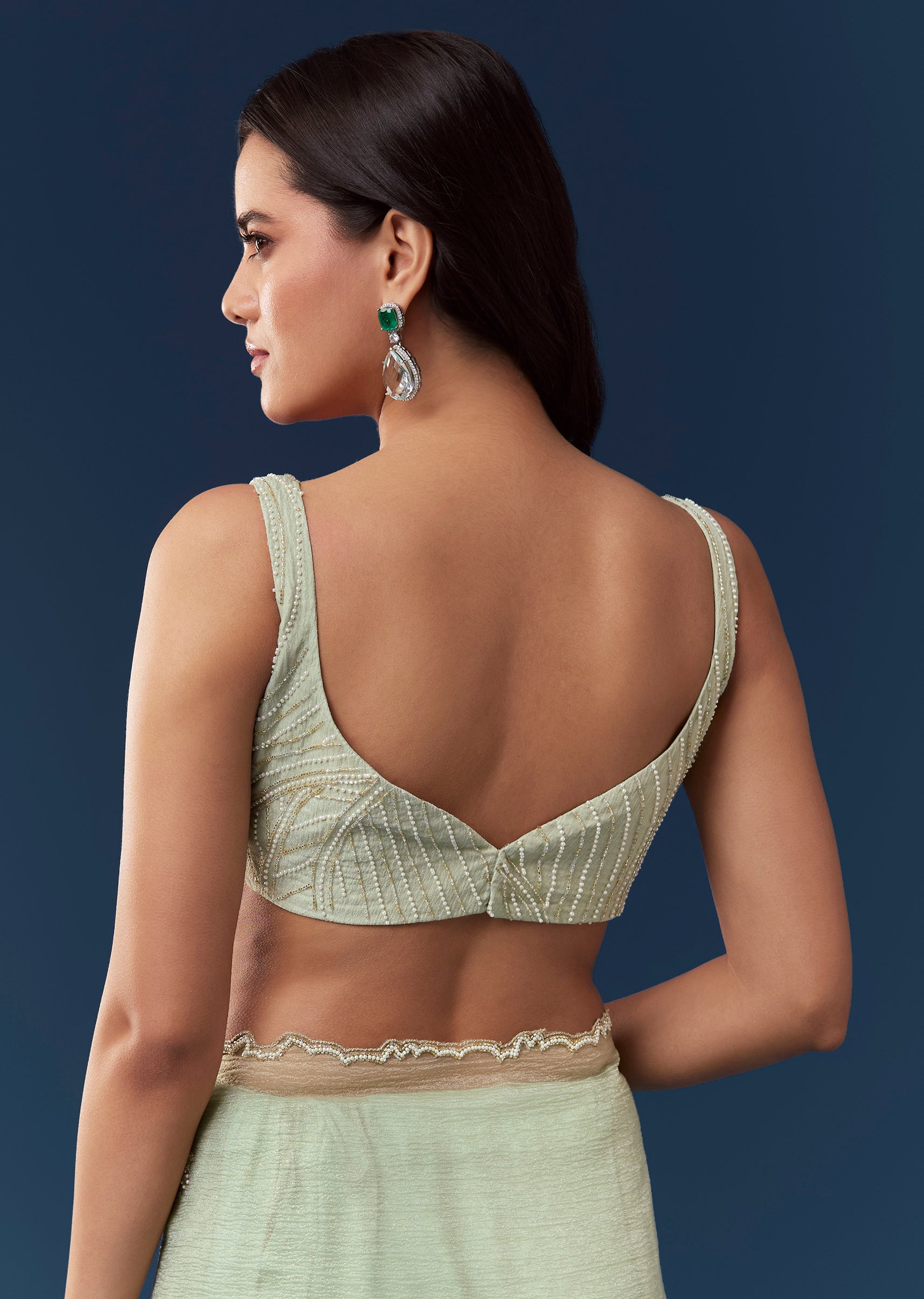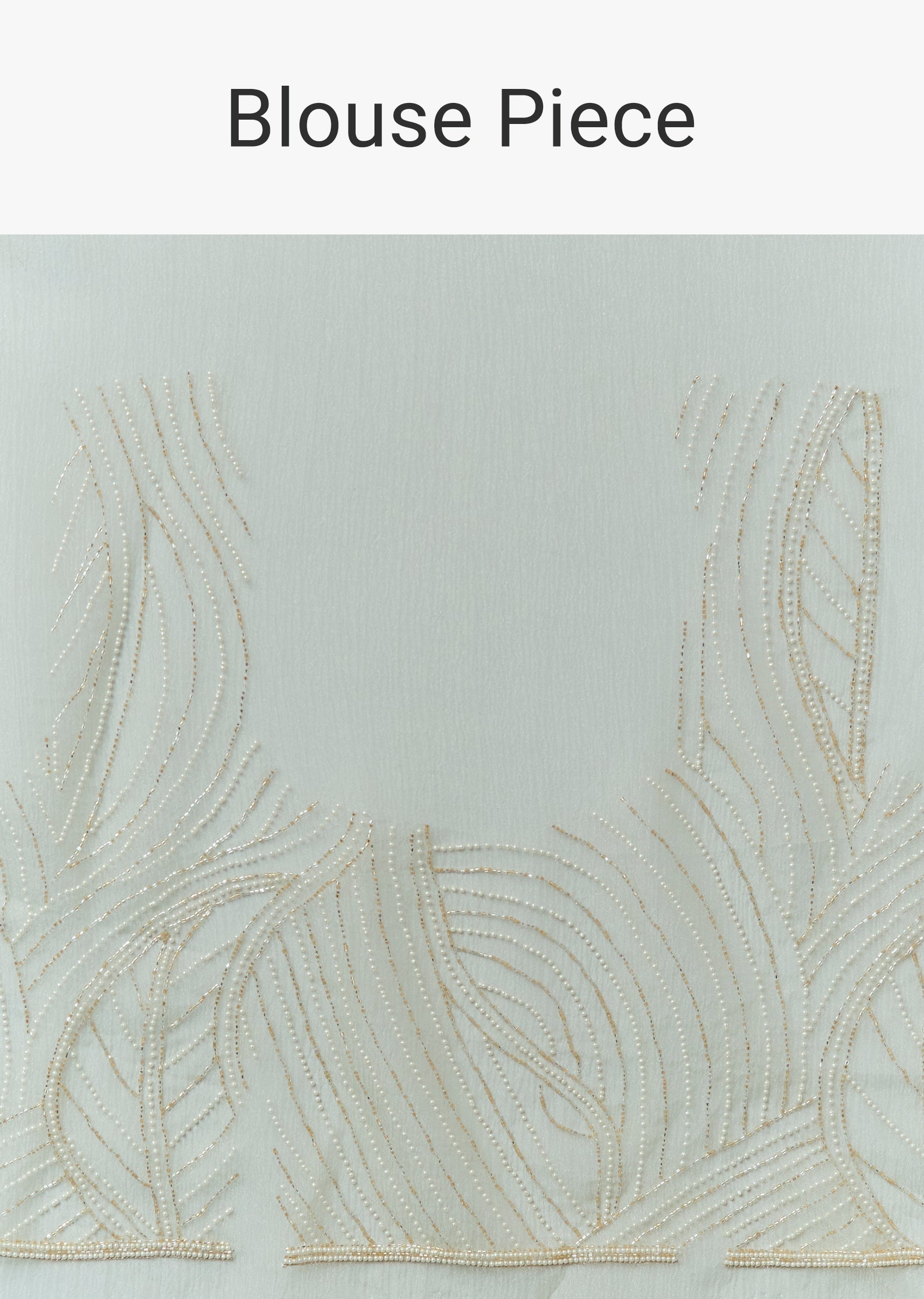 This soft mint green crush tissue saree brings pastel elegance perfect for festive occasions and wedding receptions. The saree features a delicate cutwork floral border while all over floral butti are embroidered with beads, cutdana, sequins, and resham thread work, creating a subtle shimmer and refined texture. It comes with an unstitched embroidered blouse allowing you to tailor it to your preferred style for a graceful and polished look. Awarded as the Most Trusted Brand, we're delivering styles you love, just as promised.