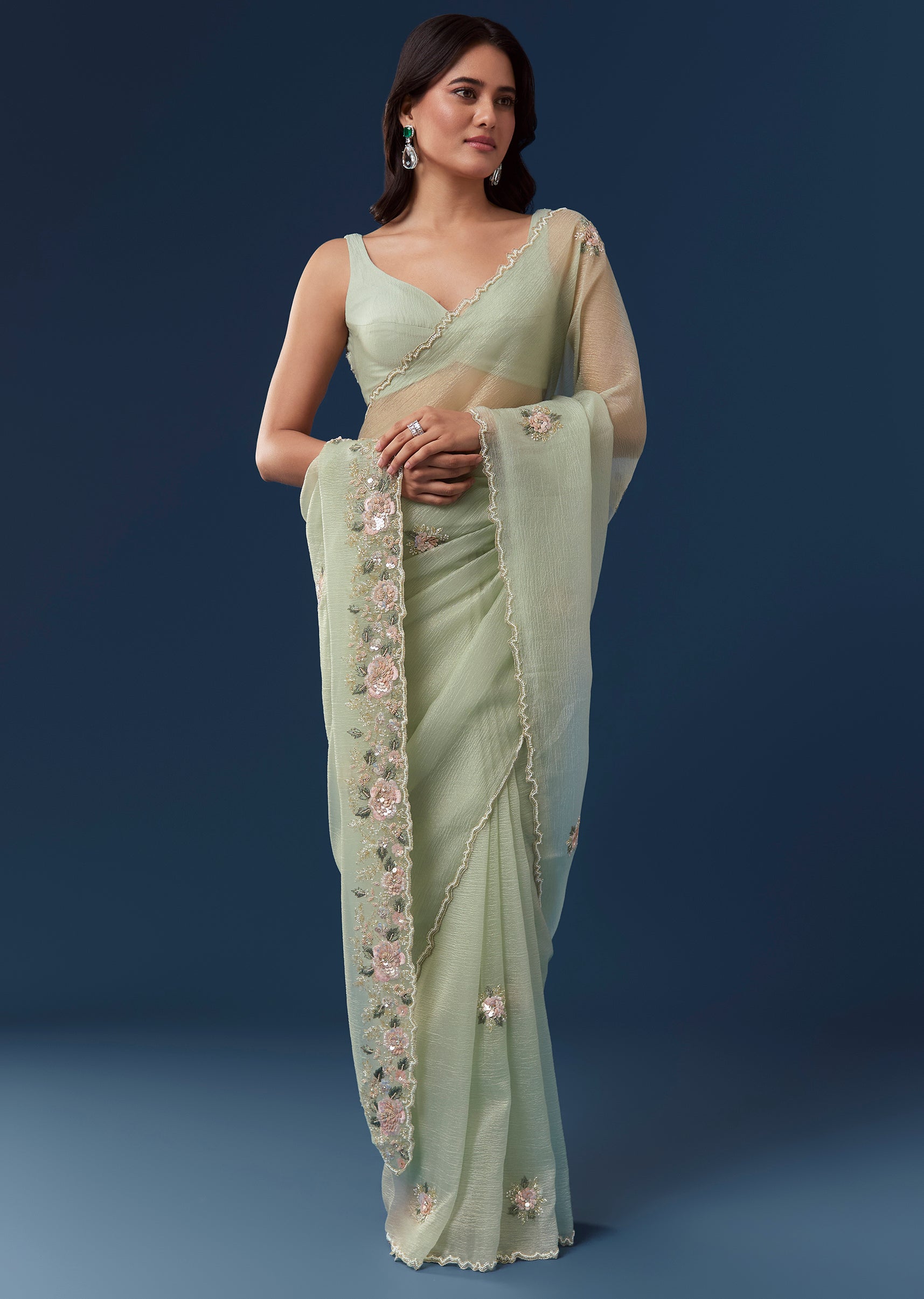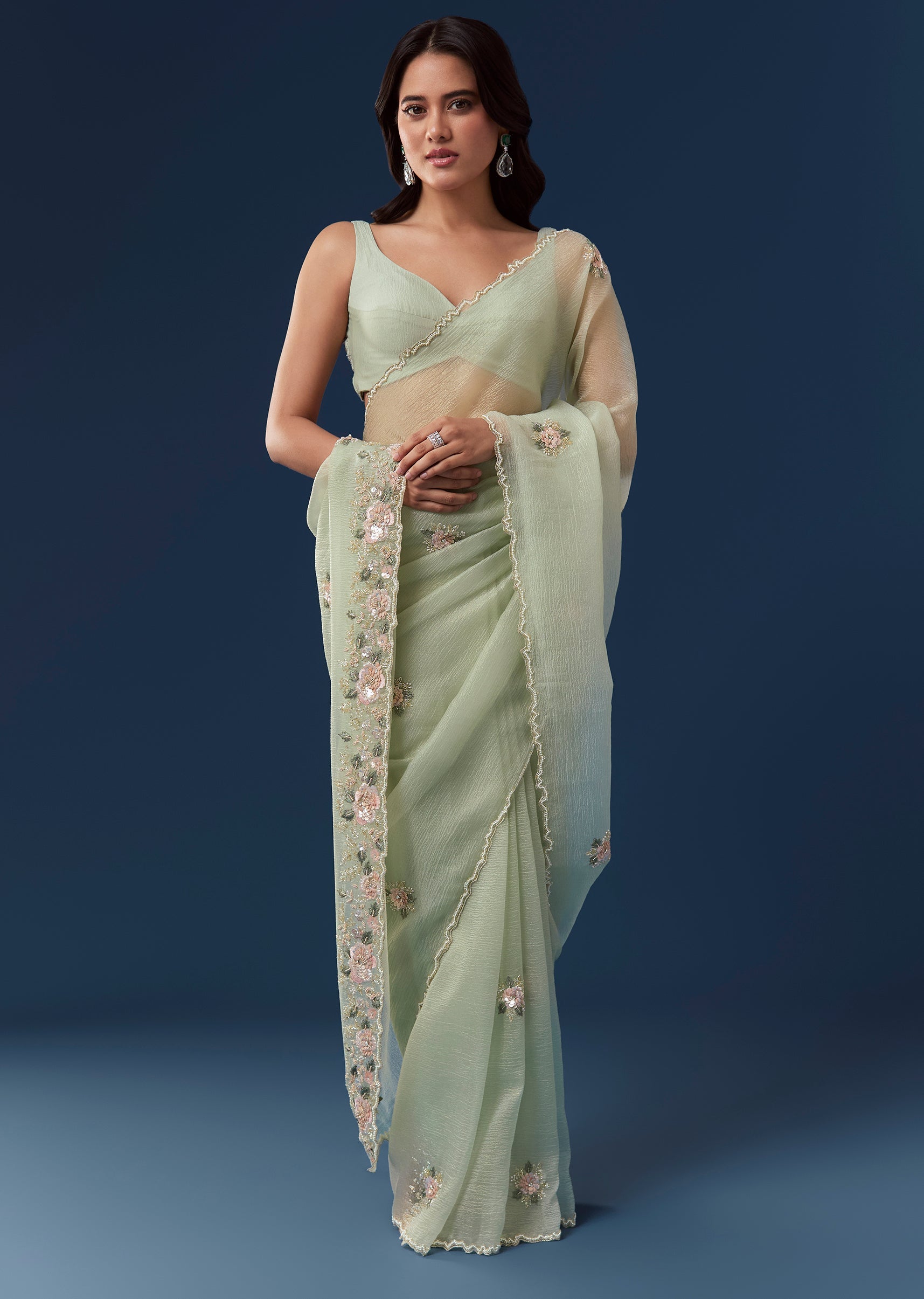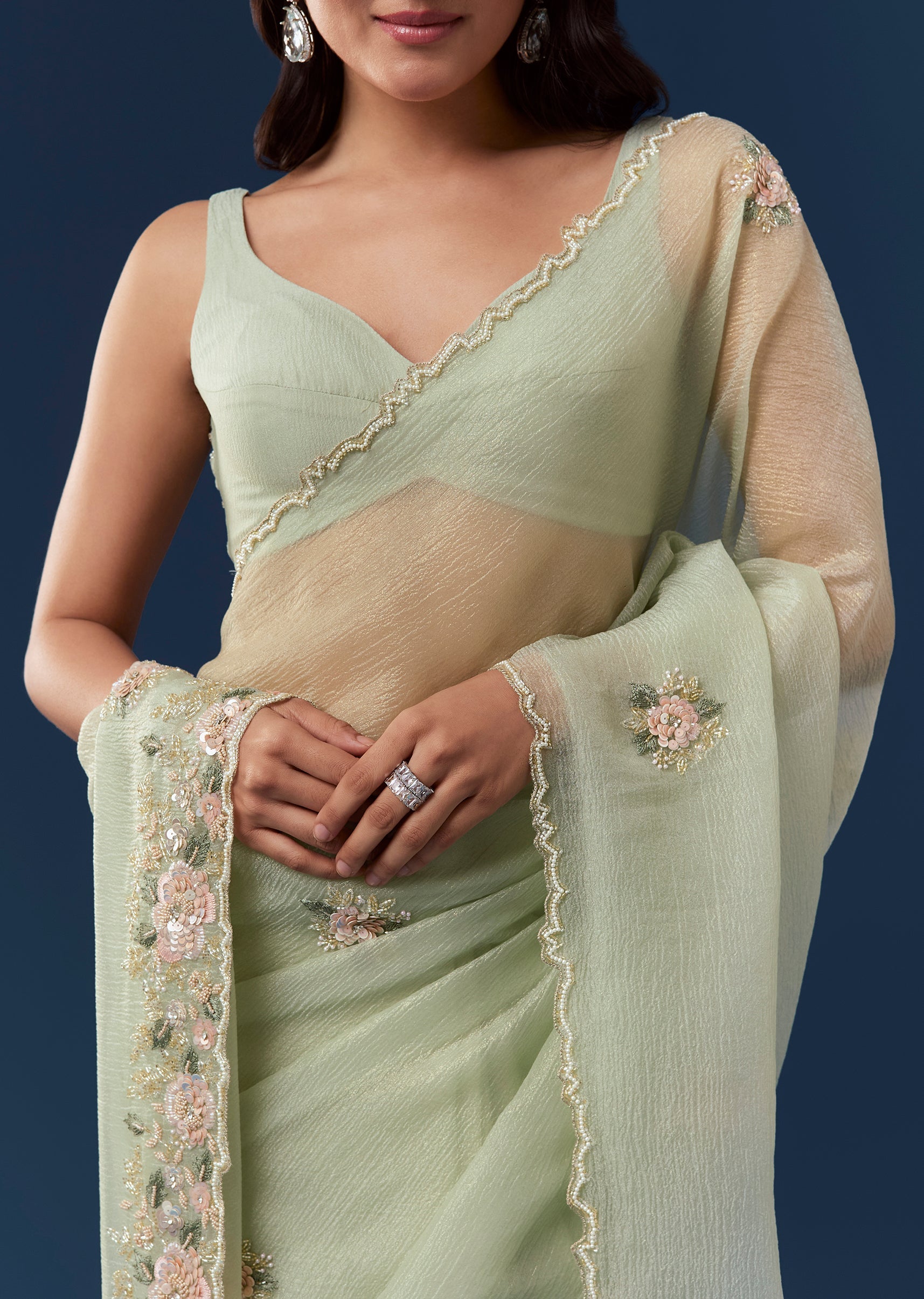 Mint Green Crush Tissue Saree With Cutwork Floral Border And Butti Embroidery