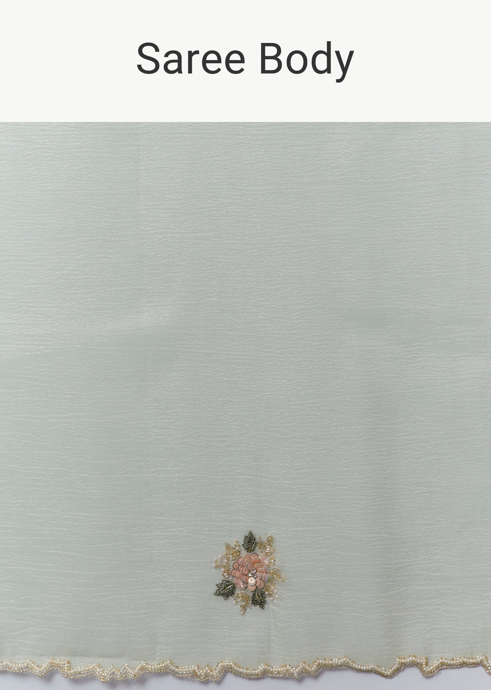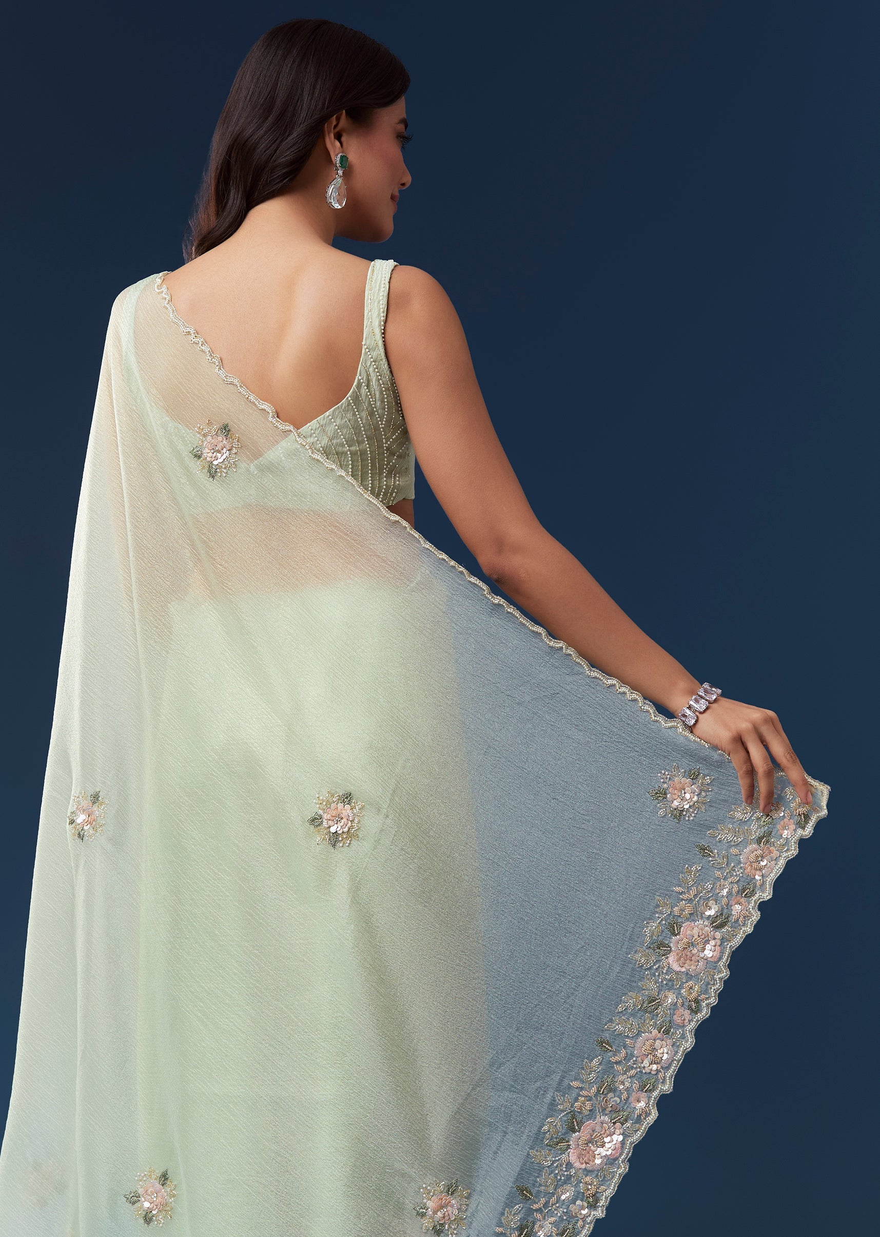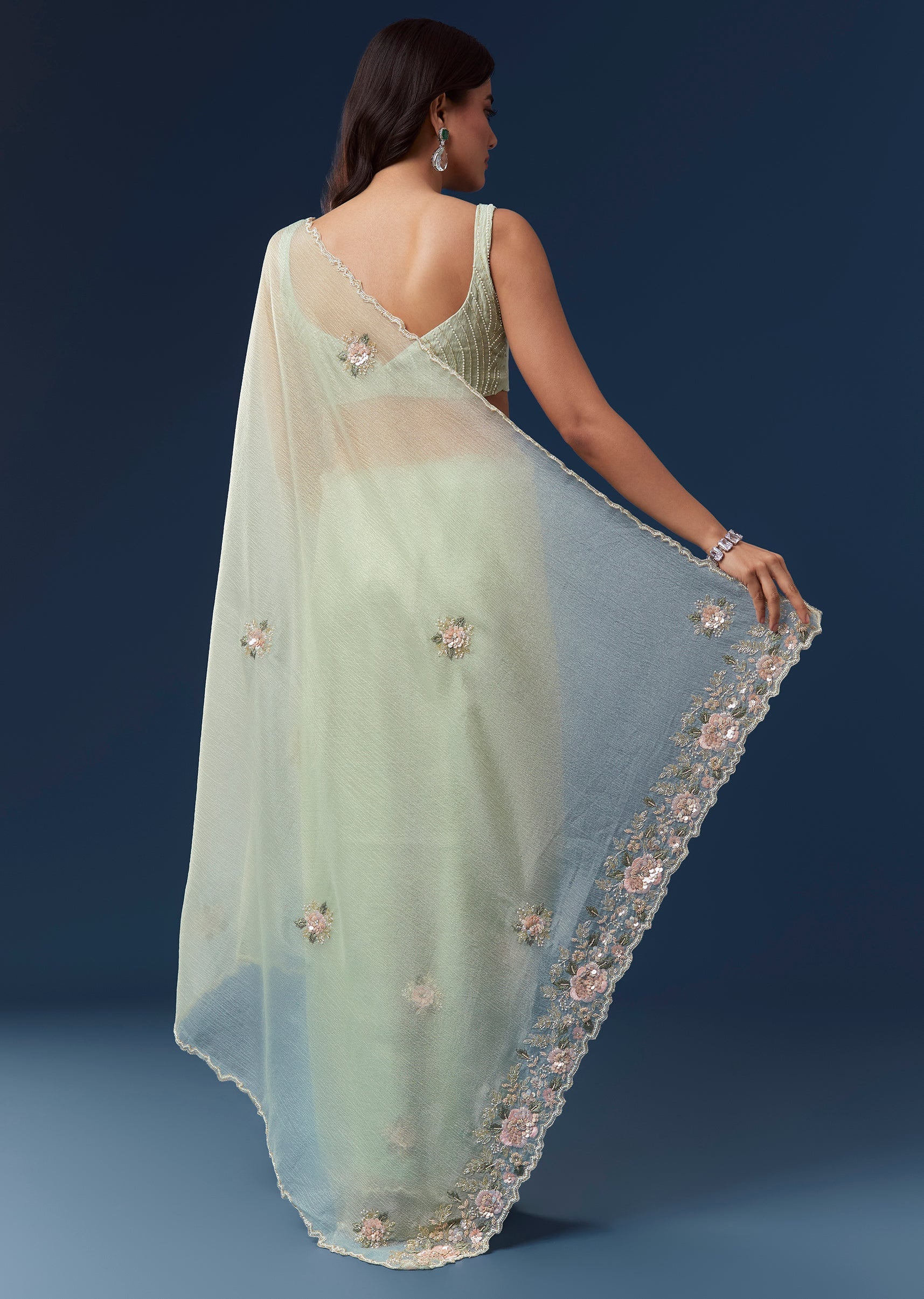 Mint Green Crush Tissue Saree With Cutwork Floral Border And Butti Embroidery