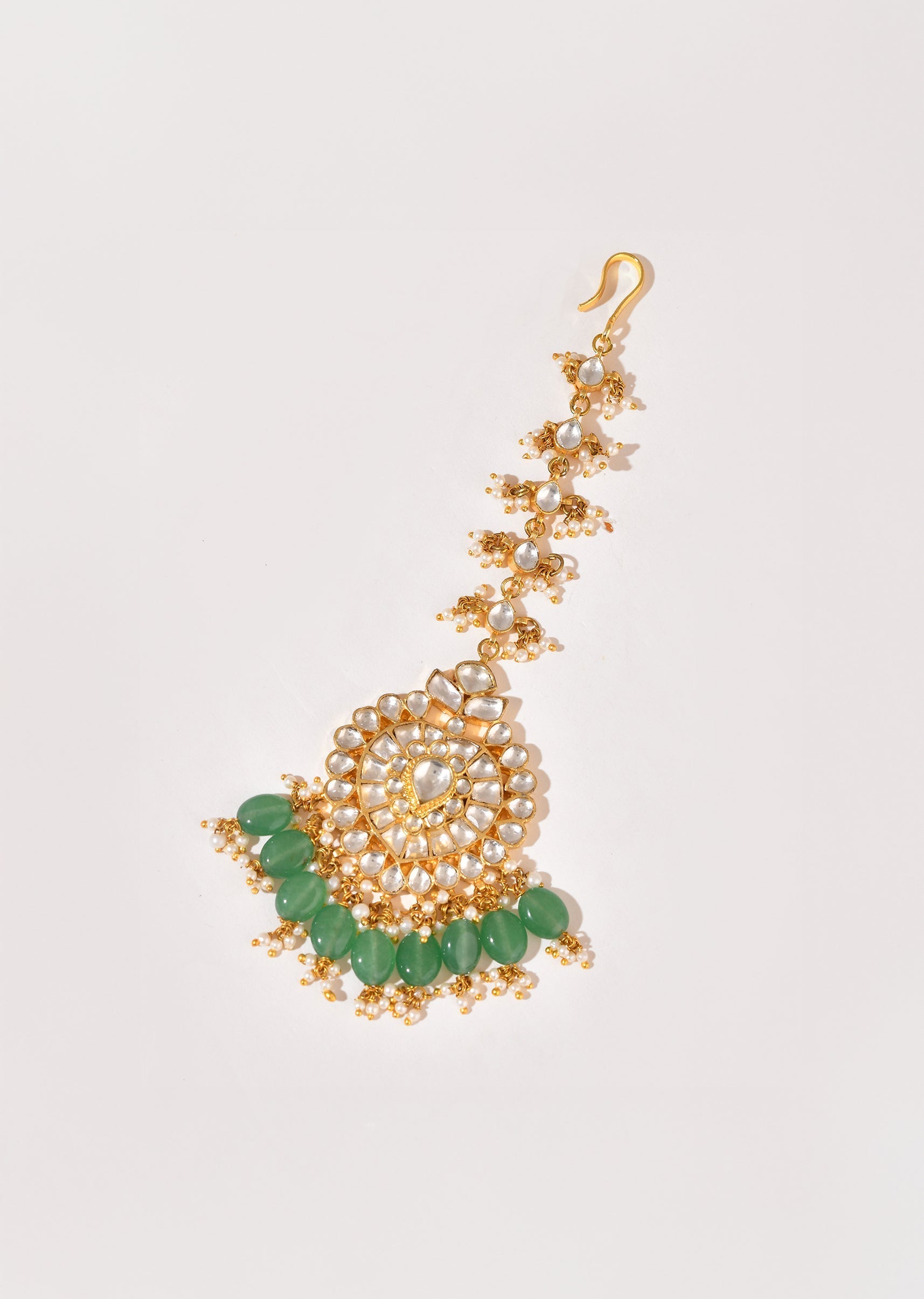This mint green kundan embellished maangtikka brings a fresh, serene glow with its pastel tones and intricate detailing. The soft mint hue adds a delicate elegance perfect for daytime weddings... More Product Details