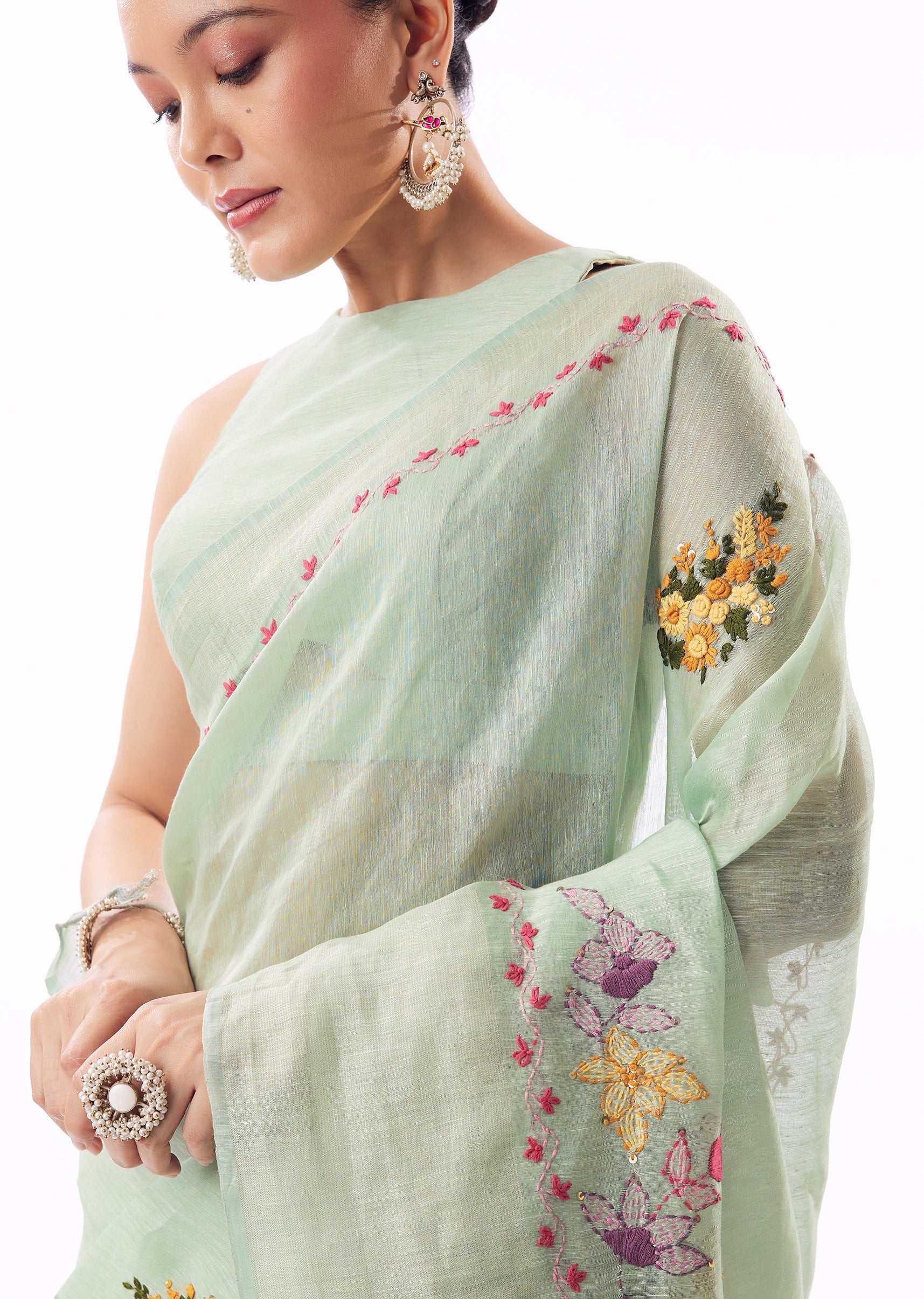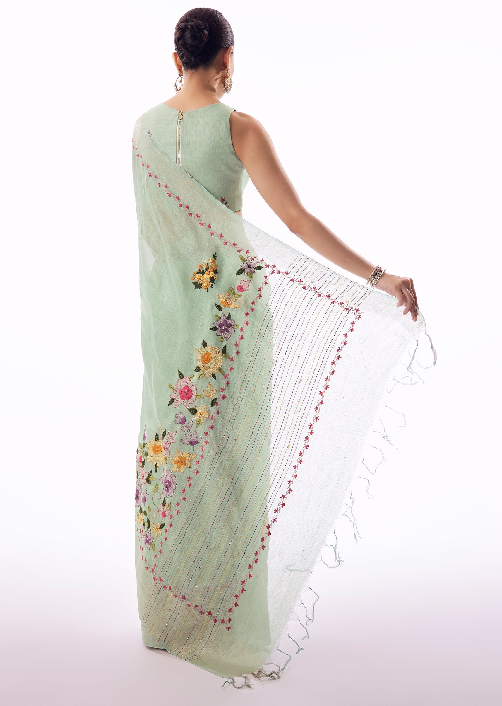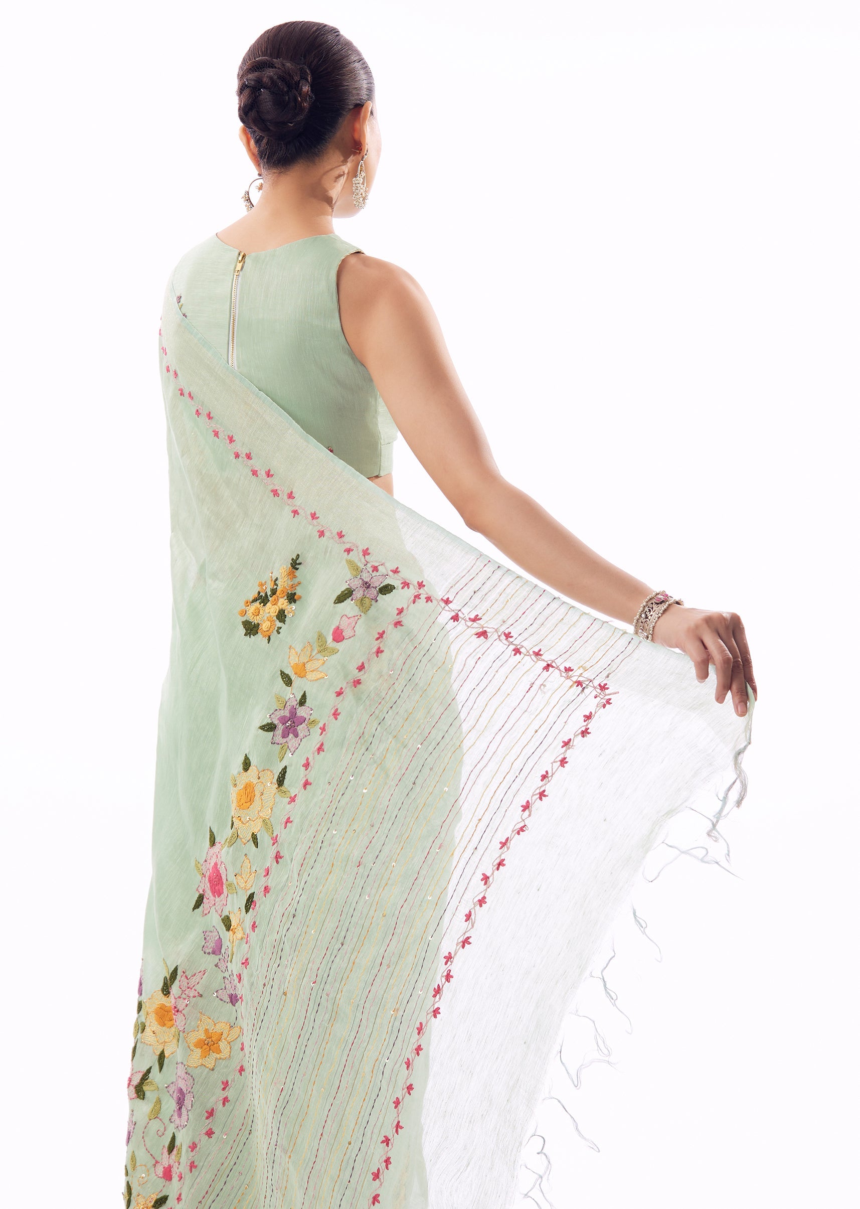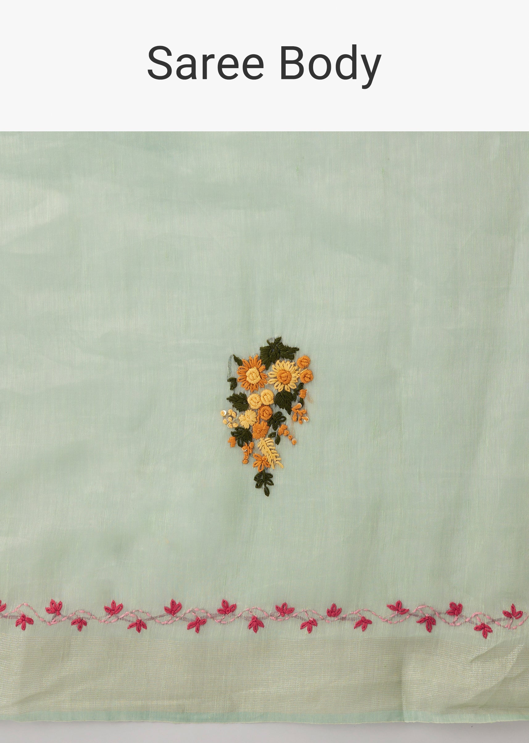 Mint Green Linen Saree With All Over Floral Resham Hand Embroidery
