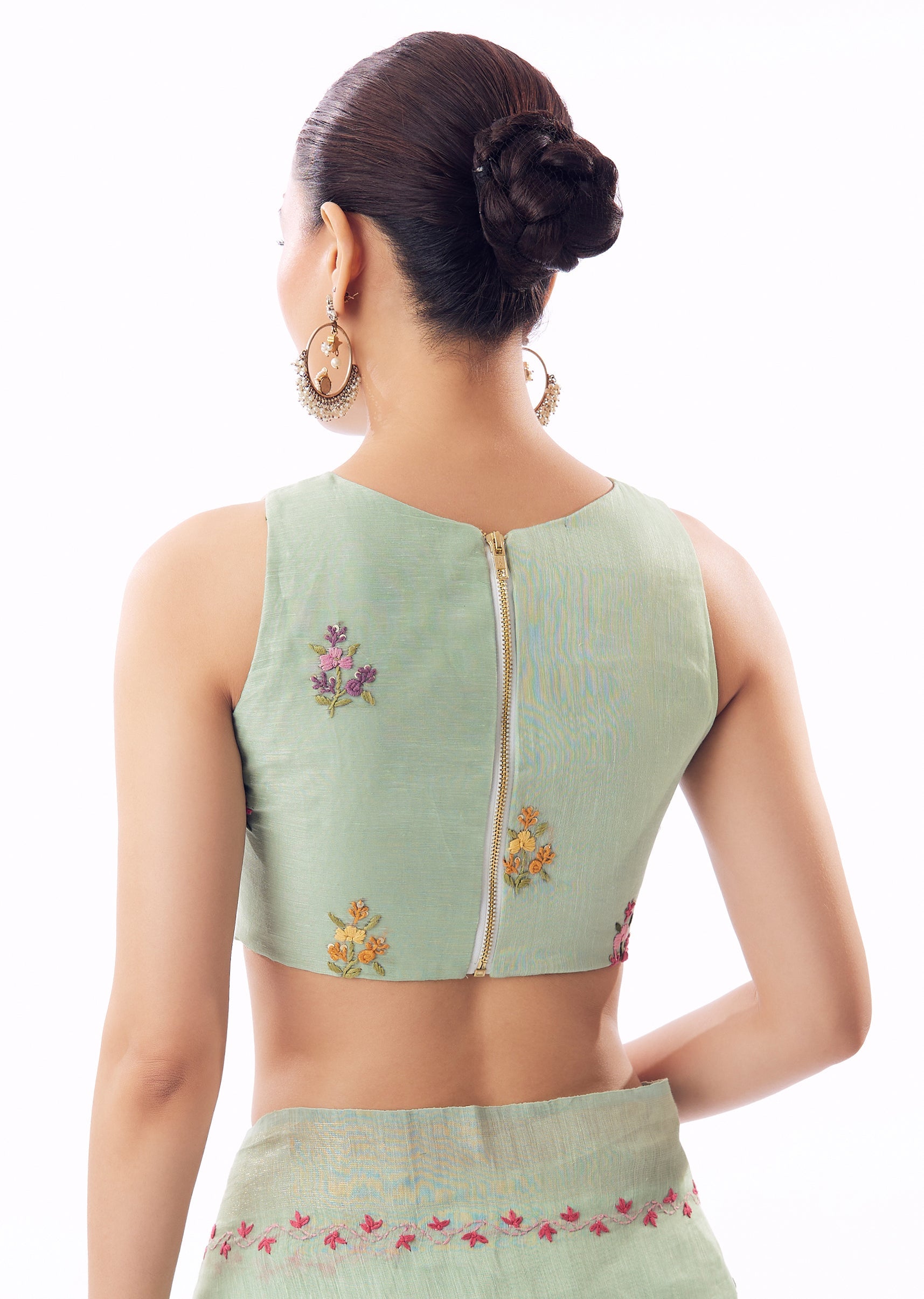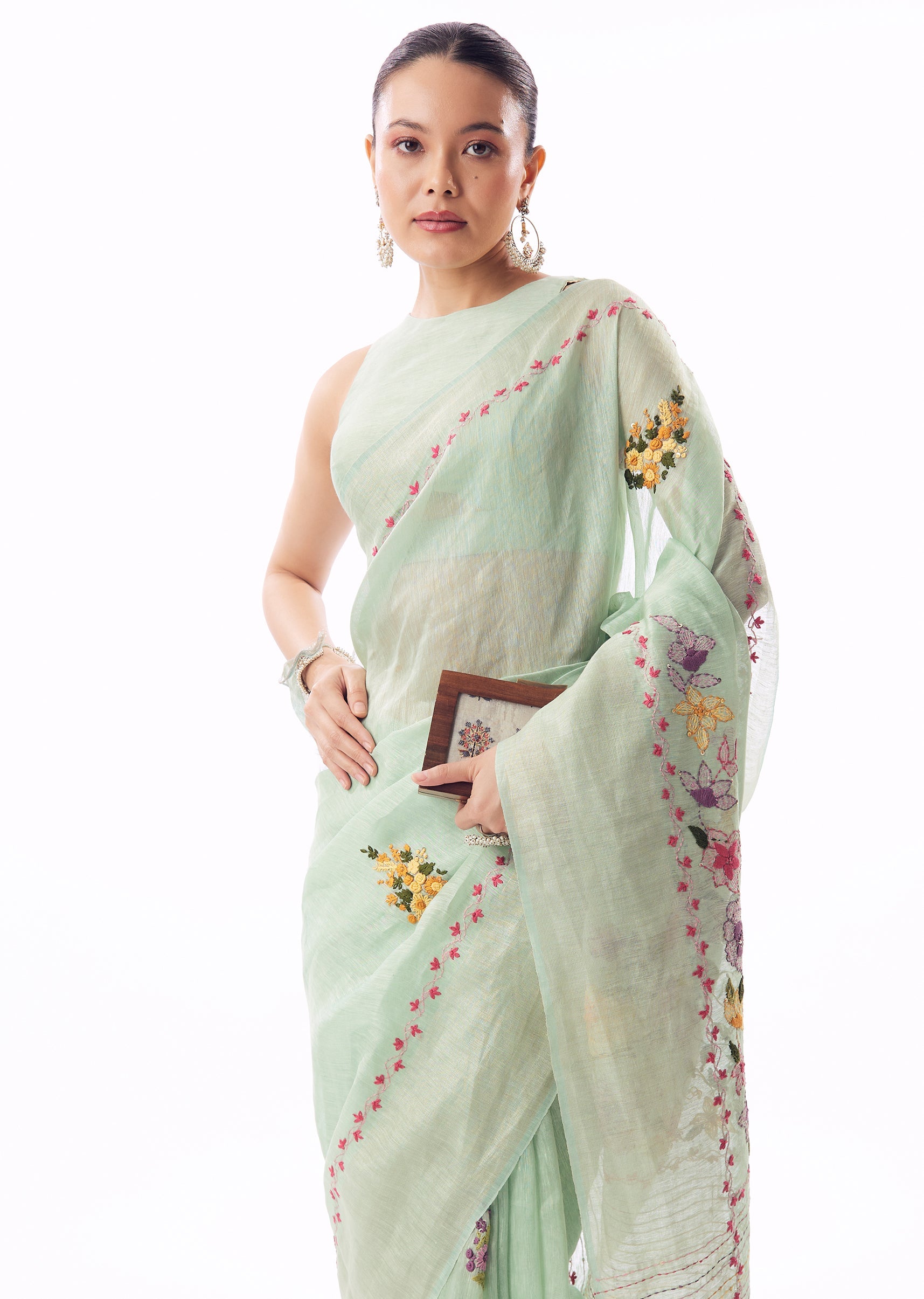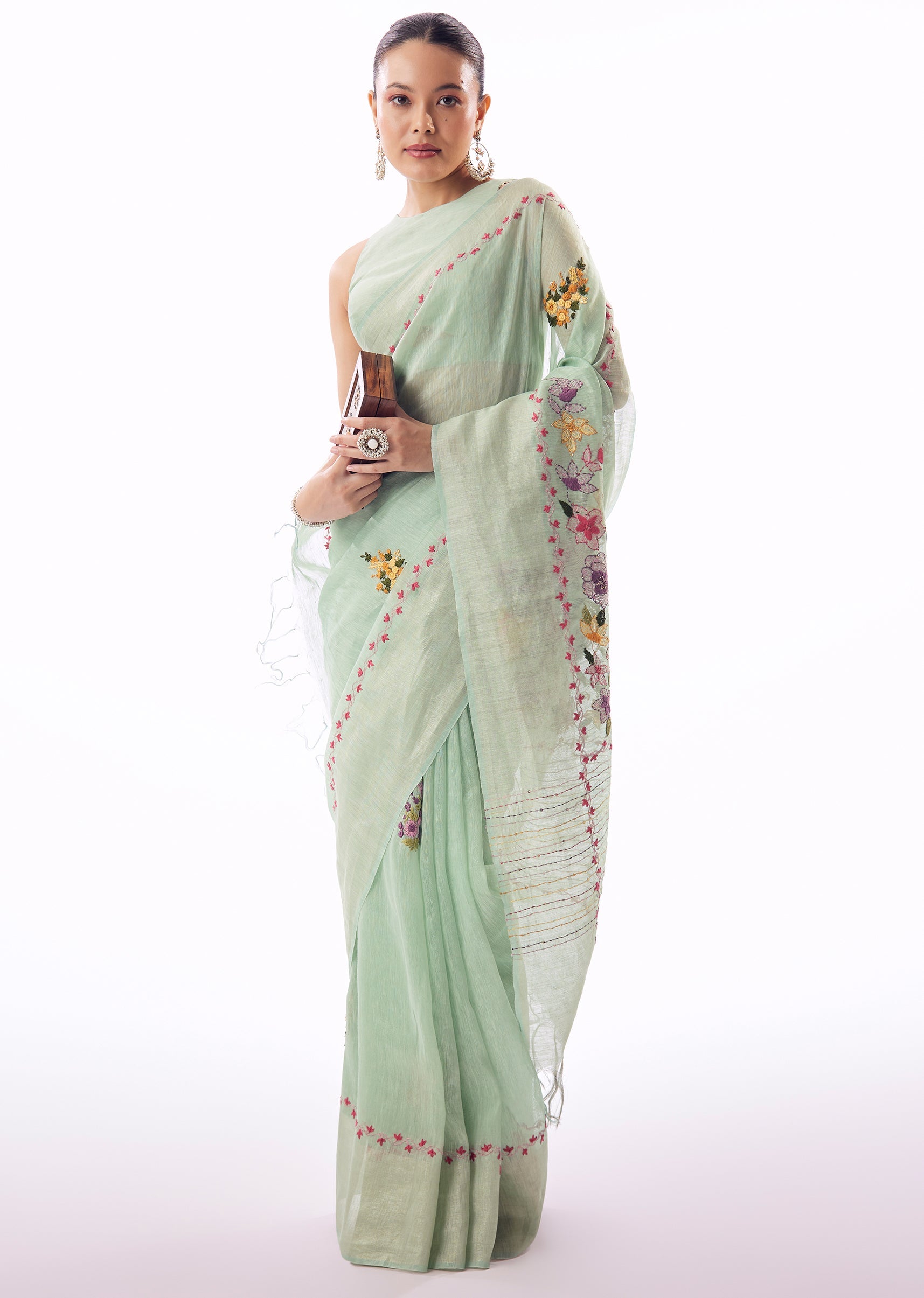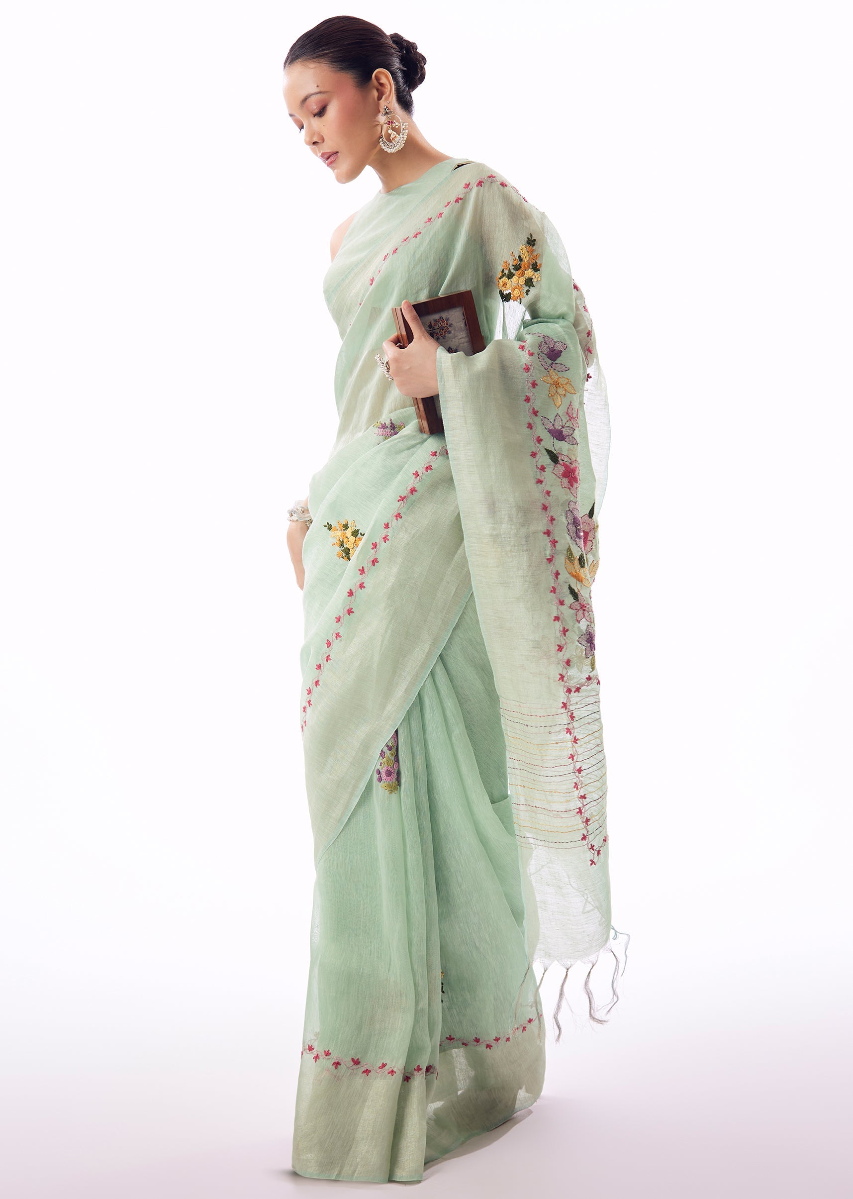 Mint Green Linen Saree With All Over Floral Resham Hand Embroidery