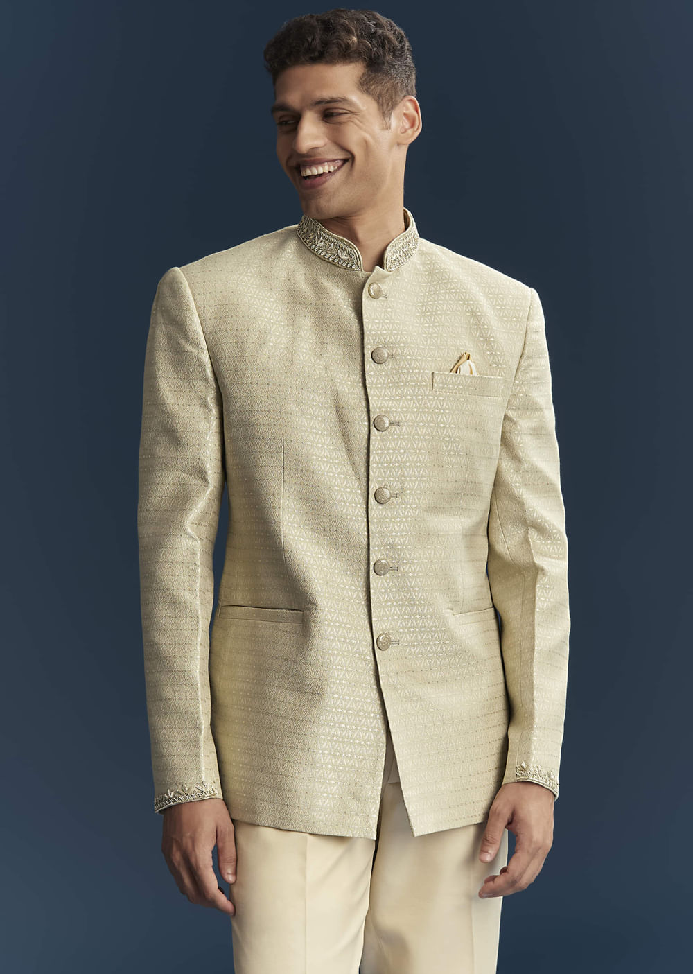 Fit Tips:The jodhpuri sits close but comfortable at the shoulders, the collar lays flat without bite, and the sleeves allow full bend so handwork shows without restriction.
